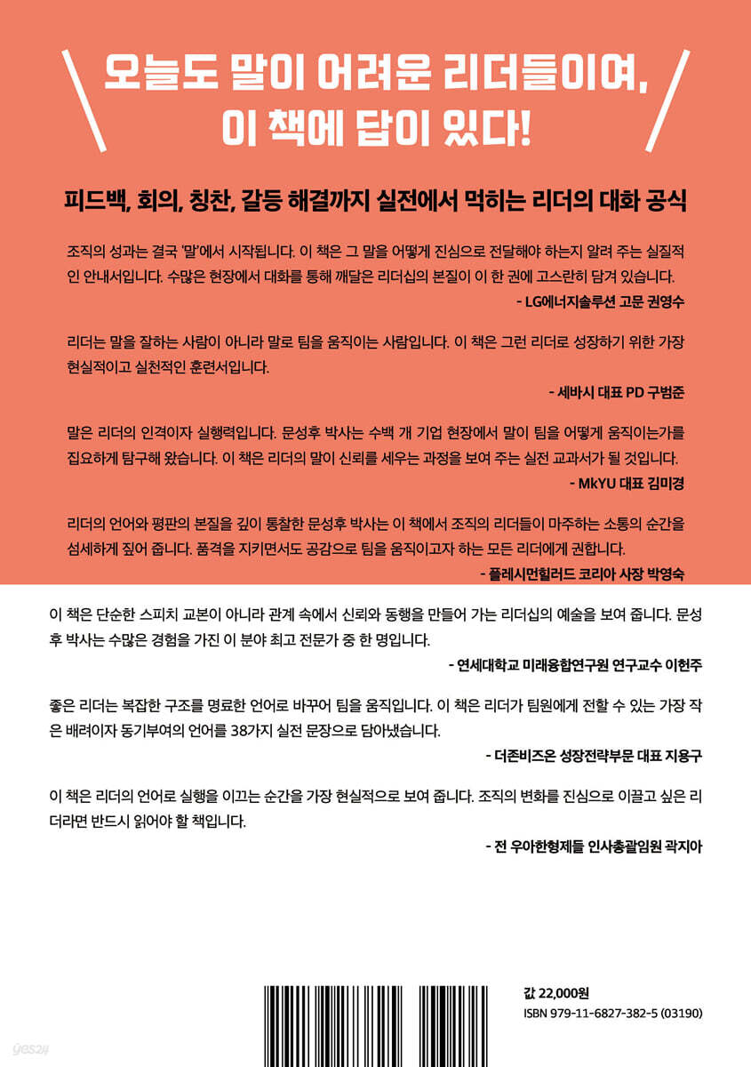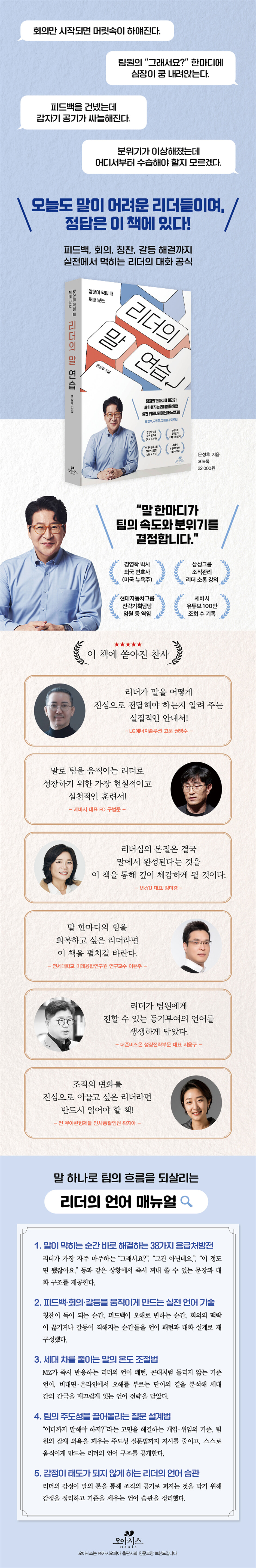 리더는 말을 잘하는 사람이 아니라 말로 팀을 움직이는 사람입니다. 이 책은 그런 리더로 성장하기 위한 가장 현실적이고 실천적인 훈련서입니다. - 구범준 (세바시 대표 PD)
