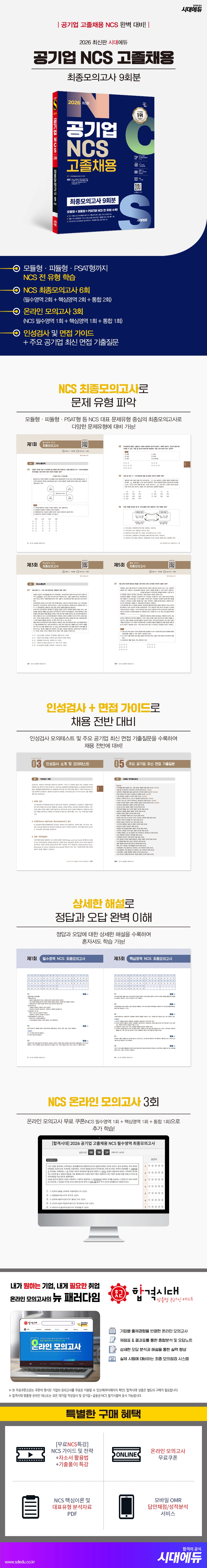 대부분의 공기업은 NCS(국가직무능력표준) 기반의 채용제도를 본격적으로 시행하면서 불필요한 스펙 대신 지원자의 직무능력을 중심으로 채용하고 있다. 추가적으로 정부는 각 공기업이 NCS를 적용하여 인재를 채용할 수 있도록 NCS 기반의 채용 도구 개발을 지원하고 채용 컨설팅을 진행하고 있다. NCS를 도입함으로써 취업준비생의 부담을 경감시키고, 능력 있는 인재라면 누구에게나 취업의 기회가 주어질 수 있도록 노력하고 있다.이처럼 NCS를 도입함에 따라 공기업의 필기시험은 직무 위주의 상황으로 주어지는 등의 변화를 보이고 있지만, 대부분의 수험생들은 NCS라는 것이 정확히 무엇인지, 어떻게 출제되고 있는지를 모르고 있으며, 단순히 시중에 있는 책 한두 권을 풀고 볼 수 있는 시험이라 생각하여 불합격이라는 고배를 마시고 있는 상황에 놓여 있다.이에 공기업 고졸채용 합격을 위해 시대에듀에서는 공기업 NCS 필기시험 문제풀이 실력 향상에 중점을 두어 『2026 최신판 시대에듀 공기업 NCS 고졸채용 최종모의고사 9회분』을 출간하였다. NCS의 대표 문제유형인 모듈형 · 피듈형 · PSAT형 등 자주 출제되는 영역 구성에 맞춰 필수영역 최종모의고사, 핵심영역 최종모의고사, 통합 최종모의고사로 구성 및 수록하여 어떤 공기업의 필기시험을 치르더라도 도움이 될 수 있도록 하였다. 또한 채용 가이드와 주요 공기업 최신 면접 기출질문을 수록하여 채용 전반을 대비할 수 있도록 하였으며, 온라인 모의고사 응시 쿠폰을 제공하여 필기시험을 준비하는 데 부족함이 없도록 하였다.
