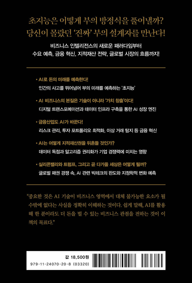 핵심 목표는 AI 기술이 어떻게 비즈니스 영역에서 대체 불가능한 요소가 될 수밖에 없는지 정확히 이해하는 것이다. 쉽게 말해, AI를 활용해 한 푼이라도 더 벌 수 있는 비즈니스 관점을 제시하려 한다. AI 비즈니스의 중심에 서고자 한다면 앞서 이야기한 초지능에 대한 믿음을 가지고 인간 스스로의 상상력 역시 더 진화하도록 해야 한다는 것이다. 다시 말해, 우리 스스로 인간이 아니라 초지능이라 생각하며 비즈니스 문제를 정의해야 한다. --- p.20 아무리 초지능이 만들어내는 성과가 뛰어나다고 하더라도 사용자인 인간이 그것을 이해했을 때만 신뢰할 수 있는 기술이 된다. AI 모델이 어떤 데이터를 어떻게 학습했는지 대략적으로라도 파악할 수 있어야 사용자인 인간도 지식을 쌓아갈 수 있다. 다시 말해, AI를 ‘이해하고 신뢰’할 때 진정한 인간 해방으로 이어진다. --- p.26 결국 AI는 초대박보다 안정적으로 평균 이상의 결과를 내는 패턴을 찾는 데 더 능숙하다. 이를 당장은 극복하기는 어렵지만 한 가지 실마리는 있다. 이상치를 탐지하고 분석하는 이상 탐지 기술은 데이터 속에서 드물게 등장하는 이상치를 포착할 수 있고, 그 이상치가 훗날 초대박 사건으로 이어질 가능성을 사전에 감지할 수도 있다. 다만 인간의 창의성에서 비롯된 완전히 새로운 콘텐츠나 아이디어는 어떠한 알고리즘으로도 완벽히 예측할 수는 없다는 점은 변하지 않는다. 그런 점에서 AI가 아무리 정교해져도 인간의 창의적 직관을 완전히 대체할 수 없다는 사실은 어쩌면 우리에게 작은 안도감을 주는 일일지도 모른다. --- p.54 다소 먼 미래의 이야기처럼 들릴 수 있지만, AI가 직접 펀드를 운용하는 시대가 도래한다면 전통적인 방식의 인간 펀드매니저를 능가할 가능성이 매우 높다. AI는 인간이 도저히 따라갈 수 없는 방 대한 데이터를 빠르게 학습하고, 복잡한 관계성을 실시간으로 파악해 인간보다 한발 앞서 투자 결정을 내릴 수 있기 때문이다. --- p.110 트럼프 행정부의 AI 중심 재편 전략과 글로벌 기술 블록화가 본격화되는 지금, 한국 역시 ‘기술 주권’과 ‘성장 기회’를 동시에 확보하기 위한 전략이 절실하다. 정부 차원에서는 AI 산업정책과 규제 정비의 속도 전환이 요구된다. 트럼프 행정부, 미국의 연방, 주 정부가 그러했듯이 AI 정책 일반법 중심에서 분야별 규제, 데이터 활용, GPU 인프라, 클라우드 접근 등 실물 기반 산업정책으로 전환해 빠른 기술 개발과 확장을 지원해야 한다. 아울러 AI 인재 유출을 차단하고, 복귀를 유인할 수 있는 프로그램도 필요할 것이다. --- p.203 AI 경쟁력은 단일 요소로 결정되지 않는다. 인프라, 모델, 서비스 세 가지 핵심 레이어가 조화를 이뤄야 한다. 인프라는 컴퓨팅 자원, 데이터 저장소, 등을 통해 AI 성능을 뒷받침한다. 모델은 데이터를 학습해 가치를 만들어내는 기술의 핵심이다. 서비스는 사용자를 만나 AI 기술이 상업적, 사회적 가치를 실현하는 단계다. 지금까지 한국 AI 지원 정책은 인프라와 모델을 육성하는 데 초점이 맞 춰져 있었으나, 세 가지 핵심 레이어 중 하나라도 부족하면 글로벌 시장에서 AI 경쟁력을 확보하기 어렵다. --- p.229 |