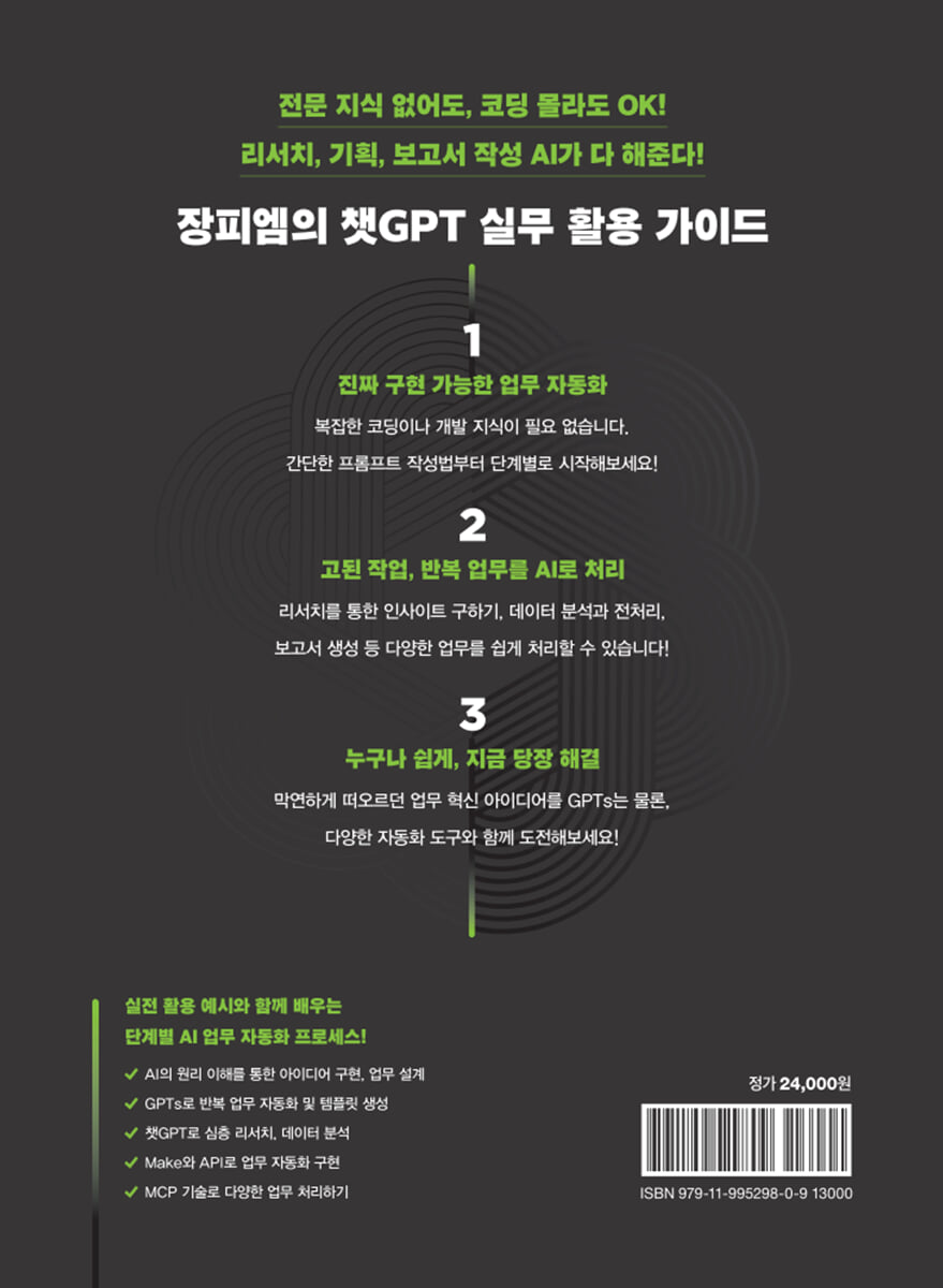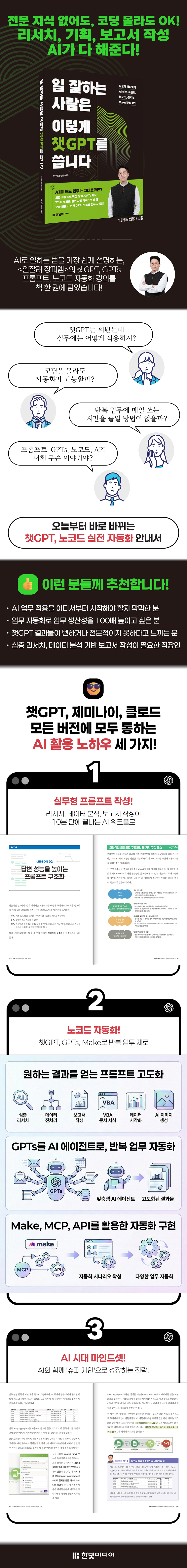 _CHAPTER 01 | 누구나 쓸 수 있는 기술, AI가 바꾸는 세상 __LESSON 01 | 누구나 기술을 쓸 수 있는 시대 ___기술의 민주화란 무엇인가 ___기술의 민주화가 가져온 변화 ___AI가 일으키는 변화의 물결 __LESSON 02 | AI가 세상을 바꾸고 있다 ___ChatGPT가 불러온 변화 ___범용 AI의 강력함 ___직장인들이 느끼는 어려움 ___실무 활용의 첫걸음 _CHAPTER 02 | AI와 노코드, 어떻게 배우면 좋을까 __LESSON 01 | AI와 노코드를 함께 배워야 하는 이유 ___AI 발전과 노코드 ___AI 기반 업무 자동화 __LESSON 02 | 코딩 없이도 프로그래밍하는 시대 ___바이브 코딩과 노코드의 등장 ___노코드의 진정한 의미 __LESSON 03 | AI, 어떻게 학습할 것인가? ___AI 시대, 빠른 변화에 따른 불안감 ___AI는 도구일 뿐, 중심은 인간의 역량 ___귀납적 학습이 더 적합한 이유 ___반복 업무 자동화부터 시작하기 PART 02 ChatGPT 실무 활용 가이드 _CHAPTER 01 | ChatGPT, 제대로 써먹는 법 __LESSON 01 | 프롬프트, 어떻게 써야 할까 ___프롬프트란 무엇인가 ___ChatGPT가 내 말을 이해하는 방식, 토큰 ___토큰 스트림이란? ___프롬프트 작성 시 주의사항 __LESSON 02 | 답변 성능을 높이는 프롬프트 구조화 ___효과적인 프롬프트 구조화의 네 가지 구성 요소 ___마크다운을 활용한 프롬프트 형식 구조화 ___프롬프트 확장 도구 활용하기 ___피드백을 통한 프롬프트 개선 ___구조화된 프롬프트로 내 의도에 맞는 결과 만들기 __LESSON 03 | 참고 자료로 답변 품질 높이기 ___답변의 구체성과 신뢰도를 높이는 참고 자료 제공 ___업무에 맞는 참고 자료를 선별하여 제공하는 방법 ___부동산 참고 자료 제공 활용 사례 __LESSON 04 | 단계적 프롬프팅으로 전문적인 문제 다루기 ___생각의 사슬 ___단계적 프롬프팅 방법 ___시장 분석 업무, 단계적 프롬프팅 활용 사례 __LESSON 05 | 프롬프트 엔지니어링의 진짜 의미 ___ChatGPT와 커뮤니케이션하는 방법 ___도구를 넘어 동료로, 지시를 넘어 협력으로 _CHAPTER 02 | 업무 능력 10배 상승, ChatGPT 실무 활용 사례 __LESSON 01 | 심층 리서치 활용하기 ___심층 리서치란 무엇인가 ___심층 리서치 도구 비교 ___효과적인 심층 리서치 수행 방법 ___다양한 심층 리서치 도구 통합 활용하기 __LESSON 02 | 데이터 분석하고 인사이트 도출하기 ___데이터 분석 기능과 전처리 ___데이터 정리 작업에 ChatGPT 활용하기 ___단계적 프롬프팅과 다차원적 분석 ___체계적 보고서 작성과 실용적 활용 __LESSON 03 | 회사 양식에 맞는 보고서 작성하기 ___루틴한 보고서와 심층 보고서 ___우리 회사 양식에 맞는 루틴한 보고서 작성 ___전문적이고 심층적인 신규 사업 계획서 작성 __LESSON 04 | VBA로 문서 서식 적용하기 ___VBA 코드를 활용한 서식 자동화 ___VBA 코드를 생성하는 실용 팁 __LESSON 05 | 데이터 시각화하고 발표 자료 만들기 - 차트/다이어그램/PPT ___다양한 데이터를 시각화하는 방법 ___ChatGPT로 시각화 보고서 생성하기 ___Gemini와 Claude로 시각화 보고서 생성하기 ___Napkin으로 차트와 다이어그램 생성하기 ___Genspark로 PPT 슬라이드 생성하기 __LESSON 06 | AI로 이미지 생성하기 ___AI 이미지 생성을 배워야 하는 이유 ___ChatGPT 이미지 생성의 강력한 기능 ___이미지를 생성하는 구체적인 지시 팁 ___저작권과 초상권 관련 팁 _CHAPTER 03 | 고단한 반복 업무 GPTs로 자동화하기 __LESSON 01 | AI 에이전트와 GPTs ___AI 에이전트란 무엇인가 ___GPTs로 AI 에이전트 시작하기 ___GPTs 활용의 진정한 가치 ___GPTs를 만드는 방법 ___GPTs 테스트와 배포 __LESSON 02 | 반복적인 보고서 작성 자동화하기 ___자동화할 대상 업무 선정하기 ___보고서 작성 자동화의 핵심 ___반복적인 데이터 취합 자동화하기 __LESSON 03 | 단계적 절차로 고도화된 결과물 만들기 ___GPTs로 고도화된 결과물 만들기 ___페이즈 기반 주간 보고서 작성 GPTs 설계하기 PART 03 AI와 노코드로 시작하는 업무 자동화 실전 사례 _CHAPTER 01 | 노코드로 AI를 자동화의 엔진으로 만들기 __LESSON 01 | AI가 여는 업무 자동화의 새로운 지평 ___AI 기반 자동화란 무엇인가 ___AI가 일으킨 자동화의 변혁 ___자동화의 핵심, API 개념 이해하기 ___AI 업무 자동화의 걸림돌 ___자동화의 첫걸음은 걸림돌 파악부터 __LESSON 02 | 어떤 일을 자동화할 수 있을까 ___자동화할 수 있는 업무 찾기 ___데이터 기록과 정리, 이제 AI에게 맡긴다 ___콘텐츠도 고객 관리도, AI가 바꾸는 마케팅 업무 ___데이터 수집부터 분석까지, AI로 자동화 ___반복적인 보고서 작성, 이제는 자동으로 __LESSON 03 | 노코드 자동화 도구 톺아보기 : Make, Zapier, n8n ___어떤 자동화 도구가 내게 맞을까 ___도구별 비교 분석 ___자유도와 난이도의 균형 ___도구 선택 기준 ___자동화 도구의 미래 _CHAPTER 02 | 내 업무에 바로 적용하는 AI 자동화 __LESSON 01 | 노코드 자동화 도구 Make 기본 개념 익히기 ___Make의 작업 개념 이해하기 ___Make 핵심 용어 살펴보기 ___Make 시나리오 만들기 ___인풋과 아웃풋 개념 이해하기 __LESSON 02 | Make 자동화 시나리오에 AI 적용하기 ___기본 자동화 시나리오 구성하기 ___ChatGPT 모듈로 시나리오 고도화하기 ___답변 처리 과정 세분화하기 ___완성된 시나리오 확인하기 __LESSON 03 | Make의 자료형, 함수, 흐름 제어 ___자료형과 함수 이해하기 ___Make의 복잡한 데이터 처리 이해하기 ___발주 신청 자동화 구상