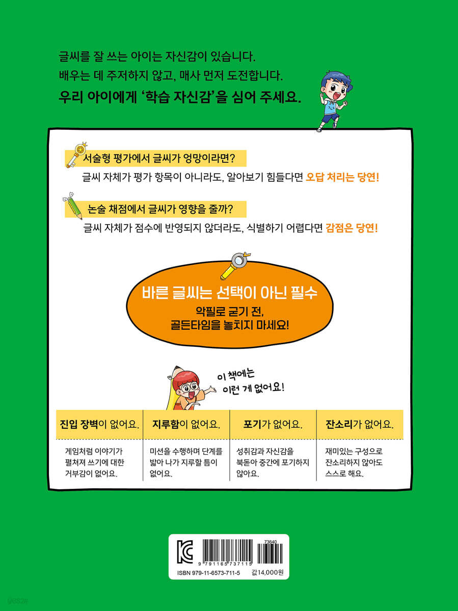 2일 기본 능력부터 키워라 / 선을 정확하게 그리기…16 3일 상자를 열어 반짝반짝 마법 연필을 가져라 / 자음을 바르게 쓰기…20 4일 어디서나 마법 연습장을 손에 넣어라 / 모음을 바르게 쓰기…26 5일 시험지를 풀어 암호를 알아내라 / 자음과 모음을 합쳐 단어 쓰기…32 6일 어서 와, 지옥 훈련은 처음이지? / 받침 없는 단어 쓰기…36 7일 지옥 훈련을 견뎌라! / 받침 있는 단어 쓰기…40 8일 동굴을 무사히 탈출하라! / 겹받침 단어 쓰기…44 9일 흩어진 쇳조각을 완성하라 / 문장 따라 쓰기…48 10일 방패를 고쳐 화살 비를 막아라 / 문장 부호와 띄어쓰기…52 11일 알파벳 암호를 완성하라 / 알파벳 바르게 쓰기…56 12일 미로 공원을 탈출하는 지도를 얻어라 / 숫자와 기호 바르게 쓰기…60 13일 글씨 왕국의 역사를 따라 써라 / 긴 문장 따라 쓰기…64 14일 대마왕에게 보낼 도전장을 완성하라 / 한 문단 따라 쓰기…68 15일 도서관에서 특별 아이템을 얻어라 / 문장 고쳐쓰기…72 16일 몬스터 집사가 낸 미션을 통과하라 / 일기 따라 쓰기…76 17일 빛나는 연필로 도움을 요청하라 / 편지 따라 쓰기…80 18일 대마왕이 만든 함정에서 탈출하라 / 글씨 명언 쓰기…84 19일 의지를 밝히고 대마왕을 마주하라 / 의지 문장 따라 쓰기…88 20일 최종 결투! 대마왕의 질문에 답하라 / 나의 다짐 완성하기…92 부록 글씨 더 쓰기 도전!…96 |