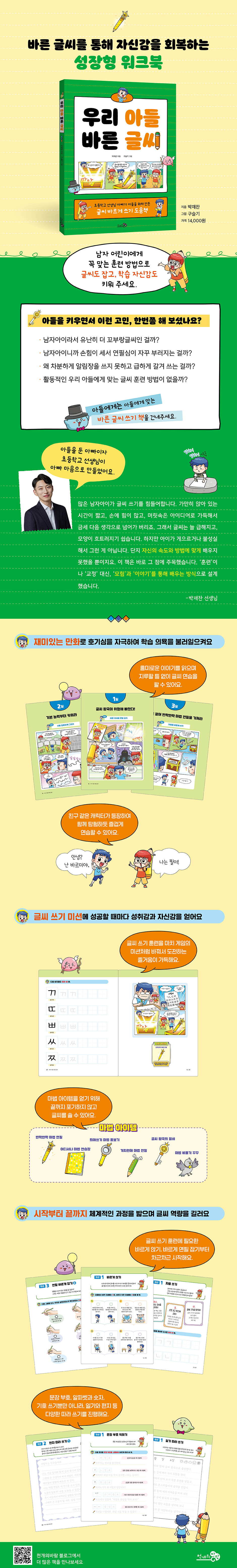 박재찬 선생님은 문해력 신장을 위해 학교 현장뿐만 아니라 다양한 분야에서 활동하며, 교사와 학부모를 대상으로 글쓰기 지도법을 강의하는 분이에요. 또한 7살 아들을 둔 아버지로 글씨를 바르게 쓰고 싶어 하는 아들을 보며, 선생님이자 아빠로서 모든 아들들에게 도움을 주고자 이 책을 만들었어요. 글씨를 바르게 쓰는 데 자신이 없어 주눅이 들어 있는 모든 아들들이 어떻게 하면 글씨 자신감을 갖고 즐겁게 글씨 쓰기 연습을 할 수 있을지 고민했어요. 남자아이들의 속도와 방법을 연구했고, 실제로 글씨 쓰기 훈련이 가능한 학습 과정을 마련했어요. 그래서 이 책은 단순히 글씨를 잘 쓰게 하는 훈련용 교재가 아니에요. 아이의 마음을 먼저 다독이고, 글씨를 통해 자신감을 회복하게 하는 성장형 워크북이지요. “하지만 괜찮아. 정말 괜찮아. 그건 너만 그런 게 아니야. 많은 친구가 글씨를 바르게 쓰는 걸 어려워해. 특히 남자 친구들은 손힘이 세서 연필이 잘 미끄러지고, 빨리 쓰고 싶은 마음이 앞서서 금세 글씨가 삐뚤어지기도 하지. 그건 잘못된 게 아니야. 그만큼 네가 에너지가 많고, 움직이는 걸 좋아한다는 뜻이니까.” -박재찬 선생님 ▶ 재미있는 만화로 호기심을 자극하여 학습 의욕을 불러일으켜요. 아이들은 이야기를 좋아해요. 특히 만화로 전개되는 이야기에 높은 집중력을 보이며 빠져들지요. 이 책에는 ‘글씨 왕국’이라는 판타지 세계가 펼쳐지고, 아이들은 주인공 바르미와 함께 때로는 대마왕의 함정에 빠지기도 하고, 몬스터의 공격을 물리치기도 하며 재미있는 모험의 세계로 들어가요. 흥미로운 만화를 읽으며 학습에 대한 거부감 없이 글씨 훈련을 할 수 있지요. 아이들은 마치 게임을 하듯 책에 집중하며, 억지로 시키지 않아도 스스로 학습할 수 있어요. 글씨 왕국을 구하기 위해 바르미와 함께 직선을 긋고, 자음을 쓰고, 문장을 쓰는 등 글씨 쓰기를 재미있게 연습하다 보면 어느새 아이들의 글씨는 반듯해지고 손힘도 조절되면서 글씨 쓰는 시간이 즐거워질 수 있어요. ▶ 글씨 쓰기 훈련을 미션 수행으로 바꿔 성취감과 자신감을 북돋아요. 지루하게 반복되는 글씨 쓰기 활동은 아이들이 끝까지 해내지 못하게 만드는 주요 원인이에요. 큰맘 먹고 연필을 잡은 아이들도 한자리에 앉아서 계속 같은 글자를 반복해서 쓰다 보면 이내 의지가 약해질 수밖에 없어요. 이 책은 글씨 쓰기 훈련을 마치 게임의 미션 수행처럼 바꿨어요. 아이들은 각 단계별 글씨 쓰기 과정에서 요구하는 미션을 성공적으로 마치기 위해 스스로 의지를 다지며 노력할 수 있어요. 미션을 성공시키면 느끼는 성취감과 자신감을 통해 중간에 포기하지 않고 끝까지 학습을 마칠 수 있어요. 진짜 실력은 스스로 끝까지 해내는 데서 오는 성장이지요. 이 책을 다 마칠 때쯤에는 아이들의 글씨가 바를 뿐만 아니라, 스스로 해냈다는 자신감도 얻을 수 있어요. ▶ 체계적인 글씨 쓰기 훈련과 문장 쓰기 및 글쓰기가 가능해요. 바른 글씨는 바른 자세로 앉아 바르게 연필을 잡는 것부터 시작해요. 또한 글씨를 쓰려면 선을 정확하게 긋는 연습을 하며 손힘을 길러야 하고, 자음과 모음을 쓰는 순서부터 알아야 하지요. 이 책은 글씨를 바르게 쓰는 역량을 기르기 위해 체계적인 과정을 밟아 나가요. 처음에는 자음과 모음을 쓰다가 받침 없는 단어를 쓰고, 이후에 받침 있는 단어 쓰기, 겹받침 단어 쓰기를 진행해요. 더불어 문장 부호 쓰기, 띄어쓰기, 알파벳과 숫자, 기호 쓰기 등을 진행하여 쓰기 능력을 골고루 길러 줘요. 나아가 문장을 따라 쓰고, 문단을 따라 쓰며 문장과 글의 구조를 자연스럽게 익힐 수 있어요. 일기, 편지 쓰기 등 다양한 갈래별 글을 따라 쓰면서 글쓰기 역량도 기를 수 있지요. |