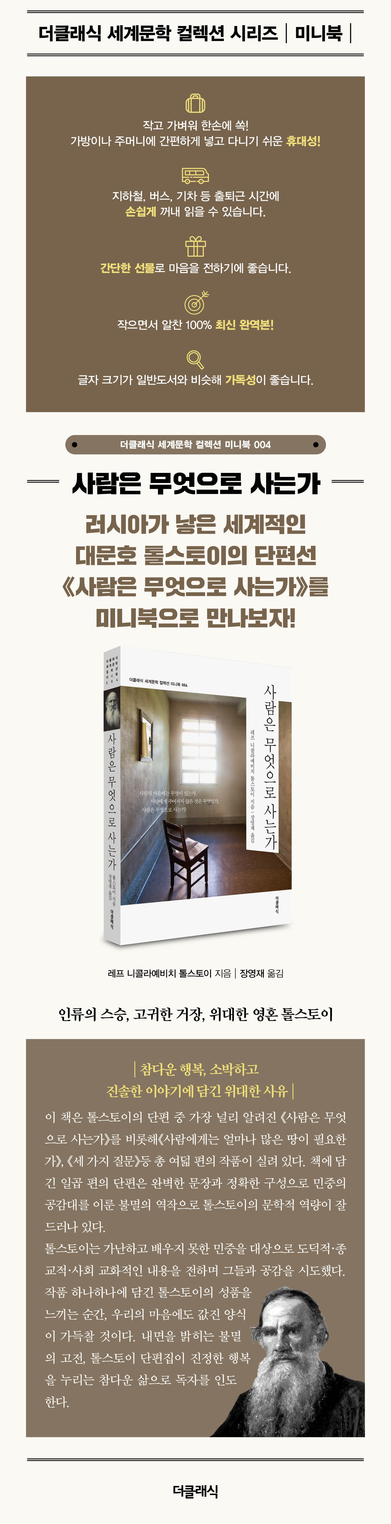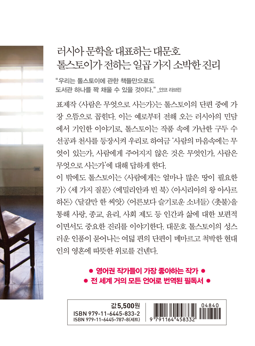 전 세계 거의 모든 언어로 번역된 필독서 톨스토이 단편집 《사람은 무엇으로 사는가》에는 전 생애를 아우르며 인생의 참 의미와 인간 내면의 본성을 탐구했던 톨스토이의 소박한 성품이 담겼다. 민중의 아낌없는 사랑을 받았던 일곱 편의 이야기는 일상에서 흔히 접할 수 있는 소재를 통해 참 진리와 교훈을 전한다. 참다운 인생을 탐구하는 세 가지 질문의 해답이 담긴 《사람은 무엇으로 사는가》, 만족할 줄 모르는 끝없는 인간의 탐욕을 적나라하게 그려 낸 《사람에게는 얼마나 많은 땅이 필요한가》, 누구에게나 나누며 베푸는 삶을 강조하는 《사랑이 있는 곳에 신도 계시다》, 정직하고 성실한 사람이 끝내 승리한다는 교훈을 주는 《에밀리안과 빈 북》, 타인의 마음을 헤아리는 법을 가르치는 《아시리아 왕 아사르하돈》, 노력 없이 결과만 바라는 인간의 게으른 본성을 지적하는 《달걀만 한 씨앗》, 지극히 순수한 어린아이들의 모습에서 참된 진리를 발견하는 《어른보다 슬기로운 소녀들》. 짤막한 이야기들을 한손에 잡히는 미니북으로 읽을 수 있다는 점이 이 책의 가장 큰 매력이다. 독자의 마음을 울리기 충분한 위대한 사상과 인생관을 선물 같은 작은 책으로 만나 보자. 재미와 감동, 교훈과 진리가 담긴 작품을 만나는 순간, 메말라 버린 현대인의 영혼을 위로하는 촉촉한 단비가 내리기 시작한다. |