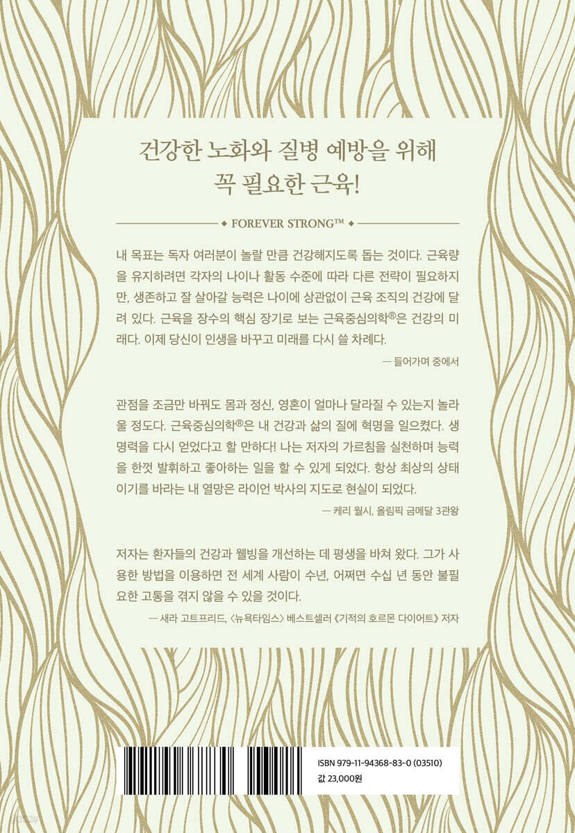 “저자는 장수, 체력, 건강에 가장 중요한 기관인 골격근에 주목해 이렇게 질문한다. ‘지방을 뺄 것이 아니라 근육을 더하는 데 집중하면 어떨까?’ 모두의 건강을 개선하려면 진지하게 고려해야 할 질문이다.” - 레인 노턴(Layne Norton) (박사, [팻 로스 포에버] 저자)