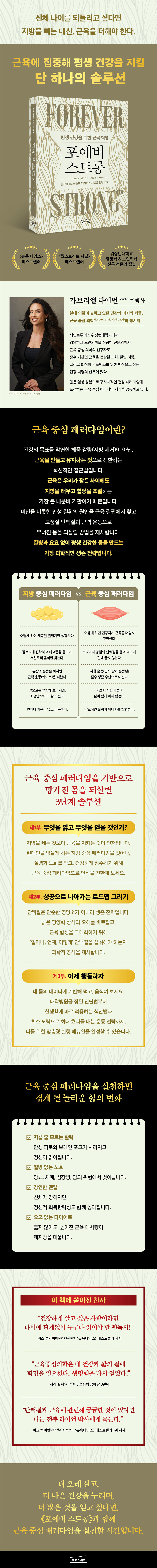 각종 질병에 맞서 몸을 단단하게 보호하고 단련할 방법이 있는 걸까? 평생 건강을 위한 ‘근육 혁명’이라는 분명한 해답을 제시해주는 책! 단순히 오래 사는 데서 나아가 건강하게 나이 들어 가는 게 화두인 사회다. 2025년 국민 다섯 명 중 한 명이 65세 이상인 초고령화 사회로 접어들었다. 국내를 비롯하여 전 세계적으로 인간의 수명은 꾸준히 늘고 있지만, 늘어난 수명에 건강 수명은 따라가지 못하고 있다. 『포에버 스트롱』은 지금 사회와 이 시기에 필요한 화두를 던지고, 그에 필요한 지식을 제공하는 책이다. 초고령 사회를 맞이하여 오래 사는 것보다 건강하게 나이 들기 위해서는 어떻게 해야 하는지 건강과 웰니스에 대한 구체적인 접근법을 제시하고 있다. 영양을 조절하고, 생활 방식을 개선하고, 적절히 운동해서 근육 조직이 건강해지고, 근육을 제대로 관리하여 건강상 무한한 이점을 얻을 방법을 알려주고 있다. 궁극적으로 사회가 강요하는 방식이 아닌 독자 개개인이 ‘원하는 방식대로’ 나이 들 수 있는 길을 안내한다. 구체적인 의학 사례와 여러 식단 구성은 독자가 전문적인 지식을 더욱 쉽고 흥미롭게 받아들일 수 있도록 해준다. 『포에버 스트롱』의 저자인 가브리엘 라이언은 현대 의학의 혁신을 선도하는 의사다. 워싱턴대학교에서 노인의학 및 영양과학 통합 연구전임의 과정과 일리노이대학교에서 영양과학 학부 과정을 밟았다. 건강 및 운동 능력 향상, 노화 및 질병 예방을 위해 각 유형의 단백질을 적절한 수준으로 실전에 적용하는 전문가이자 교육자다. 그런 저자는 우리 몸의 가장 큰 구성 요소인 골격근에 주목한다. 골격근(뼈를 움직여 움직임을 조절하는 근육)이 신체 구조를 구성할 뿐만 아니라 생리 기반에도 영향을 미친다고 하며, 이를 통해 비만, 심장병, 당뇨병과 같은 질병의 위협에 맞서며 건강하게 장수할 수 있다고 안내한다. 『포에버 스트롱』는 장수를 위해 식단과 운동을 바탕으로 몸 전체의 근육 건강을 최적화하는 전인적인 ‘라이언 프로그램’을 설명한다. 환자를 진료하는 한편 유튜브 채널 및 유명한 팟캐스트를 운영하며 인기를 끌고 있는 저자는 이 책에서 ‘헬스장에서만이 아니라 일상에서 어떻게 근력을 키울 수 있을까?’라는 근본적인 질문을 던진다. 그는 모두가 일관된 식습관과 생활 방식을 실천하고 자신과 사랑하는 사람을 위해 노력하도록 도와 세상을 조금 더 튼튼하게 만들겠다는 사명을 갖고 있다. 이처럼 이 책은 나이 들어 가는 모든 사람이 읽을 수밖에 없는 책이다. 모든 사람이 나이 들어 간다. 나이 들며 자연스럽게 젊을 때에 비해 건강에서 멀어져 간다. 그러나 『포에버 스트롱』을 통해 근육중심으로 건강을 재편성한다면 보다 건강한 미래를 맞이할 수 있다. 두렵지 않게, 건강하게, 원하는 방식대로 나이 들 수 있다. 체력의 근원을 파헤쳐 더 강하고 멋진 모습으로 오래도록 살아가고 싶다면 당장 이 책을 펴보자. 책을 읽으며 이제까지 알았던 건강에 관한 잘못된 통념을 바로 잡고, 근육과 단백질을 바탕으로 다시 시작해보자. 시작하기에 너무 늦은 때란 없다는. 이 책에서 제시하는 목표들을 세우고 꾸준히 실천하며 마땅히 누릴 만한 삶을 경험하자. |
