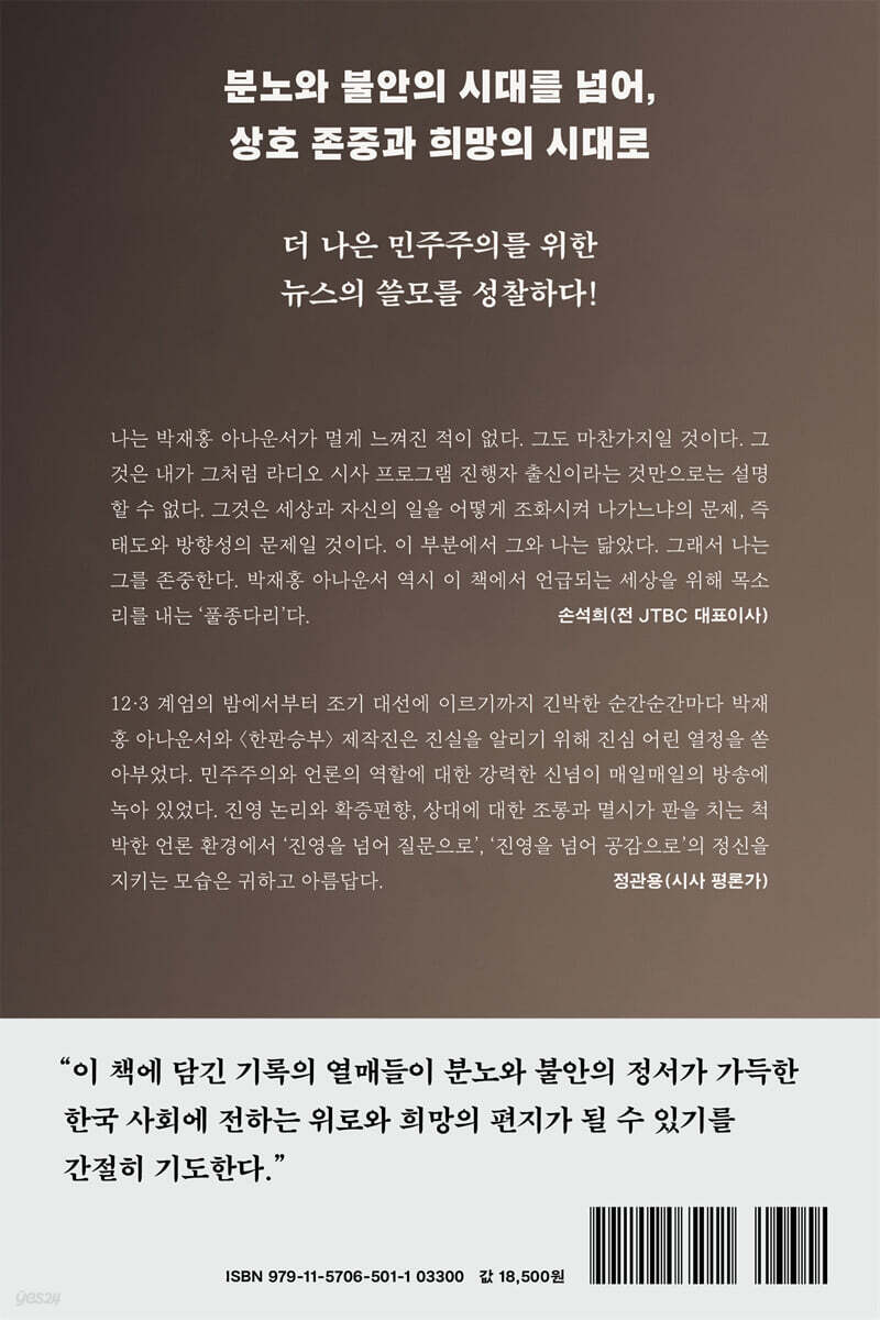 12·3 계엄의 밤에서부터 조기 대선에 이르기까지 긴박한 순간순간마다 박재홍 아나운서와 〈한판승부〉 제작진은 진실을 알리기 위해 진심 어린 열정을 쏟아부었다. 민주주의와 언론의 역할에 대한 강력한 신념이 매일매일의 방송에 녹아 있었다. 진영 논리와 확증편향, 상대에 대한 조롱과 멸시가 판을 치는 척박한 언론 환경에서 ‘진영을 넘어 질문으로’, ‘진영을 넘어 공감으로’의 정신을 지키는 모습은 귀하고 아름답다. - 정관용 (시사 평론가)