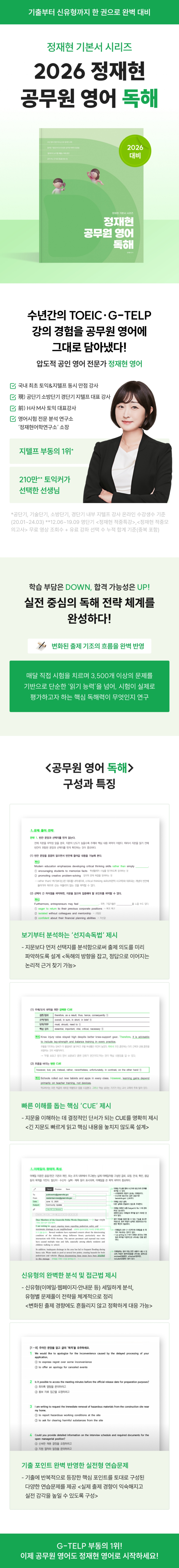 · 지문 해석보다 먼저 선택지를 분석하도록 구성해, 문제의 출제 의도와 핵심 판단 지점을 미리 파악할 수 있습니다. · ‘선지속독법’으로 독해의 방향을 빠르게 정하고, 정답으로 이어지는 논리적 근거를 신속하게 찾아내는 능력을 강화합니다. 2. 빠른 이해를 이끄는 핵심 ‘CUE’ 제시 · 긴 지문을 읽을 때 반드시 주목해야 할 결정적 단서를 ‘CUE’로 명확히 제시하여 핵심을 놓치지 않도록 돕습니다. · 주요 정보에 집중하며 지문을 압축적으로 이해하는 능력을 훈련할 수 있습니다. 3. 신유형 완전 분석으로 변화된 시험에 정확하게 대응 · 이메일, 웹페이지, 안내문 등 신유형을 세밀하게 분석하고, 유형별 문제 접근법을 체계적으로 정리했습니다. · 변화된 출제 경향 속에서도 흔들리지 않고 정확하게 정답을 찾을 수 있는 실전 전략을 제공합니다. 4. 기출 포인트를 반영한 실전형 연습문제로 시험 완전 대비 · 반복적으로 등장하는 기출 핵심 포인트를 토대로 구성된 다양한 연습문제를 제시합니다. · 실제 시험과 동일한 흐름과 난이도에 익숙해지며 실전 감각을 자연스럽게 높일 수 있습니다. |