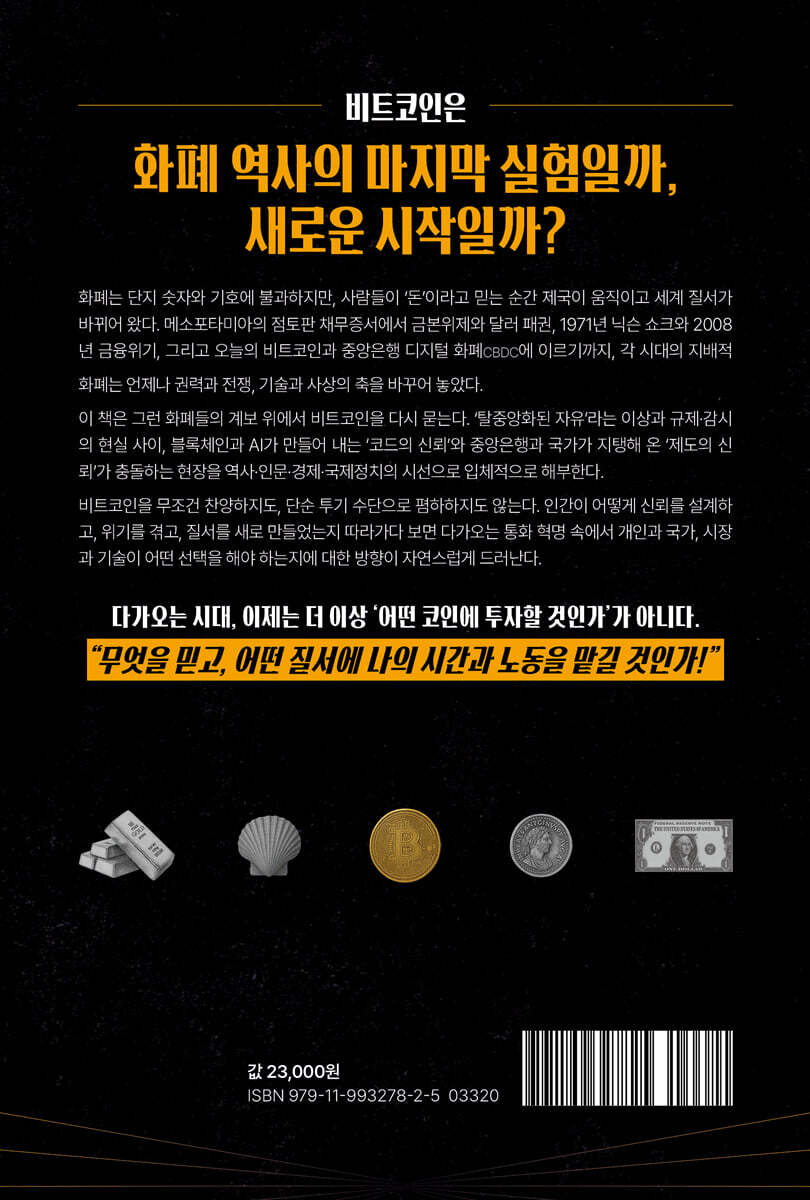 오늘날 우리는 세 번째 화폐 혁명의 문턱에 서 있다. 그리고 그 문 너머에서, 돈은 더 이상 국가의 명령이 아니라 인류의 합의로 쓰인 새로운 언어가 되려 하고 있다. “당신은 무엇을 믿는가?”, “그 믿음은 앞으로도 계속 돈이 될 수 있을까?” 이 책은 그 물음에서 출발한다. 그리고 그 물음이 향하는 곳에는, 돈의 미래보다 더 근원적인 질문 ? 인간의 자유와 문명의 신뢰가 서 있다.