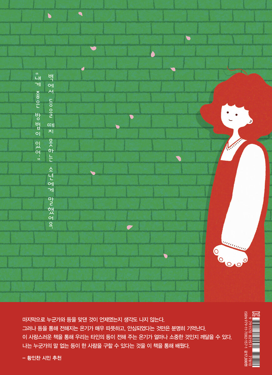 마지막으로 누군가와 등을 맞댄 것이 언제였는지 생각도 나지 않는다. 그러나 등을 통해 전해지는 온기가 매우 따뜻하고, 안심되었다는 것만은 분명히 기억난다. 이 사랑스러운 책을 통해 우리는 타인의 등이 전해 주는 온기가 얼마나 소중한 것인지 깨달을 수 있다. 나는 누군가의 말 없는 등이 한 사람을 구할 수 있다는 것을 이 책을 통해 배웠다. - 황인찬 (시인)