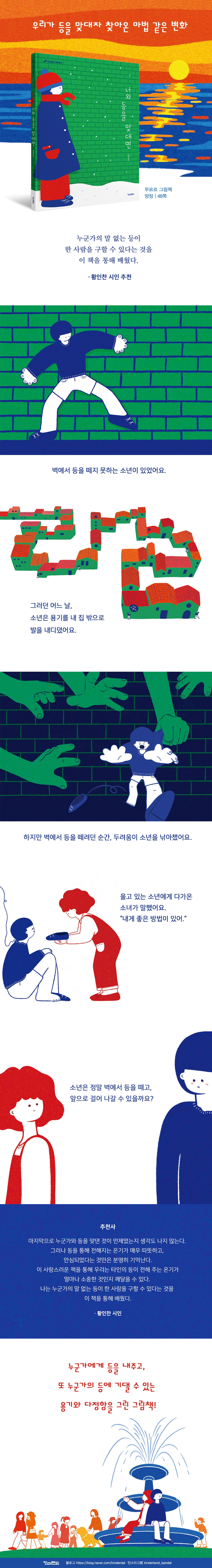 벽에서 등을 떼지 못하는 소년이 있었습니다. 소년은 광장에 나가고 싶었지만, 그럴 수 없었습니다. 넓은 광장에는 등을 붙일 곳이 없었으니까요. 그래서 언제나 혼자였습니다. 집 안에서 혼자 밥을 먹고, 혼자 티브이를 보고, 혼자 잠들어야 했지요. 그러던 어느 날, 소년은 용기를 내어 집 밖으로 한 발 내디뎠습니다. 광장을 향해 길고 긴 건물들의 벽을 따라 걷고 또 걸었습니다. 하지만 막상 광장에 도착해 벽에서 등을 떼려는 순간, 두려움이 소년의 뒷덜미를 세게 잡아챘습니다. 소년은 다시 주저앉았고, 평생 벽에서 등을 떼지 못할 것만 같았습니다. 그때, 한 소녀가 말을 건넸습니다.