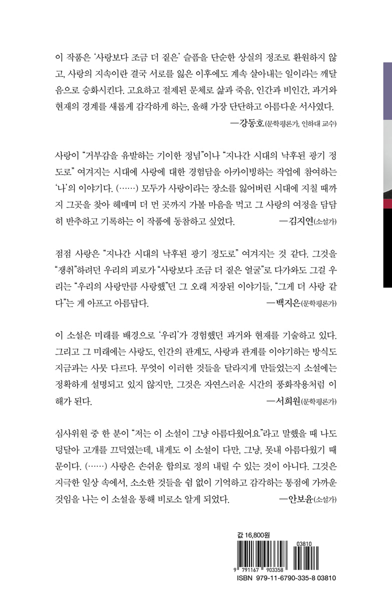 사랑이 “거부감을 유발하는 기이한 정념”이나 “지나간 시대의 낙후된 광기 정도로” 여겨지는 시대에 사랑에 대한 경험담을 아카이빙하는 작업에 참여하는 ‘나’의 이야기다. (……) 모두가 사랑이라는 장소를 잃어버린 시대에 지칠 때까지 그곳을 찾아 헤매며 더 먼 곳까지 가볼 마음을 먹고 그 사랑의 여정을 담담히 반추하고 기록하는 이 작품에 동참하고 싶었다. - 김지연 (소설가)