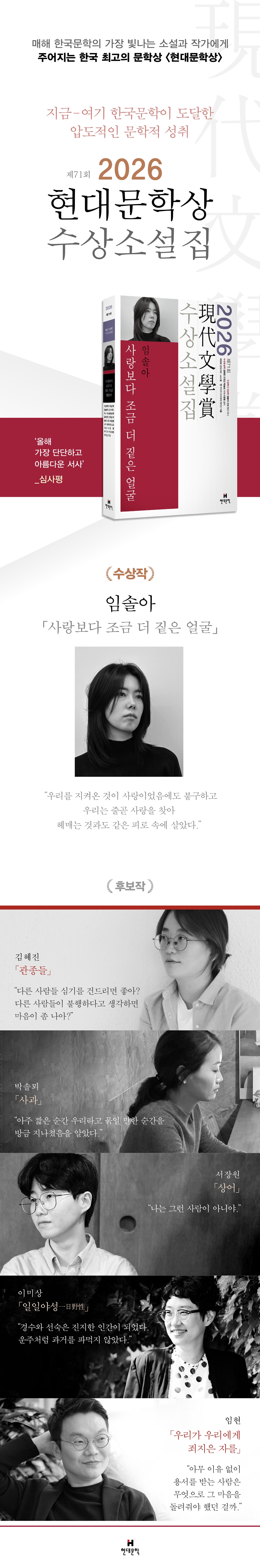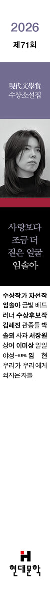 언젠가부터 한 해도 빠짐없이 나는 새해 소원으로 글을 계속해서 쓰는 걸 빌었다. 쓴다는 것으로 나의 다른 면모들을 잘 지키게 될 거라고 믿었던 것 같다. 작년부터 나는 그런 소원은 빌지 않기로 했다. 계속한다는 것보다 더 중요한 것들을 알게 되어서가 아니라 이제는 내가 쓴 소설에 누군가의 소원이 담겨 있어야 한다고 생각했기 때문이다. 나는 소원을 더 많이 듣고 싶다. 나의 소설을 읽어주고 의미를 가늠해주신 심사위원 선생님들께 진심으로 감사드린 다. 아마도 누군가의 소원에 골똘했던 시간들이 어딘가에 닿아 기척을 얻은 모양이다. 나의 소원을 지워내면서 계속 소설을 쓰고 싶다. - 임솔아(소설가) 수상후보작 김혜진, 「관종들」 박솔뫼, 「사과」 서장원, 「상어」 이미상, 「일일야성一日野性」 임 현, 「우리가 우리에게 죄지은 자를」 |