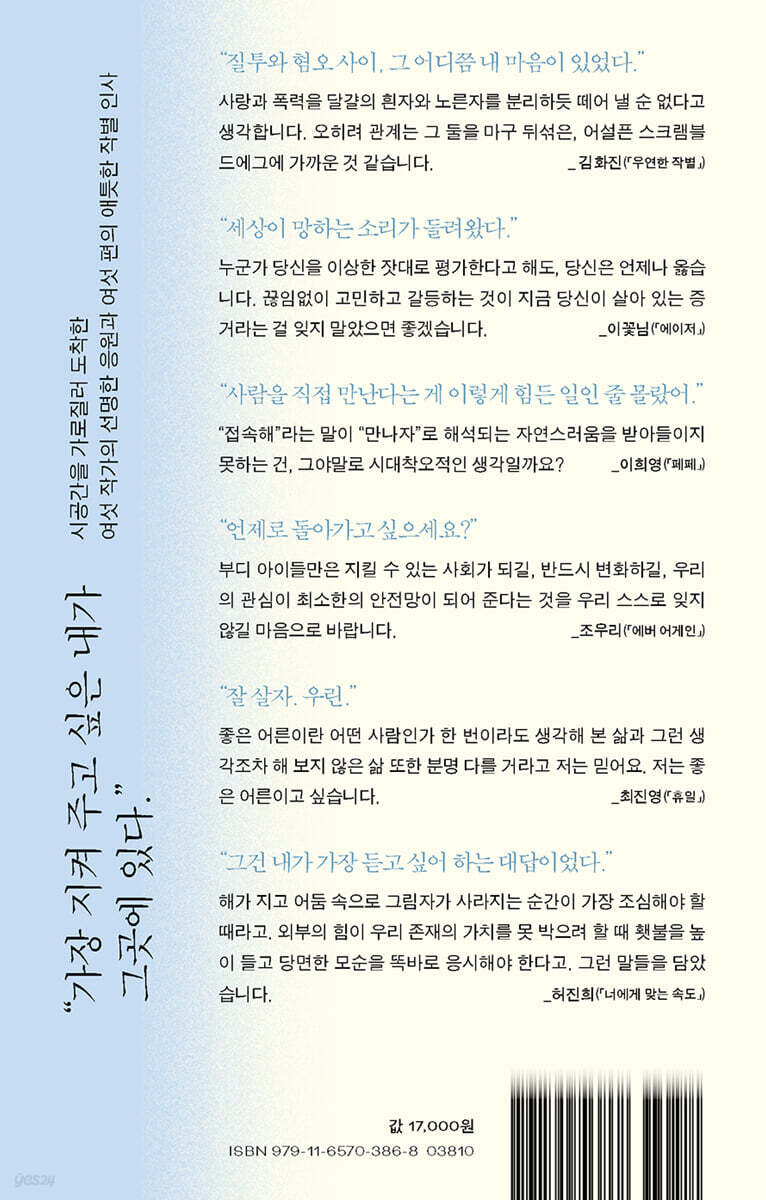 --- 「우연한 작별」 중에서 충만에게 제이는 더없이 좋은 친구이다. 하지만 둘 중 한 사람이 더 높은 점수를 받는다면 충만은 당연히 자신이 되어야 한다고 생각했다. 제이는 뭐든 대충대충이었지만 충만은 아니었다. 이번 에이저에 임하는 자세부터 달랐다. 충만은 이번 에이저에 모든 걸 다 걸었다고 해도 과언이 아니었지만 제이는……. --- 「에이저」 중에서 가상 세계 즉 메타버스는, 휴대 전화로 하루를 시작하는 것만큼 일상이 돼 버렸다. 이제 주택 구입에 있어 기준이 되는 것은, 스쿨 룸과 오피스 룸이 얼마나 크며 다양한 활용도가 있는지에 달렸다. 일상 대부분이 가상 세계에서 이루어지니까. 역세권이나 학군이란 말이 사라진 지도 오래되었다. 엄마가 아침마다 오피스 룸으로 출근하듯, 한울 역시 스쿨 룸으로 등교를 했다. 그렇게 각자의 홀로 렌즈를 통해, 회사와 학교로 접속해 들어갔다. --- 「페페」 중에서 하지만 지금까지도 빈번하게 같은 일이 일어난다. 가장 약하고 가장 아래에 위치한 힘없는 아이들이 거대한 시스템에 갈려 버리는 일. 대다수의 사람들은 그 일에 관심을 갖지 않는다. 공론화되었더라도 극히 일부의 사람들에게만 반향이 있을 뿐이었다. --- 「에버 어게인」 중에서 그러니까 나는 있잖아, 좋아하는 일을 하는 것보다 싫어하는 일을 하지 않는 게 더 중요하다고 봐. 내가 싫어하는 일이 뭘까 생각했다. 일단 윤이 싫어하는 건 나도 싫다. 윤이 우는 것도 싫다. 윤과 위험한 버스를 계속 타는 것도 싫고. 무시와 차별도 싫고. 서로 험담하는 사람끼리 한 공간에서 일하는 것도 싫고. 수박 스무디도 싫고……. 도로를 멀리 바라보며 윤이 말했다. --- 「휴일」 중에서 그런 순진한 기대를 접은 건 몇 살 더 먹은 뒤였다. 세상 모든 사람들이 똑같은 출발선에서 달리기를 시작하지 않는다는 사실을 깨달았을 때, 그리고 그 차이를 좁히기가 여간 어려운 게 아니라는 것을 알아차렸을 때 나는 내기에서 이길 생각을 아예 접어 버렸다. 영영 따라잡을 수 없을 텐데 그깟 내기에서 이기는 게 무슨 의미가 있을까? 내기에서 이긴들 찰나의 기쁨 외에 내게 돌아올 게 아무것도 없는데 말이다. (…) 아무튼 정리하자면, 그래서 나는 이번에도 질 게임을 하고 있는 것이다. --- 「너에게 맞는 속도」 중에서 |