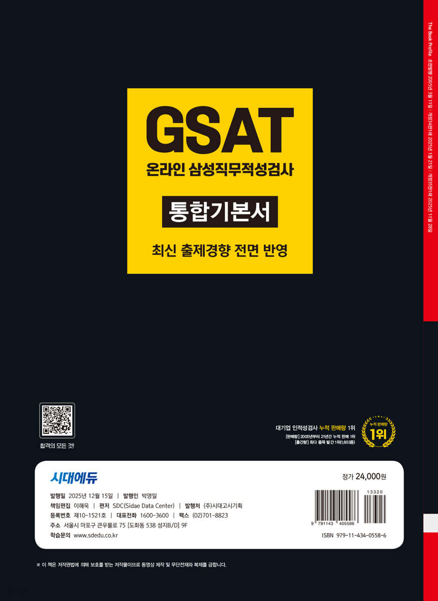 CHAPTER 01 2025년 하반기 기출복원문제 CHAPTER 02 2025년 상반기 기출복원문제 CHAPTER 03 2024년 하반기 기출복원문제 CHAPTER 04 2024년 상반기 기출복원문제 CHAPTER 05 2023년 하반기 기출복원문제 CHAPTER 06 2023년 상반기 기출복원문제 [PART 2] 대표기출유형 CHAPTER 01 수리 대표기출유형 01 거리·속력·시간 대표기출유형 02 농도 대표기출유형 03 일의 양 대표기출유형 04 금액 대표기출유형 05 경우의 수 대표기출유형 06 확률 대표기출유형 07 자료분석 대표기출유형 08 자료계산 대표기출유형 09 자료변환 대표기출유형 10 자료추론(수추리) CHAPTER 02 추리 대표기출유형 01 삼단논법 대표기출유형 02 벤 다이어그램 대표기출유형 03 진실게임 대표기출유형 04 배열하기·묶기·연결하기 대표기출유형 05 도형추리 대표기출유형 06 도식추리 대표기출유형 07 문단나열 대표기출유형 08 참 또는 거짓 대표기출유형 09 반박/반론/비판 대표기출유형 10 [보기] 해석 [PART 3] 최종점검 모의고사 제1회 최종점검 모의고사 제2회 최종점검 모의고사 제3회 최종점검 모의고사 제4회 최종점검 모의고사 [PART 4] 인성검사 [PART 5] 면접 CHAPTER 01 면접 유형 및 실전 대책 CHAPTER 02 삼성그룹 실제 면접 [별 책] 정답 및 해설 PART 1 3개년 기출복원문제 PART 2 대표기출유형 PART 3 최종점검 모의고사 |