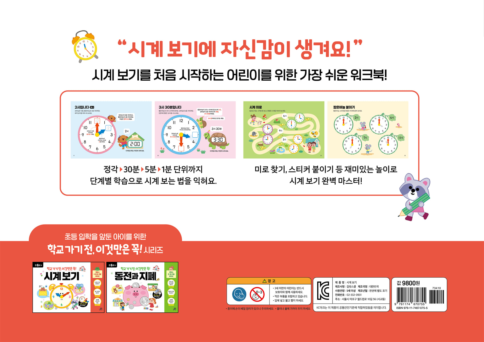 시계를 보는 것은 가장 기본적인 생활 능력 중 하나입니다. 식사하기, 잠자기, 학교 가기 등 세상의 모든 활동이 시간과 연결되어 있기 때문입니다. 하지만 시계를 볼 줄 모르면 아이는 그때그때 부모님의 말과 지시에만 의지하게 됩니다. 반대로 시계를 볼 수 있게 되면 부모님이나 친구와 ‘몇 시’라는 구체적인 시간을 약속하고 소통할 수 있게 됩니다. 이처럼 아이 스스로 시간을 관리하는 습관을 들이면 자율성과 자신감도 함께 자라납니다. 단계별 학습으로 시계 보는 법을 배워요 먼저 귀여운 그림으로 시계의 종류, 구조, 움직임을 익히며 시계와 친해져요. 그다음 정각→30분→5분→1분 단위까지 단계적으로 시계 보는 법을 익혀 보세요. 각 단계마다 스티커 붙이기, 미로찾기, 짝맞추기 등 다양한 활동으로 재미있게 연습할 수 있지요. 책 마지막에는 아이들의 실생활과 연결된 문제를 넣어, 일상에서 자연스럽게 시간 감각을 키울 수 있도록 했어요. 수학적 사고력을 기를 수 있어요 시계 보기는 단순히 시각과 시간을 읽는 것을 넘어 시계 속의 숫자, 순서, 규칙을 이해하는 고차원적인 수학적 활동입니다. 이처럼 시계 학습은 이후 초등 수학 개념을 받아들이는 데 든든한 기반이 됩니다. 초등학교 생활에 자신감이 생겨요 ‘지금 몇 시예요?’ ‘쉬는 시간 얼마나 남았어요?’ 초등학교에 입학한 아이들이 선생님에게 가장 많이 하는 질문입니다. 이처럼 초등학교에 입학하면 아이는 수업 시간, 쉬는 시간, 점심시간 등 정해진 시간 규칙 속에서 생활하게 됩니다. 시계 보기에 익숙한 아이는 낯선 환경에도 빠르게 적응하고 자신감 있게 학교생활을 시작할 수 있습니다. |