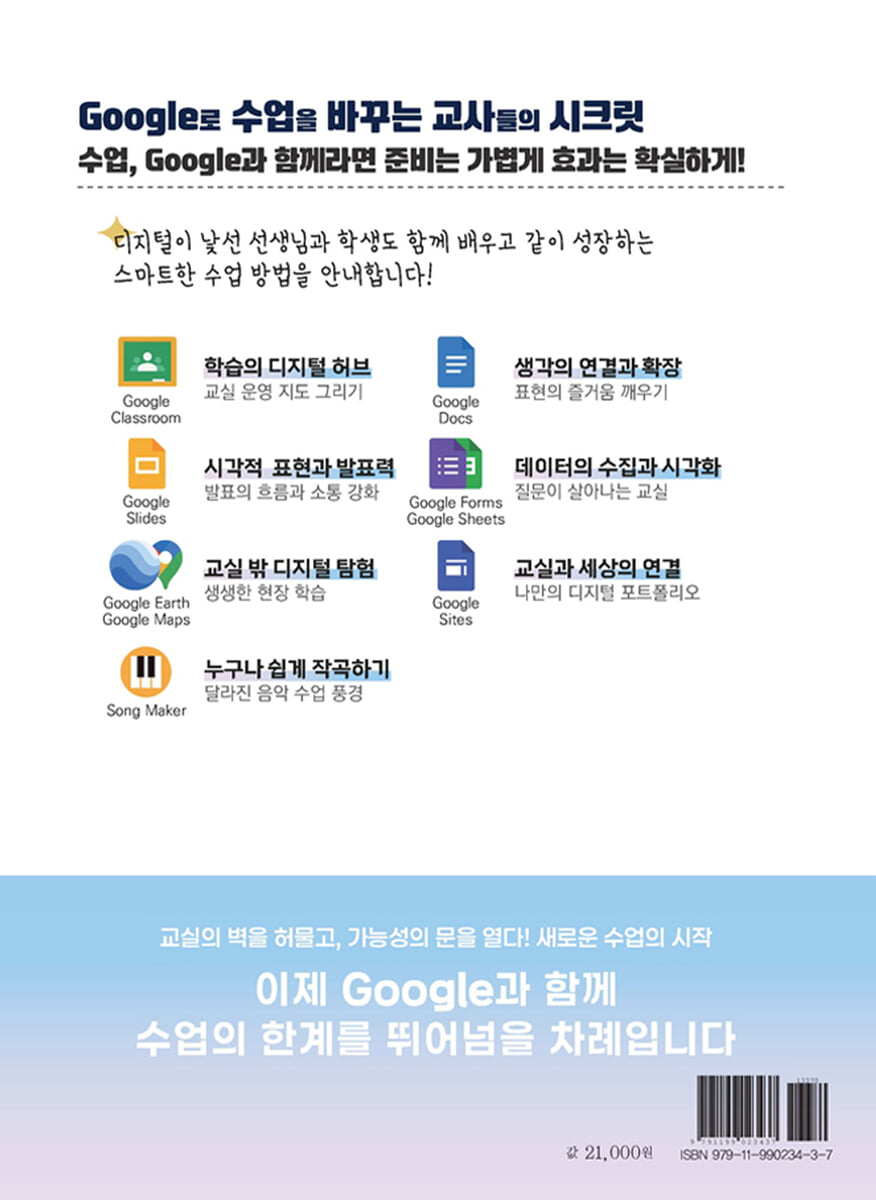 01. Google Classroom으로 여는 수업 혁신의 문 02. Google Classroom의 핵심 기능과 전략 1. Google Classroom 개설로 디지털 허브 구축하기 2. Google Classroom 메뉴를 이해하고 교실 운영 지도 그리기 3. 과제 설계와 배포로 학생 참여 전략 수립하기 4. 평가와 피드백 기능으로 학생들의 성장 돕기 5. 표절 여부(원본성) 확인 기능으로 저작권 점검하기 6. 기한·재사용·주제 기능으로 스마트 클래스 만들기 03. Google Classroom 확장 꿀팁 1. EduPlus로 진화하는 Google Classroom 만들기 2. EduPlus의 새로운 기능으로 Classroom 업그레이드하기 2장 Google Docs 생각을 연결하고 사고를 확장하는 도구 01. Google Docs가 깨운 표현의 즐거움 02. Google Docs의 핵심 기능과 전략 1. 탭(Tab)기능으로 모둠 활동 환경 만들기 2. 스마트 칩(Smart Chip) 기능으로 프로젝트 학습 관리하기 3. 이미지 웹검색 기능으로 유해성 없는 자료 탐색하기 4. 페이지 없음(Pageless) 기능으로 경계 없는 디지털 학습공간 만들기 5. 댓글, 제안 기능으로 소통하는 학습 환경 구축하기 6. 자유 곡선 그리기 기능으로 아이디어 표현하기 7. 도형 그리기와 텍스트 상자 기능으로 아이디어 구조화하기 8. 링크 삽입 기능으로 학습 정보 확장하기 9. 음성 입력 기능으로 말하며 기록하기 03. Google Docs로 만드는 살아있는 교실 1. 사회: 클릭 한 번으로 세상과 연결되는 살아있는 인권 수업 2. 국어: 모둠별로 실시간 협업하여 토의·토론하기 04. Google Docs 확장 꿀팁 1. Gemini로 진화하는 Google Docs 3장 Google Slides 시각적 표현과 발표력을 키우는 수업 도구 01. Google Slides로 생각을 시각화하는 아이들 02. Google Slides의 핵심 기능과 전략 1. 템플릿 갤러리 기능으로 발표 자료의 틀 만들기 2. 자리 표시자 기능으로 슬라이드 내용 체계화하기 3. 이미지 삽입 기능으로 발표 자료의 기본 구성 다지기 4. 동영상 삽입 및 편집 기능으로 발표 자료 구성하기 5. 공동 제작 및 편집 기능으로 협업 슬라이드 만들기 6. 댓글 기능으로 또래 피드백 주고받기 7. 링크 삽입 기능으로 쉽게 자료 탐색하기 8. 발표자 보기 및 Q&A 기능으로 발표 흐름과 소통 강화하기 9. 버전 기록 기능으로 슬라이드 수정 과정 살펴보기 03. Google Slides로 만드는 살아있는 교실 1. 국어: 시를 시각화하는 시화 슬라이드 만들기 2. 사회: 모둠별 역사 인물 소개하기 3. 영어: 나만의 영어 단어장 만들기 4) 관계 형성: 디지털 롤링페이퍼로 마음 전하기 04. Google Slides 확장 꿀팁 1. 타이머 삽입으로 집중력 올리기 2. 단축키로 작업 속도 올리기 3. 학생 포트폴리오로 활용하기 4. EduPlus에서 슬라이드를 영상으로 녹화하기 4장 Google Forms & Sheets 생각을 수집하고 데이터를 시각화하는 도구 01. Google Forms & Sheets가 만든 데이터 기반 수업 문화 02. Google Forms & Sheets의 핵심 기능과 전략 Google Forms 1. 다양한 질문 유형으로 수업 활동 설계하기 2. 자동 채점 기능으로 효율적인 퀴즈 평가하기 3. Google Classroom에서 Google Forms 퀴즈 성적 자동 가져오기 4. 답변을 기준으로 섹션 이동 기능으로 수준별 문제지 만들기 5. 이미지 삽입 기능으로 시각적 힌트 제공하기 6. 응답 탭과 시트 연동으로 전체 응답 흐름 한눈에 보기 Google Sheets 1. 기초 함수로 줄넘기 기록 시각적으로 정리하기 2. 필터 기능으로 원하는 내용만 빠르게 확인하기 3. 조건부 서식으로 수행평가 결과 시각적으로 분석하기 03. Google Forms와 Sheets로 만드는 살아있는 교실 1. 모든 교과: 조용한 궁금증을 이어주는 질문 폼의 힘 2. 사회: 미션 해결의 짜릿함, 구글 폼 방탈출 게임 3. 학급 경영: 한 장의 시트로 통합 관리하는 교실 4. 과학: 협업과 탐구의 완성, Google Sheets로 실험 보고서 쓰기 04. Google Forms & Sheets 확장 꿀팁 1. 정규표현식으로 오류 없는 응답 데이터 받기 2. 앱스크립트(Apps Script)로 나만의 자동화 기능 맛보기 5장 Google Earth & Maps 교실을 넘어 세상을 품는 디지털 탐험 도구 01. Google Earth & Maps로 교과서 너머, 살아있는 세상 탐험하기 02. Google Earth & Maps의 핵심 기능과 전략 Google Earth 1. 기본 탐색 기능으로 지구 지리 탐험하기 2. 과거 이미지 표시 및 타임랩스 기능으로 지역 변화 탐구하기 3. 3D 건물 및 스트리트 뷰 기능으로 생생한 현장 학습하기 4. 프로젝트 만들기 기능으로 나만의 이야기 구성하기 Google Maps 1. 장소 검색 및 저장 기능으로 지도 자료 만들기 2. 나만의 지도 기능으로 학생 주도형 시각화 프로젝트 진행하기 03. Google Earth & Maps로 만드는 살아있는 교실 1. 미술: 시공간 경계를 허무는 나만의 명화 여행 플래너(with Google Earth) 2. 사회: 외국인 친구를 위한 우리 동네 가이드북 만들기 (with Google Maps) 04. Google Earth & Maps 확장 꿀팁 1. Google Earth Pro 설치 및 활용: 전문가 수준의 기능 사용하기 6장 Google Sites 교실과 세상을 연결하는 디지털 포트폴리오 01. Google Sites로 만드는 나만의 디지털 포트폴리오 02. Google Sites의 핵심 기능과 전략 1. Google Sites 시작하기 2. 삽입 기능으로 수업 자료와 학습 결과물 통합하기 3. 콘텐츠 블록과 이미지 캐러셀로 학습 내용을 효과적으로 정리하기 4. Google 도구 연동으로 다양한 기능 추가하기 5. 페이지 구성으로 체계적인 학습 설계하기 6. 테마 설정으로 개성 있는 학습공간 꾸미기 7. 공유와 게시 기능으