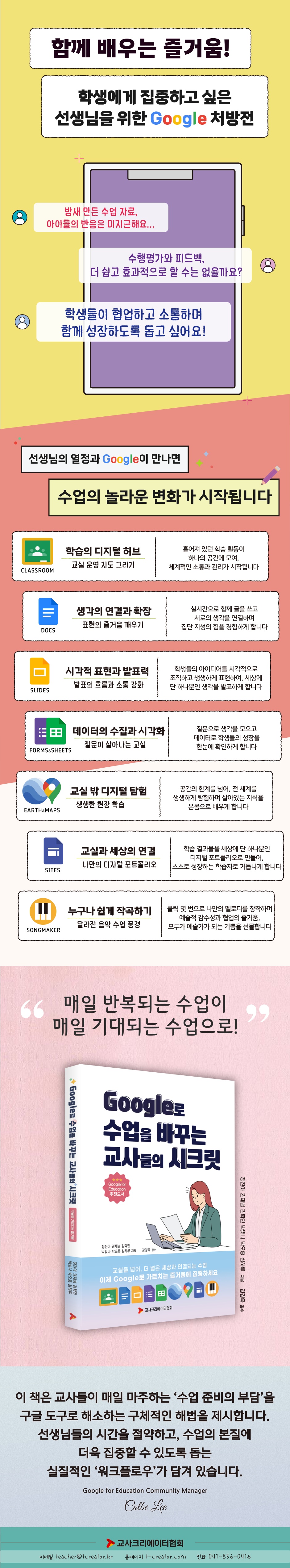 요즘은 모든 것들이 너무 빠르게 변화하고 있고, 학교도 예외는 아닐 것입니다. 그 변화의 중심에는 학생들의 성장을 위해 끊임없이 도전하는 선생님들이 계십니다. 수업의 질은 높이고, 업무 시간은 줄이는 ‘스마트 교사’가 되기를 원한다면, 이 책이야말로 책상 위에 늘 두고 펼쳐 봐야 할 현장 맞춤형 필독서입니다. 이 책을 통해 선생님들께서는 ‘미래형 교실’을 구축하고, 학생들에게 ‘협력과 소통 능력’을 길러주는 진정한 스마트 교육의 리더가 되실 수 있을 것입니다. 이 책을 집필하시느라 애써주신 각 지역의 GEG리더, 캡틴 및 교사크리에이터협회 소속이신 정진아, 권재범, 김학민, 박빛나, 박오종, 심하루 선생님, 그리고 강경욱 선생님께 감사의 인사를 드리고 싶습니다. 항상 교육 현장에서 변화를 두려워하지 않고 학생들과 선생님들을 위해 애써주셔서 감사합니다. - Colbe Lee (Google for Education Community Manager) |