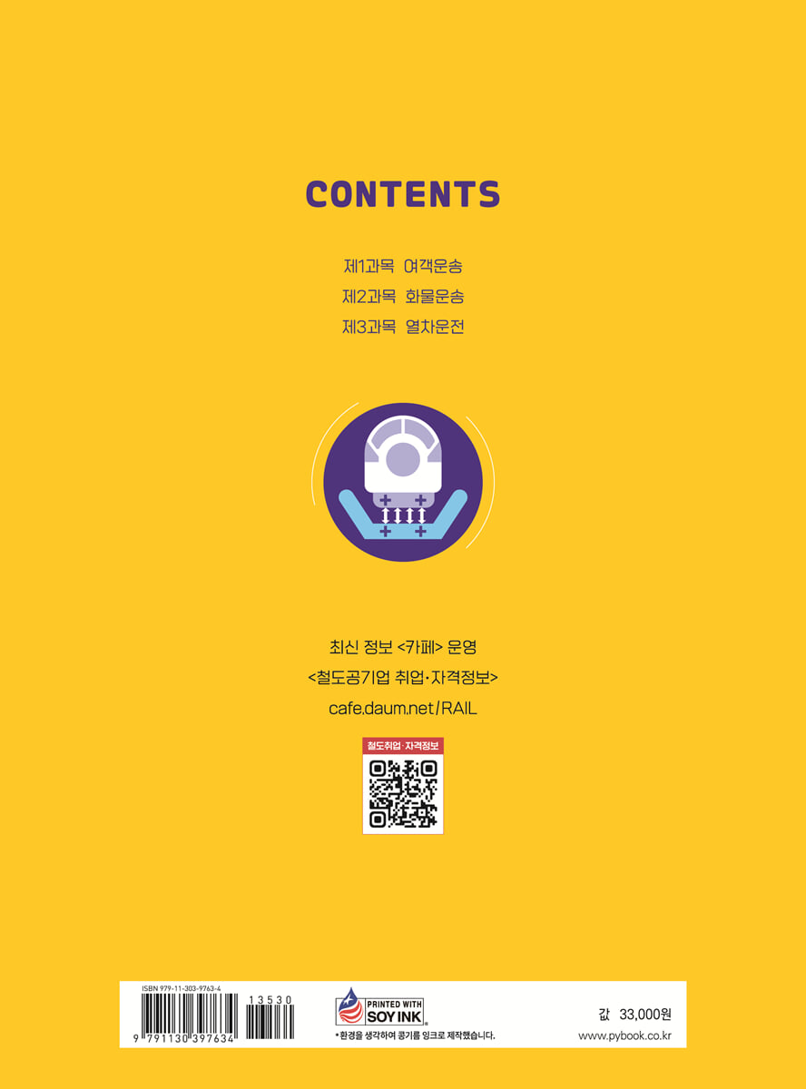〈 제1편 여객운송 〉 제1장 총칙·운임요금·승차권 제2장 환불·배상·책임 등 제3장 여객부속약관·광역철도약관 제4장 여객운송업무매뉴얼 제5장 철도안전법(여객운송) 제6장 철도사업법(여객운송) 제7장 도시철도법 〈 제2편 화물운송 〉 제1장 물류개론 제2장 철도화물운송 제3장 화물 운임·요금 제4장 화물운송 부대업무(요금) 제5장 화차 수송 제6장 철도사업법·철도안전법(화물운송) 제7장 철도물류 관련 법령 〈 제3편 열차운전 〉 제1장 총칙 제2장 운전(열차·차량운용) 제3장 운전(열차운행관리) 제4장 폐색 제5장 신호 제6장 사고의 조치 제7장 철도차량운전규칙 제8장 철도안전법·도시철도운전규칙 [실기시험 편] 〈 제1편 실기시험 개요 〉 제1장 출제기준 제2장 시험방법 〈 제2편 필답형 실기시험 〉 제1장 출제경향 분석 제2장 핵심내용 정리 제3장 기출예상문제 〈 제3편 작업형 실기시험 〉 제1장 전호 제2장 선로전환기 취급 제3장 차량해결 |