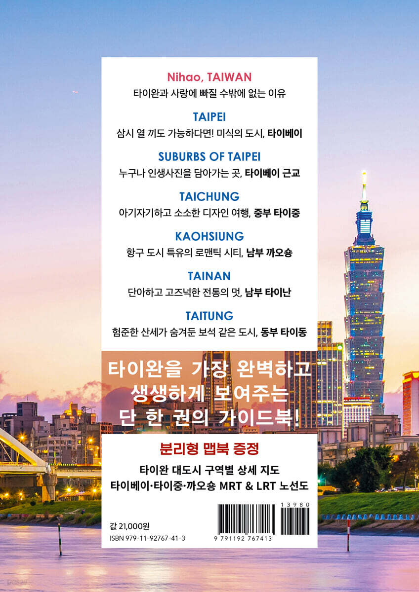Taiwan Overview 놓칠 수 없는 타이완 추천 명소 베스트 오브 베스트 ★ 타이완과 사랑에 빠질 수밖에 없는 이유 10가지 ★ 타이완 추천 일정 타이완 여행의 베이직 타이베이 기본 코스 I 진짜 타이베이를 누리는 타이베이 1 Day 추가 일정 I SPECIAL PAGE 시크한 도시여행자를 위한 타이베이 여행 팁 I 타이완 여행의 하이라이트 중·남부 타이완 기본 코스 I 진짜 중부 타이완을 누리는 중부 타이완 1 Day 추가 일정 I 진짜 남부 타이완을 누리는 남부 타이완 1~2 Day 추가 일정 I 태평양과 맞닿은 동네 동부 타이완 추천 코스 ★ 타이완 음식 탐구일기 딤섬 I 훠꿔 I 우육면 I 만두 I 비건 요리 I 쓰촨요리 I 철판구이 I 아침식사 I 안전 보장 메뉴 리스트 15 I 중국어 메뉴판 완전정복 ★ 타이완 샤오츠 탐구일기 쩐주나이차 I 펑리수 I 망고빙수 I 중국차 I 지파이 I 총좌빙 I 루웨이 I 탄카오 샹창 I 떠우화 & 펀위엔 I 열대과일 I 샤오츠 완전 정복 I 타이완을 대표하는 커피 전문점 ★ 타이완 쇼핑 탐구일기 드럭 스토어 & 마트 & 편의점 I 타이완에서 놓치지 말아야 할 쇼핑 아이템 ★ 타이완으로 떠나기 전 꼭 알아야 할 10가지 ★ 푸통푸통(두근두근) 타이베이 ● 타이베이 신이 I 시먼띵 I 타이베이 처짠 주변 I 동취 I 용캉지에 I 쭝샨 I 디화지에 I 푸진지에 I 타이베이 북부 I 타이베이 남부 I 야시장 SPECIAL PAGE 백화점 부럽지 않은 복합 라이프스타일 쇼핑몰, 청핀 서점 주목할 만한 타이완의 오가닉 뷰티 브랜드 타이완과 중국의 아버지, 쑨원 비가 와도 괜찮아, 작지만 작지 않은 박물관 고궁박물원 제대로 즐기기 마오콩을 충분히 즐기기 위해 알아두면 좋은 팁 12월 31일에 열리는 흥미진진 축제, 신년맞이 불꽃놀이 타이베이에서 누리는 특별한 재미, 발 마사지, 샴푸 마사지, 경극 가볍게 즐길 수 있는 알짜배기 마사지, 역내 간이 마사지 코너 타이완 사람들의 명랑한 취미생활, 실내 새우낚시 띠아오샤 ★ 더 깊숙이, 타이베이 근교 ● 딴수이 ● 타오위엔 ● 예리우 ● 지우펀 ● 진꽈스 ● 지롱 ● 잉꺼 & 싼샤 ● 양밍샨 국가공원 ● 이란 SPECIAL PAGE 하루짜리 버스 여행 하오싱 버스 타이베이 근교 여행의 또 다른 방법, 택시 투어 ★ 타이베이 근교 온천 & 핑시선 기차 힐링 여행 ● 우라이 ● 신베이터우 ● 지아오시 ● 양밍샨 온천단지 ● 핑시선 SPECIAL PAGE 우라이, 신베이터우, 지아오시, 양밍샨 온천 중 어디를 가야 할까? ★ 한 걸음 더, 중부 타이완 ● 타이중 타이중 기차역 주변 I 국립 타이완미술관 주변 I 소고 백화점 & MRT 스쩡푸·원신삼림공원 역 주변 I 타이중 기타 지역 ● 짱화 ● 루강 ● 지지선 ● 지아이 ● 아리샨 ● 르위에탄 SPECIAL PAGE 버블티의 메카 춘수이탕 짱화 & 루강 여행 일정 짜기 지지선에서는 시간을 느리게 쓰자 아리샨과 르위에탄 어디를 먼저 가는 게 좋을까? 알아두면 힘이 되는 아리샨 여행 팁 조금 특별한 아리샨의 숙소 알아두면 힘이 되는 르위에탄 여행 팁 ★ 조금 멀어도 괜찮아, 남부 타이완 ● 까오숑 MRT 시즈완 역 주변 I MRT 메일리다오 역 주변 I 웨이우잉 역 주변 I MRT 주워잉 역 주변 ● 샤오리우치우 ● 타이난 안핑 I 공묘 주변 I 올드 시티의 골목길 I 타이난 근교 도시 ● 컨띵 SPECIAL PAGE 치진 가는 길에 들러보자, 까오숑 빙수 거리 샤오리우치우의 추천 액티비티 맛으로는 타이완 최고 수준, 화위엔 야시장 컨띵을 둘러보는 네 가지 방법 ★ 눈부신 자연의 힘, 동부 타이완 ● 화리엔 ● 타이루거 ● 타이동 타이동 시내 I 동부 해안선 I 츠샹 I 즈번 온천단지 SPECIAL PAGE 타이동 더 깊게 알아보기! ★ INDEX ★ 맵북(별책 부록) MAP 1 타이완 전도 MAP 2 타이베이 광역도 MAP 3 신이 MAP 4 시먼띵 MAP 5 타이베이 처짠 주변 MAP 6 동취 MAP 7 용캉지에 주변 MAP 8 쭝샨 MAP 9 푸진지에 주변 MAP 10 스린 야시장 MAP 11 스따 야시장 MAP 12 디화지에 MAP 13 타이베이 MRT 노선도 MAP 14 타이완 중·남부 MAP 15 타이중 광역도 MAP 16 타이중 MRT 노선도 MAP 17 타이중 기차역 & 국립 타이완미술관 주변 MAP 18 소고 백화점 & MRT 스쩡푸·원신삼림공원 역 주변 MAP 19 까오숑 광역도 MAP 20 까오숑 MRT & LRT 노선도 MAP 21 MRT 시즈완·메일리다오 역 주변 MAP 22 타이난 광역도 MAP 23 안핑 MAP 24 타이난 시내 중심 MAP 25 컨띵 MAP 26 화리엔 MAP 27 타이동 광역도 MAP 28 타이동 시내 타이완 필수 상황별 회화 |