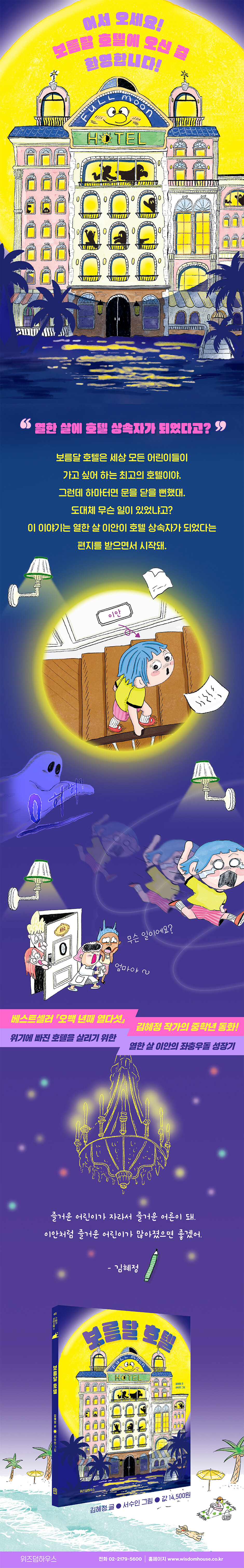 어린이 특유의 자유분방함과 엉뚱함이 선사하는 유쾌한 반전 드라마 이 책의 주인공 이안은 친구들이 보기에는 조금은 별난 아이다. 핸드폰 게임에는 관심도 없고, 개미를 관찰한다고 몇 시간이고 혼자 운동장 바닥만 들여다보고, 궁금한 게 생기면 궁금증이 풀릴 때까지 질문한다. 대부분 어른들은 그런 이안을 보며 쓸데없는 일에 시간을 쏟는다고 생각하지만 이안의 엄마 아빠는 “넌 이상한 게 아니라 특별한 거야.”라고 말해 준다. 이안의 특별함은 위기의 순간에 가장 강력한 무기가 된다. 이안은 평소 동경했던 호텔 상속자가 된다. 하지만 호텔은 유령이 나타난다는 소문 때문에 문을 닫기 일보 직전이다. 지호 지배인을 비롯한 직원들은 유령에 대한 소문을 없앨 방법만을 고민하지만, 이안은 오히려 발상을 전환해 “유령 때문에 올 수 없었다면 이제는 유령 때문에 오는 곳으로 만들면 된다!”라고 생각한다. 이안의 반짝이는 아이디어로 호텔은 오싹하지만 신나는 으히히히 유령의 집, 어린이들이 마음껏 하고 싶은 것을 할 수 있는 예스존(Yes Zone), 투명 미끄럼틀과 브이알 미끄럼틀이 있는 특별한 수영장 등이 만들어지며 어린이들이라면 누구나 가고 싶은 호텔로 거듭난다. 작가는 ‘’어린이다운 자유분방함과 엉뚱한 발상’이 세상을 바꿀 수 있음을 유쾌하게 들려준다. “호텔에 나타나는 유령의 정체를 밝혀라!” 호텔을 둘러싼 수수께끼를 풀어가는 재미 이 책의 또 다른 묘미는 호텔을 둘러싼 비밀을 파헤치는 과정이다. 독자들은 책을 읽는 내내 이안과 함께 여러 가지 수수께끼를 풀게 된다. ‘정말 유령이 나타난 걸까?’, ‘수상한 행동을 하는 리다 형의 진짜 정체는?’, ‘왜 지호 지배인은 이안에게만 유독 차갑게 대할까?’, ‘가짜 유령 소동을 꾸민 범인은 누구일까?’ 등 독자들은 퍼즐 조각을 하나씩 맞추어 가듯 이안과 함께 단서를 찾아내고 진실을 밝혀 마침내 문제를 해결하는 즐거움을 경험하게 된다. 여기에 제1회 한국그림책출판협회 그림책 공모전에서 수상하며 독창적인 화풍으로 주목받은 서수인 작가의 일러스트가 더해져 이안의 모험과 성장을 더욱 생생하게 전달한다. “즐거운 어린이가 자라 즐거운 어른이 된다!” 즐거운 어른 김혜정 작가가 어린이들에게 전하는 메시지 일 년에 100여 곳이 넘는 학교와 도서관에서 강연을 통해 수천 명의 독자를 직접 만나 온 김혜정 작가는 어린이·청소년 독자들에게 일관되게 전해온 메시지가 있다. "잘하는 것보다 좋아하는 것이 많아야 즐거운 삶을 살 수 있다." 이 책의 주인공 이안은 형처럼 공부를 잘하는 것도, 동생처럼 인기가 많은 것도 아니다. 하지만 재미난 놀이를 스스로 찾아내고 즐길 줄 안다. 다시 말해 이안은 자신이 무엇을 좋아하는지 무엇을 할 때 가장 즐거운지 아는 어린이다. 이안이 호텔 상속자가 되기로 결심한 것도 돈이나 명예보다는 호텔이라는 공간에 있을 때 가슴이 두근거리고 즐겁기 때문이다. 이안처럼 내가 무엇을 할 때 즐거운지를 찾아보자. 개미 관찰하기처럼 사소한 일이라도 괜찮다. 오늘의 즐거운 하루하루가 쌓여 내일의 단단한 나를 만들 테니까. “이안처럼 즐거운 어린이가 많아졌으면 좋겠어. 즐거운 어린이가 자라서 결국 즐거운 어른이 되거든.” _작가의 말 중에서 |