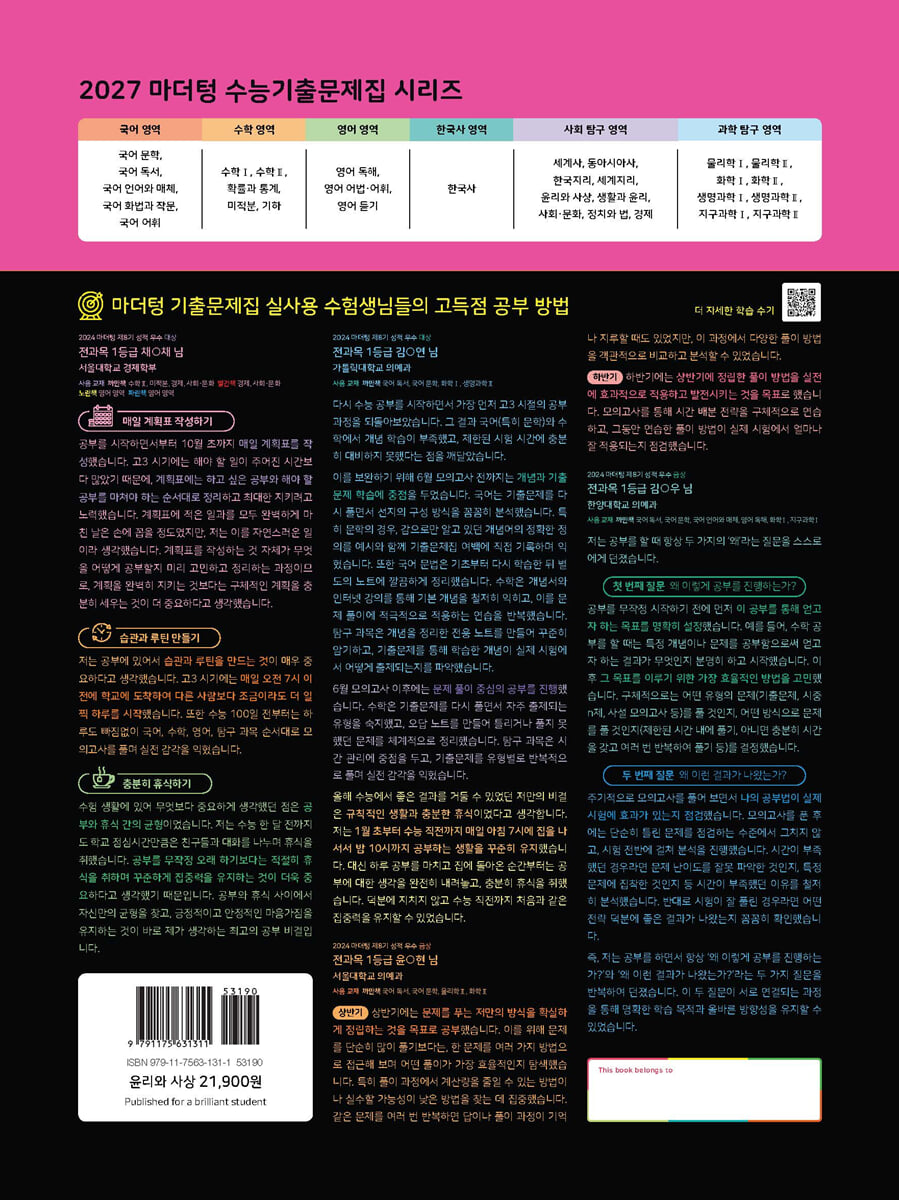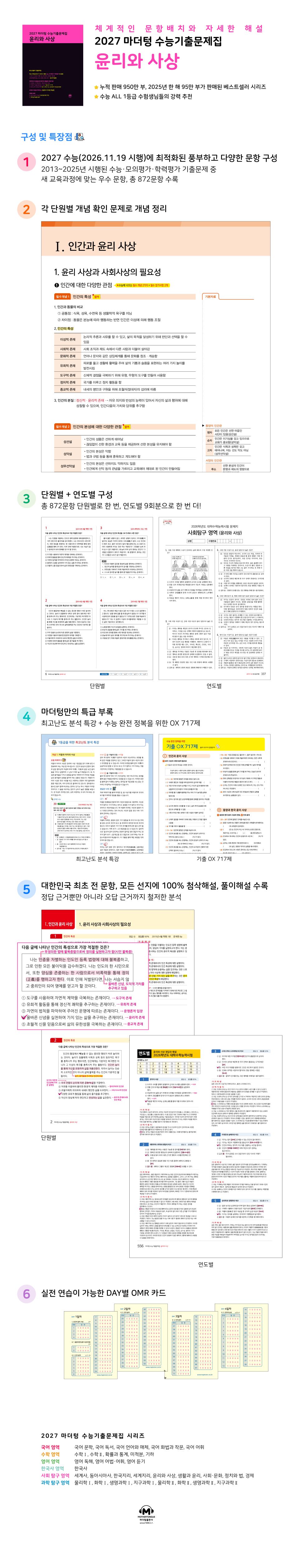 1. 윤리 사상과 사회사상의 필요성 01. 인간에 대한 다양한 관점 02. 인간의 삶에서 윤리 사상과 사회사상의 중요성 Ⅱ. 동양과 한국 윤리 사상 1. 동양과 한국 윤리 사상의 연원 01. 동양 윤리 사상의 연원 02. 한국 윤리 사상의 연원 2. 인의 윤리 01. 도덕의 성립 근거 02. 도덕 법칙의 탐구 방법 3. 도덕적 심성 01. 도덕 감정 02. 도덕 본성 4. 자비의 윤리 01. 깨달음 02. 깨달음의 길 5. 분쟁과 화합의 윤리 01. 한국 불교의 전통 02. 한국 불교 사상의 윤리적 특징 6. 무위자연의 윤리 01. 도가 사상의 전개 02. 도가 사상의 영향 7. 한국과 동양 윤리 사상의 현대적 의의 01. 한국 전통 윤리 사상의 근대적 지향성 02. 동양의 이상적 인간상과 시민 Ⅲ. 서양 윤리 사상 1. 서양 윤리 사상의 연원 01. 고대 그리스 사상과 헤브라이즘 02. 규범의 다양성과 보편 도덕 2. 덕 있는 삶 01. 영혼의 정의와 행복 02. 이론과 실천의 탁월성과 행복 3. 행복 추구의 방법 01. 쾌락의 추구와 평정심 02. 금욕과 부동심 4. 신앙과 윤리 01. 그리스도교와 사랑의 윤리 02. 구원의 윤리와 자연법 윤리 5. 도덕의 기초 01. 도덕적인 삶과 이성 02. 도덕적인 삶과 감정 6. 옳고 그름의 기준 01. 의무론과 칸트주의 02. 결과론과 공리주의 7. 현대의 윤리적 삶 01. 주체적 결단과 실존 02. 실용주의와 문제 해결의 유용성 Ⅳ. 사회사상 1. 사회사상과 이상 사회 01. 인간의 삶과 사회사상의 지향 02. 동·서양 이상 사회론의 현대적 의의 2. 국가의 윤리 01. 국가의 기원과 본질에 관한 관점 02. 국가 역할과 정당성에 대한 동 · 서양 사상 3. 시민과 윤리 01. 시민적 자유와 권리의 근거 02. 공동체와 공동선 및 시민적 덕성 4. 민주주의 01. 근대 민주주의의 지향과 자유 민주주의 02. 도덕적 자율성과 책임성 및 시민의 소통과 유대 5. 자본주의 01. 자본주의의 규범적 특징과 기여 02. 자본주의에 대한 비판과 대안들 6. 평화 01. 동·서양의 다양한 평화 사상 02. 세계 시민주의와 세계 시민 윤리의 구상 특급 부록 수능 완전 정복을 위한 기출 OX 717제 1등급을 위한 최고난도 특강 실전 연습이 가능한 DAY별 OMR 카드 연도별 2024학년도 6월 모의평가 2024학년도 9월 모의평가 2024학년도 대학수학능력시험 2025학년도 6월 모의평가 2025학년도 9월 모의평가 2025학년도 대학수학능력시험 2026학년도 6월 모의평가 2026학년도 9월 모의평가 2026학년도 대학수학능력시험 |