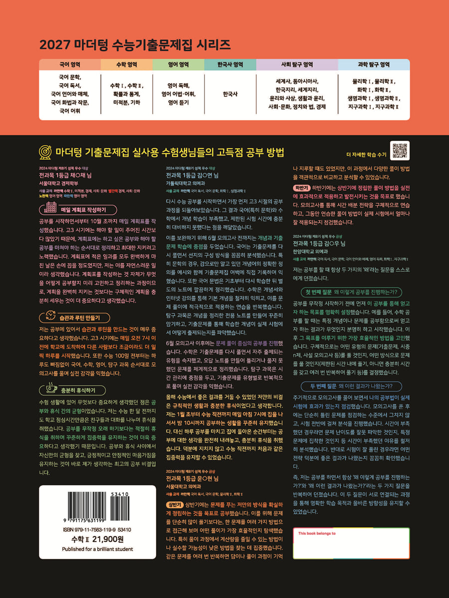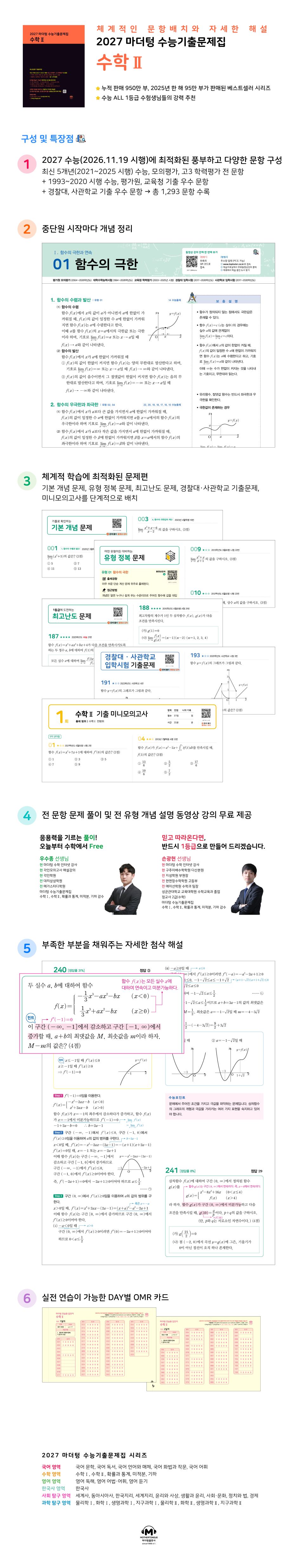 1. 함수의 극한 개념 확인 / 기본 개념 문제 유형01. 함수의 극한 유형02. 함수의 좌극한과 우극한 유형03. 함수의 극한에 대한 성질 유형04. 새롭게 정의된 함수의 극한 유형05. 0/0꼴의 극한-유리식 유형06. 0/0꼴의 극한-무리식 유형07. ∞/∞꼴의 극한 유형08. ∞-∞ 꼴의 극한 유형09. ∞×0 꼴의 극한 유형10. 인수분해를 이용한 미정계수의 결정 유형11. 유리화를 이용한 미정계수의 결정 유형12. 극한값을 이용한 함수식의 결정 유형13. 함수의 극한의 대소 관계 유형14. 함수의 극한의 활용-길이 유형15. 함수의 극한의 활용-넓이 유형16. 함수의 극한의 활용-새롭게 정의된 함수 최고난도 문제 경찰대/사관학교 입학시험 기출문제 2. 함수의 연속 개념 확인 / 기본 개념 문제 유형01. 함수의 연속을 이용한 미정계수의 결정 유형02. 연속함수의 성질 유형03. 연속함수의 성질을 이용한 진위 판정 유형04. 함수의 연속과 그래프 유형05. 새롭게 정의된 함수의 연속 유형06. 사잇값의 정리 유형07. 연속함수의 활용 최고난도 문제 경찰대/사관학교 입학시험 기출문제 Ⅱ. 미분 1. 미분계수와 도함수 개념 확인 / 기본 개념 문제 유형01. 평균변화율 유형02. 순간변화율과 미분계수의 정의 유형03. 변형된 미분계수의 결정 유형04. 다항함수의 미분법 유형05. 미분계수를 이용한 함수의 미분법: h→0 유형06. 미분계수를 이용한 함수의 미분법: x→a 유형07. 함수의 곱의 미분법 유형08. 미분가능성과 연속성 유형09. 미분가능성을 이용한 미정계수의 결정 유형10. 미분가능성을 이용한 활용 유형11. 미분법을 활용한 문제 해결 최고난도 문제 경찰대/사관학교 입학시험 기출문제 2. 도함수의 활용 개념 확인 / 기본 개념 문제 유형01. 접선의 방정식-곡선 위의 점이 주어질 때 유형02. 접선의 방정식-곡선 밖의 점이 주어질 때 유형03. 접선의 방정식-기울기가 주어질 때 유형04. 접선의 방정식의 활용-길이 유형05. 접선의 방정식의 활용-넓이 유형06. 함수의 증가, 감소 유형07. 함수의 극대, 극소와 미분 유형08. 함수의 극대, 극소의 판정 유형09. 함수의 극대, 극소의 활용 유형10. 함수의 최대, 최소와 미분 유형11. 함수의 최대, 최소의 활용 유형12. 방정식의 실근의 개수 유형13. 도함수의 방정식에의 활용 유형14. 도함수의 부등식에의 활용 유형15. 함수의 유추 유형16. 도함수를 활용한 문제 해결 유형17. 속도와 가속도 유형18. 도형의 변화율 최고난도 문제 경찰대/사관학교 입학시험 기출문제 Ⅲ. 적분 1. 부정적분과 정적분 개념 확인 / 기본 개념 문제 유형01. 부정적분의 계산 유형02. 부정적분의 활용 유형03. 부정적분과 미분의 관계 유형04. 정적분의 계산 유형05. 정적분의 성질 유형06. 정적분의 성질-구간에 따라 다르게 정의된 함수 유형07. 정적분의 성질-기함수, 우함수, 주기함수 유형08. 정적분으로 정의된 함수의 미분 유형09. 정적분으로 정의된 함수의 극한 유형10. 정적분으로 정의된 함수-적분 구간에 상수가 있을 때 유형11. 정적분으로 정의된 함수-적분 구간에 변수 x가 있을 때 유형12. 정적분의 활용 최고난도 문제 경찰대/사관학교 입학시험 기출문제 2. 정적분의 활용 개념 확인 / 기본 개념 문제 유형01. 곡선과 x축(또는 y축) 사이의 넓이 유형02. 곡선과 직선 사이의 넓이 유형03. 두 곡선 사이의 넓이 유형04. 도형의 넓이를 두 부분으로 나누는 경우 유형05. 도형의 넓이를 세 부분으로 나누는 경우 유형06. 정적분의 활용-넓이 유형07. 정적분의 활용-함수와 역함수 유형08. 정적분의 활용-수직선 위의 위치 유형09. 정적분의 활용-속도 최고난도 문제 경찰대/사관학교 입학시험 기출문제 미니모의고사 1회 미니모의고사 2회 미니모의고사 3회 미니모의고사 4회 미니모의고사 5회 미니모의고사 |