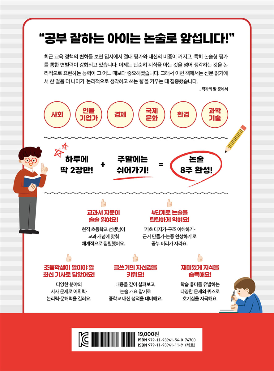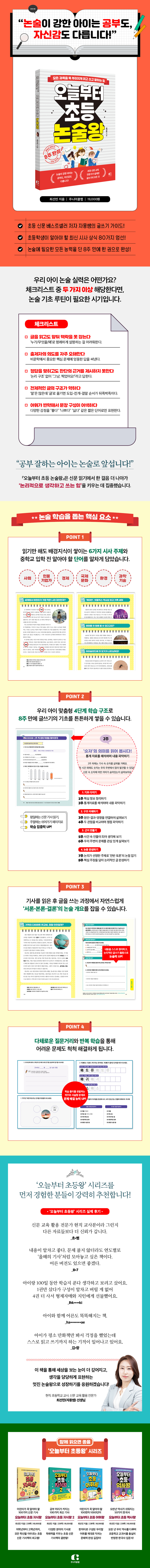 한 권으로 끝내는‘논술 8주 완성’ 교육부는 앞으로 서술형과 논술형 평가의 비중이 더욱 확대될 것이라고 밝히며, 사고력과 문제 해결력을 기르는 ‘글쓰기’ 활동의 중요성을 강조하고 있다. 실제로 수능 국어 영역에서는 철학이나 과학 등 전문 지식이 필요한 생소한 용어 문제로 변별력을 높이고 있으며, 지문을 정확히 파악했는가를 확인한다. 이제는 무엇을 알고 있는지를 넘어서 그 내용을 잘 이해했는지, 논리적으로 정리할 수 있는지가 성적을 좌우하는 시대가 되었다. 특히 다양한 관점을 비교하며 문제를 해결하는 능력은 초등 시기에 반드시 길러두어야 한다. 공부 머리가 자라는 시기에 기초를 튼튼히 다져야만 중학교 수행평가부터 고등학교 논술형 문제까지 흔들림 없이 자신의 실력을 보여줄 수 있기 때문이다. 『오늘부터 초등 논술왕』은 평일에 기사 두 편을 읽고, 주말에는 다채로운 퀴즈 활동으로 8주 동안 꾸준히 학습할 수 있도록 구성되어 있다. ‘지역 경제 살리는 싸이 콘서트’ ‘영화를 천 원에 볼 수 있다고요?’ ‘침팬지의 어머니, 제인 구달 박사 별세’ 등 신문 읽기가 낯설던 아이들도 흥미로운 기사 주제에 집중하며, 다음 읽을거리를 찾게 된다. 기사를 읽고, 전체 내용을 파악한 후, 내 생각을 쓰며 ‘글쓰기 근육’을 키운다 글쓰기 근육이 단단할수록, 교과서의 지문을 이해하는 속도가 빨라지고 내 생각을 명확하게 표현하는 게 쉬워진다. 그러나 글쓰기 근육은 단숨에 자라지 않는다. 가장 확실한 방법은 ‘글을 많이 읽고, 써 보는 것’으로 매일 조금씩이라도 읽고, 쓰고, 내 생각을 말하는 습관이 차곡차곡 쌓여야만 한다. 저자는 이러한 과정을 어려워하는 아이들을 위한 ‘3단 논술 가이드’를 제시한다. 이 가이드는 기사 내용을 정확히 이해하고, 핵심 내용을 요약하여, 내 생각을 논리적으로 정리할 수 있도록 설정하였다. 예를 들어, ‘한국 육상이 이번에 거둔 성과가 특별한 이유는 무엇인가요?’와 같은 사실 이해 문제를 통해 글의 핵심 내용을 먼저 파악하고, ‘내가 좋아하는 운동에 대해 써 보세요.’와 같은 확장 문제를 통해 글로 내 생각을 풀어낼 수 있도록 구성하였다. 주 차별로 기사를 읽어가다 보면, ‘서론-본론-결론’이 갖춰진 논리적인 글을 자연스럽게 쓸 수 있을 것이다. 전 과목의 기본인 ‘논술력’! 4단계 구조로 기초부터 단단하게 수행평가의 비중이 확대되면서 글쓰기와 발표 그리고 토론 능력의 중요성까지 커지고 있다. 이 책에서는 ‘1. 기초 다지기 → 2. 구조 이해하기 → 3. 근거 만들기 → 4. 논증 완성하기’의 4단계 구성으로 학습 능력의 기본기를 단단하게 세울 수 있도록 이끌어 준다. 단순히 빈칸을 채우는 글쓰기와는 달리 아이 스스로 사고의 흐름을 따라가며 밀도 있는 글을 완성할 수 있게 돕는다. 주 차별로 핵심 정보를 찾기, 통계 자료를 해석하기, ‘원인-결과-영향’을 연결하기, 두 관점을 비교하며 쟁점 파악하기 등 논술의 필수 기초 과정을 부담 없이 학습할 수 있도록 설계하였다. 책을 덮고 나면, 근거를 제시하여 토론하는 활동이 재미있어지고 독후 활동이나 상상 글쓰기 등 학습 활동에 자신감이 생길 것이다. 『오늘부터 초등 논술왕』을 통해 세상을 바라보는 시야를 넓히고, 깊이 있게 사고하는 힘을 키워 보자. |