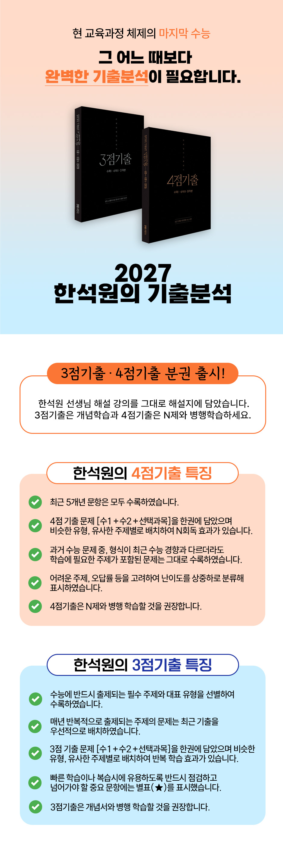 개념 학습부터 모의고사 풀이까지, 병행 학습을 통해 시너지 효과를 극대화할 수 있습니다. - 개념정리 + 3점기출 : 매단원 개념 학습을 마친 후 3점 기출 문제를 풀어보며 교과서의 개념이 문제에 적용되는 과정을 확인합니다. - 문제풀이 + 3점·4점기출 : N제 풀이와 함께 3점 기출 문제와 쉬운 4점 기출 문제를 풀어보면서 낯선 문제를 만났을 때도 해결 방법을 쉽게 떠올릴 수 있도록 훈련합니다. - 실전 모의고사 + 4점기출 : 수능 형식의 낯선 문제들을 풀면서 과거 출제 되었던 필수 주제 문항들의 여러 유형과 표현 방법들을 익히며 다양한 관점에서 사고할 수 있는 능력을 키웁니다. [고난도 4점 문항을 극복하기 위한 TIP ] 1. 단원간 연계 혹은 다개념이 결합된 형태가 많기 때문에 단편적인 지식으로 풀이에 임하기 보다는 통합된 사고가 필요합니다. 2. 특히 수학2의 경우 특정단원으로 규정짓는 순간 사고의 틀에 갇히는 경우가 비일비재하기 때문에 과목 전반의 아이디어를 가지고 풀어야 한다는 인식이 매우 중요합니다. 3. 문제의 배치순서로 해결의 실마리를 찾아가는 방법, 즉 개념이 진행되는 순서에 힌트를 얻어 풀이방법을 떠올리는 것이 아닌 실제 현장에서 낯선 문제를 만났을 때 즉각적으로 풀이 방법을 생각해낼 수 있도록 훈련하는 데 집중해야 합니다. |