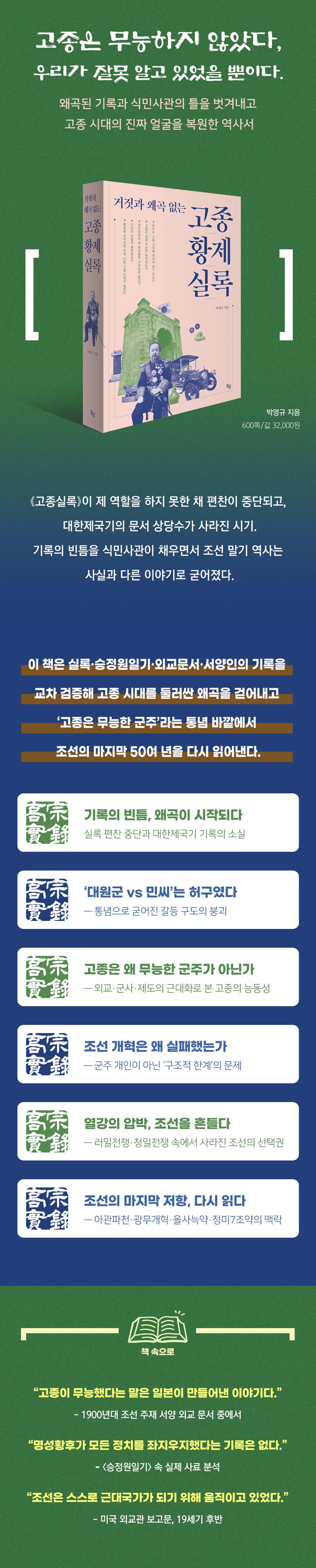 왜곡된 기록과 식만사관의 틀을 벗겨내고 고종 시대의 진짜 얼굴을 복원하다 조선 말기를 둘러싼 우리의 통념은 과연 사실일까? ‘무능한 군주 고종’, ‘대원군과 명성황후의 대립’, ‘외척의 전횡으로 나라가 기울었다’는 이야기는 익숙하지만, 실상 이 서사는 사료의 공백 속에서 만들어진 단순화된 틀이었다. 『거짓과 왜곡 없는 고종실록』은 바로 이 지점에서 출발한다. 정상적인 실록 편찬이 이루어지지 못하고, 대한제국기 문서 상당수가 사라지면서 남은 기록은 본래부터 누락이 많았다. 문제는 이러한 빈틈 위에 일본의 식민사관이 서사를 덧입히며, 고종 시대가 사실과 다른 모습으로 굳어져 왔다는 점이다. ‘대원군 vs 민씨’ 대립 구도는 사실인가? 이 책은 고종 즉위년(1863)부터 고종의 죽음과 3·1운동이 이어지는 1919년까지의 역사를 실록·승정원일기·외교문서·당대 언론·서양인의 관찰 기록 등을 교차 검증하여 재구성하였다. 저자는 사료가 말해주지 않는 공백에 주목하며, 고종 시대의 실제 권력 구조와 사건의 맥락을 다시 짚어낸다. 가장 큰 특징은 통념으로 자리 잡은 ‘대원군 vs 민씨’ 구도를 정면으로 다룬다는 점이다. 흔히 조선 말기 정치 갈등의 핵심으로 여겨지는 이 구도는 사료로는 명확하게 뒷받침되지 않는다. 대원군과 명성왕후 사이의 직접적 충돌 기록은 거의 없으며, 실제 정치적 긴장은 고종과 대원군 사이에서 나타난다. 명성왕후 역시 외세를 움직일 만한 권력이나 위치를 갖고 있지 않았다. 즉, 일본이 구성한 ‘군주 무능론’과 ‘외척 탓 프레임’이 고종 시대를 왜곡해온 셈이다. 고종은 무능한 군주인가? 책은 기존 통설과 달리 고종을 시대의 흐름을 읽지 못한 무능한 군주로 보지 않는다. 강화도조약 이후 조선은 제국주의 열강이 충돌하는 국제정세의 중심에 있었고, 고종은 그 속에서 조선을 살리기 위해 가능한 선택지를 모색했다. 미국·영국·독일 등과의 잇따른 조약 체결을 통한 외교적 균형, 별기군 창설·기기창 설치·전신망 구축 등 근대적 제도 도입, 학교 설립과 산업 정책 등은 고종의 의지가 반영된 개혁이었다. 갑오개혁과 광무개혁 또한 외세의 간섭 속에서 추진된 변화였지만, 조선이 근대국가로 나아가기 위한 중요한 시도였다. 조선의 개혁은 왜 실패했는가? 그렇다면 왜 이러한 개혁은 완전한 결실을 맺지 못했는가? 이 책은 그 원인을 고종 개인에게 돌리는 대신, 외세의 압박과 국내 정치 구조의 제약, 조정 내부의 분열이라는 복합적 요인에서 찾는다. 일본·러시아·청·미국 등 열강의 각축 속에서 조선의 선택지는 한정적이었고, 보수 세력은 변화에 강하게 저항했다. 이러한 구조적 한계 없이 ‘고종 무능론’만을 강조하는 기존 서술은 시대의 실체를 가린다는 것이 책의 문제의식이다. 조선의 몰락 또한 단순히 군주의 무능으로 설명될 수 없다. 일본은 1870년대 중반부터 조선을 군사·재정·외교 면에서 단계적으로 침투하는 전략을 취했다. 청일전쟁과 러일전쟁은 조선의 의지와는 무관하게 이 땅에서 벌어졌고, 그 승자는 곧바로 조선의 운명을 결정했다. 내부에서는 개혁을 둘러싸고 보수 세력·군부·관료·개화파 등이 갈등하며 틈을 만들었고, 일본은 이 균열을 침략의 통로로 활용했다. 결국 조선의 몰락은 외세·정세·내부 분열이 얽힌 구조적 비극이었다고 책은 설명한다. 사건이 아니라 ‘흐름’으로 조선 말기를 읽는다 『거짓과 왜곡 없는 고종실록』은 1부 ‘쇄국의 시대’, 2부 ‘개방의 시대’, 3부 ‘몰락의 시대’라는 구성 속에서 병인양요, 제너럴 셔먼호 사건, 운요호 사건과 강화도조약, 임오군란과 갑신정변, 아관파천, 대한제국 선포, 광무개혁, 을사늑약·정미7조약, 고종의 죽음과 3·1운동까지 조선 말기의 복잡한 사건을 단락 단위로 정리한다. 독자는 조선이 어떤 구조 속에서 흔들리고 무너졌는지를 흐름과 맥락으로 이해할 수 있다. 이 책은 고종을 미화하려는 것이 아니라, 사료의 누락과 편향을 걷어내고 시대의 실제 모습을 복원하려는 작업이다. 고종 시대를 새롭게 읽는 것은 곧 근대 한국사의 출발점을 다시 쓰는 일이다. 왜곡된 인식에서 벗어나 고종 시대를 입체적으로 바라보려는 독자들에게 이 책은 가장 설득력 있는 안내서가 될 것이다. |