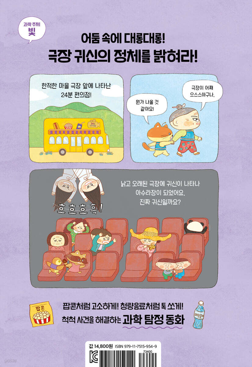 어느 한적한 마을, 오래된 극장 앞에서 다시 문을 연 ‘24분 편의점’ 버스! 그런데 낡고 허름한 극장은 관객들로 북적이는 대신, 금방이라도 귀신이 툭 튀어나올 것처럼 어두컴컴하고 한적하기만 하다. 그래서일까? 어쩐 일인지 머리카락이 쭈삣쭈삣, 소름이 쫙 돋을 공포스러운 사건들이 연달아 일어난다! 급하게 편의점으로 뛰어 들어온 첫 손님 오들 씨는 극장으로 가다 무지무지하게 커다랗고 까만 무언가에 놀라 바들바들 떨면서 도움을 청한다. 편의점 주인 ‘편사장’은 극장 앞에 가로등이 있었다는 얘기를 듣자 그 정체는 귀신이 아니라 오들 씨의 그림자였다는 사실을 ‘빛과 그림자’라는 과학적 원리로 명쾌하게 설명해 오해를 풀어 준다. 그러던 어느 날, 영화 상영 중 스크린 앞에 갑자기 귀신이 나타나 대롱거리는 사건이 일어나 발칵 뒤집힌다. 깜짝 놀란 관객들은 마구 소리를 지르며 극장 밖으로 달아나고, 그 때문에 극장은 폐업 위기에 처한다. 과연 오래된 극장에 나타난 건 진짜 귀신이었을까? 그리고 극장은 결국 문을 닫고 마는 것일까? 편사장은 번뜩이는 과학 지식과 갈고닦은 추리 실력을 발휘해 극장에서 일어난 귀신 사건을 차근차근 해결해 나간다. 《24분 편의점 3호 극장점 그림자 귀신 대소동》에는 붕어빵에 꼭 있어야 하는 단팥과 슈크림과도 같은 쌍둥이 형제 팥붕과 슈붕의 엉뚱한 활약이 약방의 감초처럼 재미와 웃음을 선사한다. 맨붕 박사의 과학 퀴즈를 두고 벌이는 배꼽 빠지는 한판 승부, 기냥이의 실수로 어마어마하게 커진 편사장을 보고 놀라 꽁무니 빠지게 도망가는 장면에선 터져 나오는 웃음을 참을 수 없다. 팥붕 슈붕과 함께 노별 박사를 쫓아 책장을 넘기다 보면 어느새 과학의 맛에 푹 빠져 있을 것이다. 극장점에서 알아보는 그림자와 거울, 렌즈를 통한 빛의 성질! 우리가 세상을 볼 수 있는 건 태양이나 전등에서 나온 빛이 모든 물체에 닿았다 튕겨 나와 우리 눈에 들어오기 때문이다. 또한 빛이 똑바로 나아가는 성질 때문에 깜깜한 밤에 손전등을 비춰 그림자 놀이를 할 수 있고, 거울에 반사되는 덕분에 매일 자신의 모습을 비춰 볼 수도 있다. 《24분 편의점 3호 극장점 그림자 귀신 대소동》은 빛의 성질을 통해 우리가 눈으로 보는 것의 허와 실, 즉 착시와 현실의 차이에 대해 과학적으로 알려 주는 흥미진진한 이야기다. 우리는 빛의 성질과 빛에 관한 다양한 현상 그리고 원리로 세상을 본다. 하지만 우리가 눈으로 보는 모든 것이 진짜는 아니다. 빛은 반사되기도 하고, 굴절되기도 하고 산란되기도 하기 때문이다. 이번에는 24분 편의점과 오래된 극장에서 일어나는 사건들을 통해 빛의 여러 가지 특성에 대해 알게 된다. 눈으로 물체를 보는 원리, 그림자의 특징, 빛의 직진, 평면거울의 빛 반사, 카메라에 상이 맺히는 원리 등등 말이다. 숟가락 놀이를 통해서는 볼록 거울이나 오목 거울의 특성과 차이점도 알 수 있다. 또 카메라의 원리를 이용해 귀신을 등장시킨 사건을 과학의 눈으로 해결함으로써 오싹오싹한 집중력과 후련한 통괘함을 선사한다. 그 밖에도 24분 편의점이 제공하는 [깜짝 쿠폰]에는 ‘적외선 카메라로 어떻게 밤에도 볼 수 있나요?’, ‘전자레인지는 어떻게 음식을 데울까요?’, ‘왜 숟가락이 거울처럼 비쳐 보일까요?’가 담겨 있어 처음부터 끝까지 빛을 둘러싼 과학 개념이 꽉 차게, 알차게, 지루하지 않게 담겨 있다. ★★ 초등 과학 교과 연계 [5학년 1학기] 2. 빛의 성질 |