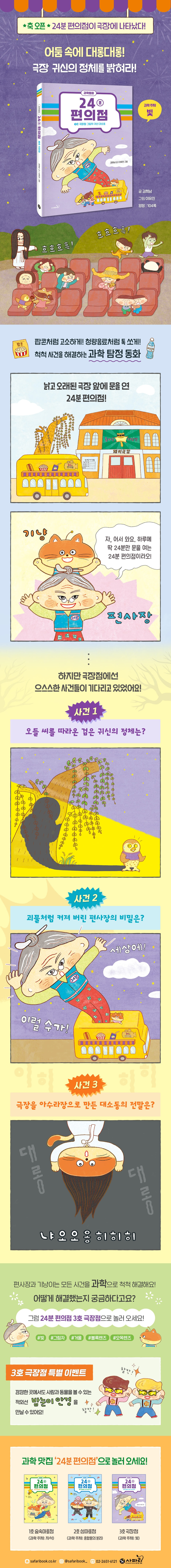 2. 밤눈이 작전 개시 3. 어둠이 무서워 4. 할머니 또는 괴물 5. 작아져라, 반사 반사 6. 귀신이 나타났다 7. 영사실의 비밀 8. 또다시 부릉부릉 · 알바생 기냥이의 3호점 알바 생생 체험기 · 맛있게 과학을 즐기는 법 · 24분 편의점 깜짝 쿠폰 |