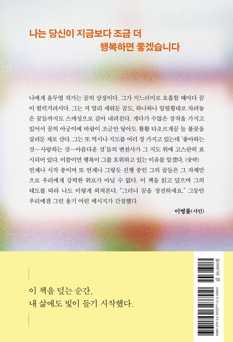 윤두열 작가는 《우리 밝은 쪽으로 걷자》를 통해 세상의 조각조각들을 사랑으로 스캔하고 사랑으로 발화시킨다. 그의 ‘시선’과 ‘가슴’의 재능이 물컹하게 만져진다. 이제 사랑의 힘이 그에게 신념이 되었으니 사랑의 전능으로 만능에 도달할 것이다. 언제나 시작 중이며 또 언제나 그렇듯 진행 중인 그의 꿈들은 그 자체만으로 우리에게 강력한 위로가 아닐 수 없다. 이 책을 읽고 덮으며 그의 태도를 따라 나도 이렇게 외쳐본다. “그러니 꿈을 장전하세요.” 그동안 우리에겐 그런 용기 어린 메시지가 간절했다. - 이병률 (시인) |