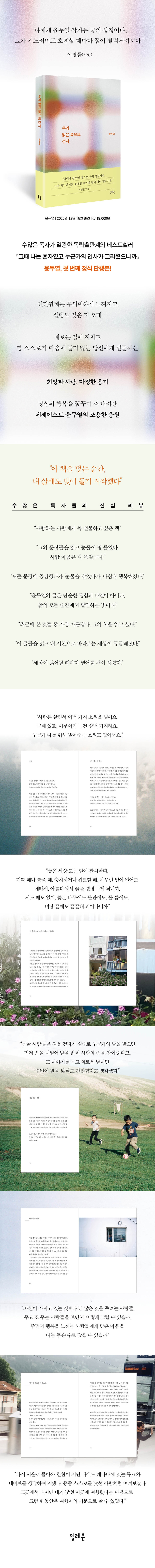수년 간 독립출판으로 독자들과 깊이 호흡해온 윤두열 작가가 첫 정식 단행본 《우리 밝은 쪽으로 걷자》를 펴냈다. 그동안 알음알음 그의 글을 찾아 읽던 팬들 사이에서 “단순한 경험의 나열이 아닌, 삶의 모든 순간에서 발견하는 빛”이라는 찬사를 받아온 그의 문장이 마침내 더 넓은 세상으로 나온 것이다. 그간 세 권의 독립출판물을 통해 마음에 콕콕 박히는 문장과 위로를 전하며 이름을 알린 저자는, 《우리 밝은 쪽으로 걷자》를 통해 더욱 깊고 정제된 시선으로 써 내려간 102편의 이야기를 선보인다. “사람은 살면서 이백 가지 소원을 빌어요. 근데 있죠, 이루어지는 건 삼백 가지래요. 누군가 나를 위해 빌어주는 소원도 있어서요.” (-본문 142쪽, 〈소원〉 중에서) 윤두열의 문장은 이미 수많은 사람들의 마음을 울린 바 있다. MBC 라디오 ‘별이 빛나는 밤에’의 오프닝멘트, 유명 작가의 에세이, 그리고 수많은 SNS에서 공유된 〈소원〉이라는 글이다. 얼굴도 모르는 누군가를 위해 말없이 빌어주는 소원처럼, 작가의 조용한 응원은 책을 넘어 멀리멀리 퍼져나가 독자들의 마음 깊은 곳을 두드렸다. 《우리 밝은 쪽으로 걷자》에는 독립출판물에서 먼저 선보여 유명해진 이 〈소원〉이라는 글의 비하인드 스토리를 공개하기도 했다. 무너진 마음을 다시 세우는 데는 거창한 말이 필요 없다. 진심 어린 이야기 하나면 충분하다. 《우리 밝은 쪽으로 걷자》에 담긴 이야기는 마치 어둠에서 빛으로 나아가는 여정과 같다. 저자는 낯선 세상에 기꺼이 자신을 던져 세상을 바라보는 시선을 환기하고(1장. 날마다 새로운 이름으로 사는 사람), 나를 둘러싼 일상과 사람의 소중함을 재발견한다(2장. 꽃은 세상 모든 일에 관여한다). 무너진 마음을 일으키는 방법을 몰라 헤매던 날들의 기록을 솔직하게 고백하며(3장. 나를 위해 빌어주는 소원), 마침내 스스로를 사랑하고 행복을 발견할 ‘밝은 쪽’으로 발걸음을 옮긴다(4장: 이 이야기의 주인공). 무너진 마음을 다시 세우는 데는 거창한 말이 필요 없다. 《우리 밝은 쪽으로 걷자》에 담긴 글처럼 진심 어린 이야기 하나면 충분하다. 이 책을 다 읽고 나면 “세상이 싫어질 때마다 열어볼 책이 생겼다”는 어느 독자의 리뷰처럼, 당신 곁에도 든든하고 아름다운 마음의 피난처가 하나 생길 것이다. |