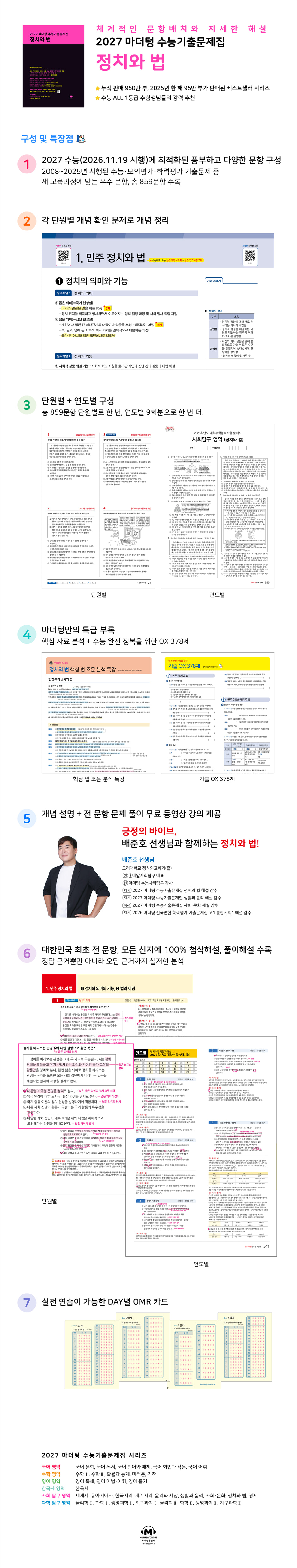 정치와 법 핵심 법 조문 분석 특강 1. 민주 정치와 법 01. 정치의 의미와 기능 02. 법의 이념 2. 민주주의와 법치주의 01. 민주주의 의미와 발전 과정 02. 민주주의와 법치주의 3. 헌법의 의의와 기본 원리 01. 헌법의 의미와 의의 02. 헌법의 기본 원리 4. 기본권의 보장과 제한 01. 국민의 기본권 02. 기본권의 제한 5. 정부 형태 01. 정부 형태 02. 우리나라의 정부 형태 6. 우리나라의 국가 기관과 지방 자치 01. 국회 02. 행정부 03. 법원과 헌법 재판소 04. 입법부, 행정부, 사법부 간의 견제와 균형 05. 지방 자치 7. 정치 과정과 정치 참여 01. 정치 과정의 이해 02. 시민의 정치 참여 8. 선거와 선거 제도 01. 선거의 기능 02. 선거 제도 03. 우리나라 선거 제도의 특징 04. 선거 결과 분석 9. 정치 참여 주체와 시민 참여 01. 정당 02. 이익 집단과 시민 단체 03. 언론 10. 민법의 의의와 기본 원리 01. 민법의 의의와 기능 02. 민법의 기본 원리 11. 재산 관계와 법 01. 계약의 이해 02. 불법 행위와 손해 배상 12. 가족 관계와 법 01. 가족 간의 법률관계 02. 상속 13. 형법의 이해 01. 형법과 죄형 법정주의 02. 범죄와 형벌 14. 형사 절차와 인권 보장 01. 형사 절차의 이해 02. 형사 절차에서의 인권 보장 15. 근로자의 권리 보호 01. 근로자의 권리 보호 16. 국제 관계와 국제법 01. 국제 사회의 형성과 변화 02. 국제법의 법원(法源)과 특징 17. 국제 문제와 국제 기구 01. 국제 문제와 국제 기구 특급 부록 수능 완전 정복을 위한 기출 OX 378제 실전 연습이 가능한 DAY별 OMR 카드 연도별 2024학년도 6월 모의평가 2024학년도 9월 모의평가 2024학년도 대학수학능력시험 2025학년도 6월 모의평가 2025학년도 9월 모의평가 2025학년도 대학수학능력시험 2026학년도 6월 모의평가 2026학년도 9월 모의평가 2026학년도 대학수학능력시험 |