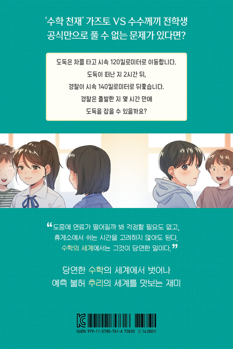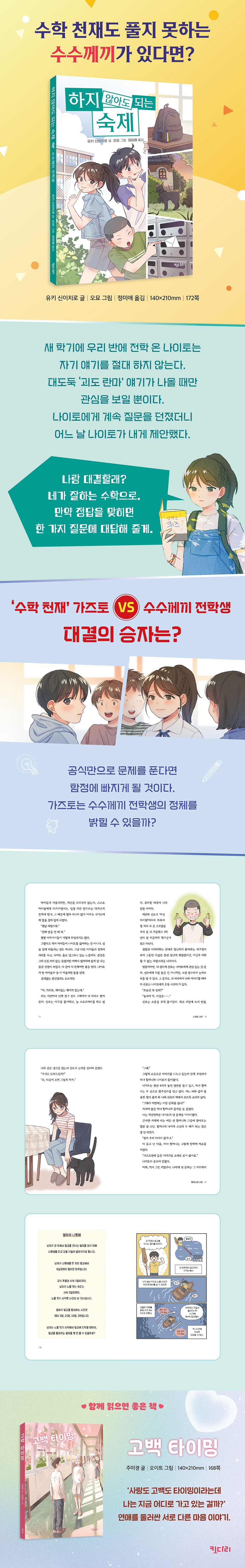 항상 수학 시험에서 만점을 받고 고등학교 수학까지 척척 이해하는 수학 천재 가즈토는 새 학기에 전학 온 수수께끼 전학생 나이토의 정체를 밝히기 위해 나이토와 수학 대결을 벌입니다. 나이토가 내는 수학 서술형 문제를 가즈토가 맞히면 가즈토의 질문 한 가지에 나이토가 답하는 방식으로 진행합니다. 학구산이라고 하는 일차 연립 방정식, 속력을 구하고 비교하는 여행자 계산 문제, 비율 개념을 활용하는 나이 계산 문제 등 책에 수록된 다섯 개의 문제는 풀이 과정은 어렵지 않지만 수학 실력만으로 술술 풀리지 않습니다. 문제를 풀기 위해서는 배경지식과 통찰력 그리고 추리력을 갖춰야 합니다. 수학 공식만을 대입해 푼 가즈토는 결국 문제를 맞히지 못합니다. 독자는 《하지 않아도 되는 숙제》를 읽으며 가즈토와 함께 나이토가 내는 문제들을 풀고 나이토의 정체를 추리해 나갈 수 있습니다. 쉽게 파악할 수 있도록 문제를 만화로도 설명하고 있어, 평소 수학에 거부감을 느끼는 독자들도 가즈토의 문제 접근 방식을 따라가며 문제를 이해하고 이야기에 몰입할 수 있습니다. 수수께끼 전학생의 정체는? 지난 여름방학, 3인 가족으로 이루어진 대도둑 ‘괴도 란마’가 미술관에서 그림을 훔치고 지금까지 자취를 감추었습니다. 소문을 좋아하는 같은 반 신조는 나이토가 바로 괴도 란마라고 주장합니다. 나이토가 여름방학이 끝난 직후에 전학 왔고, 괴도 란마 얘기가 나올 때만 나이토가 반응을 보였기 때문입니다. 가즈토는 신조를 엉뚱하다고 여기며 반신반의합니다. 하지만 주변에서 수상한 일이 벌어질 때마다 가즈토의 머릿속에 신조의 말이 떠오릅니다. 골목길로 들어서자마자 갑자기 사라진 나이토, 검은 고양이와 수상한 저택에서 지내면서 가즈토와 신조를 맞이해 주는 마녀 할머니와 그 저택에 드나드는 담임 선생님 그리고 최근 들어 마을을 자주 순찰하는 경찰차까지. 과연 이 모든 것은 우연일까요? 신조의 주장대로 나이토는 정말 괴도 란마일까요? 《하지 않아도 되는 숙제》는 신초 미스터리 대상과 일본 추리작가협회상을 수상한 작가 유키 신이치로가 쓴 추리 동화로, 책장을 넘기며 결코 쉽게 드러나지 않는 나이토의 비밀을 차근차근 추리해 가는 즐거움을 맛볼 수 있습니다. 당연한 세계에서 벗어나 새로운 세계로 현실에서는 나룻배의 노를 3시간이나 젓는 것이 불가능에 가깝지만 수학의 세계에서는 그런 어려움은 고려할 필요 없습니다. 달리는 자동차에 연료가 떨어질까 봐 걱정할 필요도 없고, 휴게소에서 쉬는 시간을 고려하지 않아도 됩니다. 이렇듯 수학의 세계는 현실 세계와 다르게 당연하게 생각하고 넘어갈 수 있는 일들로 가득합니다. 수학의 세계에 익숙했던 가즈토는 나이토와 대결하면서 많은 것이 당연한 수학의 세계에서 벗어나 새로운 시각으로 문제를 마주하고, 친구에게 진심을 전하는 법을 알아 가게 됩니다. 자주 전학을 다니면서 늘 혼자 있는 것에 익숙했던 나이토는 가즈토와 신조가 내미는 손을 잡고 함께 추억을 쌓아 갑니다. 동시에 이별 후에 친구들에게 잊힐까 봐 두려움을 느낍니다. 나이토는 선생님에게 제출할 필요 없고, 성적과도 상관없는 ‘하지 않아도 되는 숙제’인 수학 문제를 통해 친구들이 자신을 잊지 않고 기억해 주기를 바랐습니다. 수학 대결은 가즈토와 나이토가 친구와의 추억을 오랫동안 간직하는 방식입니다. 《하지 않아도 되는 숙제》는 서로에 대한 작은 관심에서 시작된 대결로 인해 아이들이 익숙한 방식에서 벗어나 새로운 세계로 발을 내딛는 과정을 담은 동화입니다. 교과 연계 국어 5학년 1학기 〉 2. 작품을 감상해요 국어 6학년 1학기 〉 6. 내용을 추론해요 국어 6학년 2학기 〉 1. 작품 속 인물과 나 |