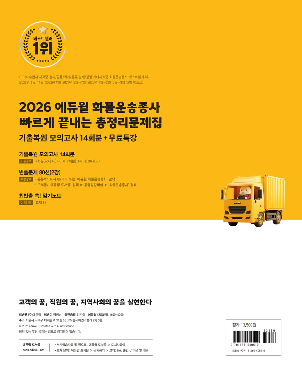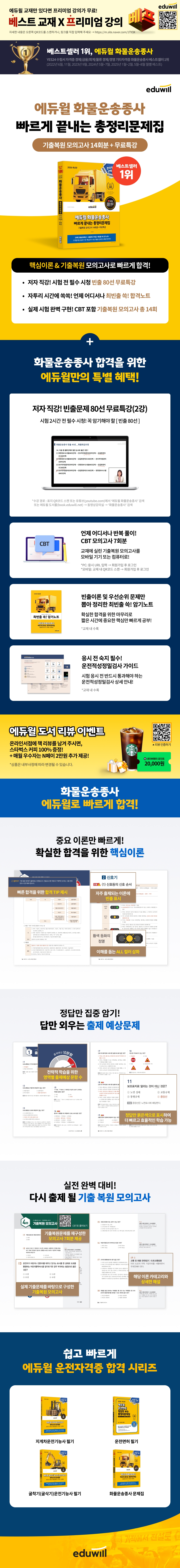 CHAPTER 01 도로교통법령 CHAPTER 02 교통사고처리특례법 CHAPTER 03 화물자동차운수사업법령 CHAPTER 04 자동차관리법령 CHAPTER 05 도로법령 CHAPTER 06 대기환경보전법령 PART 02 화물취급요령 CHAPTER 01 운송장 작성과 화물포장 CHAPTER 02 화물의 상하차 CHAPTER 03 적재물 결박 덮개 설치 CHAPTER 04 운행요령 CHAPTER 05 화물의 인수인계요령 CHAPTER 06 화물자동차의 종류 CHAPTER 07 화물운송의 책임한계 PART 03 안전운행요령 CHAPTER 01 운전자 요인과 안전운행 CHAPTER 02 자동차 요인과 안전운행 CHAPTER 03 도로 요인과 안전운행 CHAPTER 04 안전운전방법 CHAPTER 05 가짜 석유 관련 안내 PART 04 운송서비스 CHAPTER 01 직업운전자의 기본자세 CHAPTER 02 물류의 이해 CHAPTER 03 화물운송서비스의 이해 CHAPTER 04 화물운송서비스와 문제점 기출복원 모의고사 제1회 기출복원 모의고사 제2회 기출복원 모의고사 제3회 기출복원 모의고사 제4회 기출복원 모의고사 제5회 기출복원 모의고사 제6회 기출복원 모의고사 제7회 기출복원 모의고사 특별부록 최빈출 쓱! 암기노트 운전적성정밀검사 가이드(PDF) |