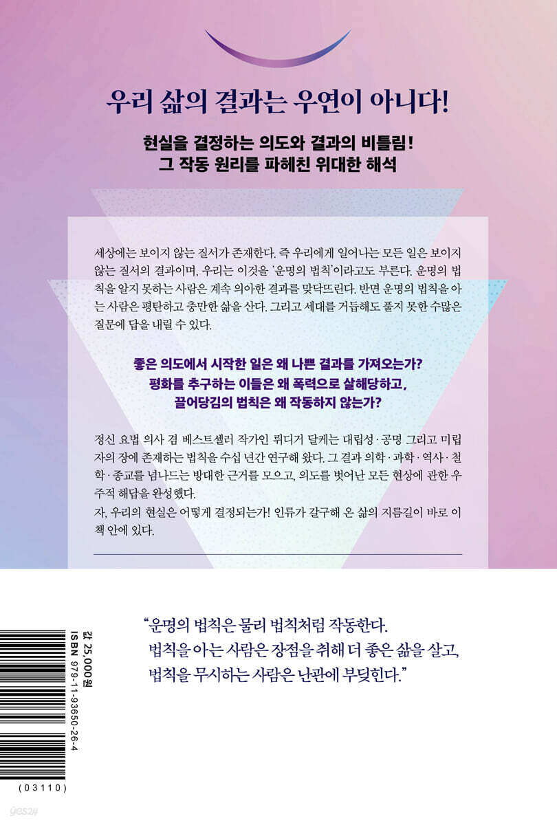 우리 삶에 뿌리박고 있는 ‘보이지 않는 질서’에 관하여! 『보이지 않는 질서』는 정신 요법 의사이자 심리 치료사 뤼디거 달케가 약 20년간의 연구 결과를 정리한 베스트셀러이다. 저자는 의사, 심리 치료사로 일하는 동안 이 세상에 ‘보이지 않는 질서(혹은 ‘운명의 법칙’)’가 존재한다는 사실을 깨닫는다. 많은 의약품보다 플라세보 효과가 더 강력한 힘을 발휘하고, 선한 의도가 오히려 부정적 결과를 가져오며, 평화를 외치던 정치인과 사상가들이 폭력에 의해 사라지는 역사의 패턴이 특정한 시대나 지역의 예외적인 사건이 아니라, 인류 역사 전반에 걸쳐 반복되는 하나의 법칙임을 저자는 방대한 사례와 자료로 증명해 냈다. 저자는 의학·과학·역사·철학·종교는 물론 심리 치료사로서의 경험을 예로 들며 세상 곳곳에 촘촘히 뿌리내린 ‘보이지 않는 질서’를 단계적으로 설명한다. 이 책은 독일에서 첫 출간되어 이제껏 장기 베스트셀러로 자리하고 있으며, 2014년에는 다큐멘터리 영화로도 개봉하여 큰 사회적 센세이션을 일으켰다. 우리의 현실은 어떻게 결정되는가! 대AI 시대를 대비하게 해줄 N개의 법칙 이 책에는 세상의 수수께끼를 풀어줄 수많은 법칙이 수록되어 있다. 예를 들어 ‘공명의 법칙’은 ‘시크릿’이라 알려진 끌어당김의 법칙이며, ‘대립의 법칙’은 빛과 어둠, 평화와 폭력처럼 세상의 모든 것이 대립을 이루고 있다는 법칙이다. 그 외 시작 안에 모든 것이 존재한다는 ‘시작의 법칙’, 부분이 곧 전체이고 전체가 곧 부분이라는 ‘파르스프로토토 법칙’ 등이 있다. 뤼디거 달케는 ‘독일은 2006년 월드컵 때 어떻게 3강을 차지했는가’, ‘폴크스바겐에서 내놓은 자동차 파에톤은 어째서 실패했는가’, ‘왜 독일은 해커와의 전쟁에서 패배한 한편 미국은 (결과적으로) 승리했는가’ 등 흥미로운 역사들을 예로 들며 보이지 않는 질서를 설명한다. 또 ‘마약 중독자들에게 가장 효과적인 치료법은 무엇인가’, ‘왜 사람들은 훌륭한 오디오 장치를 집에 두고도 콘서트에 가는가’ 등 일상적인 예시도 실어 우리의 삶에 도움을 주는 한편 대AI 시대에 우리가 무엇을 준비해야 하는지에 대해서도 알려준다. 끌어당김의 법칙은 왜 작동하지 않는가 끌어당김의 법칙은 두 번째로 중요한 법칙일 뿐! 뤼디거 달케에 따르면 각 법칙들은 동등하지 않다. 예를 들어 우리가 흔히 아는 ‘공명의 법칙(끌어당김의 법칙)’은 세상에서 두 번째로 중요한 법칙이다. 공명의 법칙 위에는 모든 것에 양면이 존재한다는 ‘대립의 법칙’이 존재하고, 피라미드의 꼭짓점에는 ‘단일성’이 존재한다. 태초의 자연이 그러했듯 결국 모든 것은 화합과 공생, 즉 단일성을 통해서만 발전할 수 있다. 이 법칙을 무시하고 성공한 예는 역사적으로도 좀처럼 찾아보기 어렵다. 이런 위계는 끌어당김의 법칙이 왜 작동하지 않는지도 설명해 준다. 예를 들어 빛과만 공명하려는 사람은 필연적으로 그림자를 맞닥뜨린다. 대립의 법칙이 끌어당김의 법칙보다 위에 있기 때문이다. 그림자는 억누를수록 더 강한 모습으로 나타난다. 이럴 때는 대립의 법칙을 따라 그림자의 존재를 인정하고 포용해야 한다. 하지만 시크릿 추종자들은 이러한 위계를 모르기 때문에 왜 생각이 현실이 되지 않느냐며 의아해한다. 시크릿 전문가에게 이런 질문을 해도 결과는 마찬가지다. 그들은 당신의 믿음이 부족하다고 답하거나, 당황해하며 말을 돌린다. 하나의 법칙만 알아서는 원하는 미래를 가져올 수 없다. 보이지 않는 질서와 그것들의 위계를 알아야 우리가 원하는 것을 삶에 들어오게 할 수 있다. |