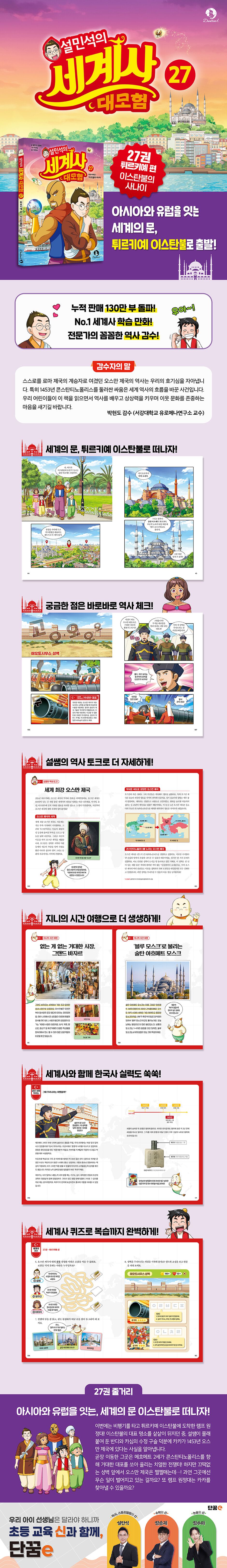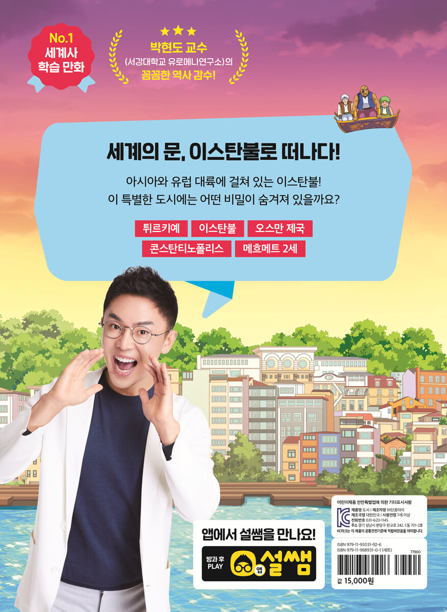 램프의 요정 지니가 열어 준 시간의 문으로 세계사 모험을 떠나는 램프 원정대! 긴장감 넘치는 세계사 현장을 생생하게 경험할 수 있어요. 이번에는 세계의 문, 이스탄불로 떠나요. 2. ‘설쌤의 역사 체크’로 세계사 지식을 쌓아요! 만화를 읽다가 궁금한 점이 생긴다면? 깜짝 등장하는 ‘설쌤의 역사 체크’를 놓치지 마세요. 다양한 세계사 지식도 얻고, 만화도 더 재미있어질 거예요. 튀르키예 전문가의 꼼꼼한 감수로, 더욱 알찬 정보를 만날 수 있어요. 3. ‘설쌤의 역사 토크’로 세계사를 더 깊이 이해해요! 설쌤이 만화에 미처 담지 못한 세계사 이야기를 들려줘요. 궁금했던 이야기를 자세히 들어 보며, 세계사를 더 깊이 이해할 수 있어요. 4. ‘지니의 시간 여행’으로 의미 있는 장소를 둘러보아요! 램프 원정대가 방문한 장소와 여러분이 꼭 가 보았으면 하는 장소를 뽑아 보았어요. 그곳은 어떤 곳인지, 그곳에서 무엇을 보고 느낄 수 있는지 알아보아요. 5. 퀴즈를 풀며 세계사 실력을 키워요! ‘술술 풀리는 세계사 퀴즈’로 내용을 복습하고 세계사 실력을 스스로 확인해 보세요. 여러 가지 역사 퀴즈를 통해 사고력과 문제 해결 능력을 키울 수 있어요. 6. 세계사와 한국사를 비교하며 함께 배워요! ‘같은 시대 우리는’을 통해 튀르키예와 우리나라 역사를 비교해 보아요. 같은 시대 우리나라에 어떤 일이 일어났는지 알아보며, 세계사와 함께 한국사 지식을 키워 나가요. |
