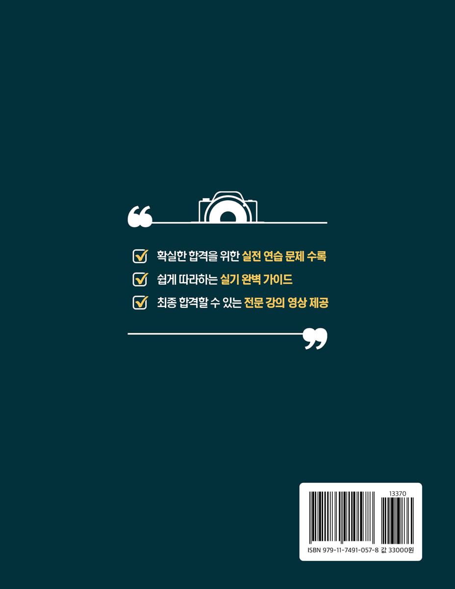 안녕하세요! 저자 찐군입니다. 제 유튜브 채널 ‘찐군’을 통해 사진기능사 자격증을 준비하는 많은 분들과 소통하며 함께 성장해왔습니다. 2025년 한 해 동안 여러분과 온라인으로 만나 공부하고 도전하는 과정을 보 며 큰 보람을 느꼈습니다. 여러분의 열정과 노력은 저에게도 큰 동기부여가 되었습니다. 그동안 사진기능사 자격증을 준비하면서 많은 분들이 겪는 공통된 어려움을 보았습니다. 특히, 기존의 사 진기능사 자격증 관련 유튜브 강의 영상들이 너무 오래되어 현재 시점과 동떨어진 내용이 많았습니다. 이를 보완하기 위해 최신 내용을 반영한 강의 영상을 제작하였고, 함께 더 효율적으로 공부할 수 있도록 이 교재를 출판하게 되었습니다. 이 교재는 사진기능사 시험 준비에 필요한 모든 핵심 내용을 체계적으로 정리하였으며, 파트별로 중요한 문제와 해설을 담아 이론 공부를 효과적으로 할 수 있도록 구성하였습니다. 또한, 실전 연습문제를 통해 실제 시험과 같은 환경에서 연습할 수 있도록 하여 학습한 내용을 확실히 다질 수 있도록 했습니다. 또한 실기 내 용은 기존 교재의 부족한 부분을 철저히 보강하여 실전에서 꼭 필요한 준비 과정을 담았습니다. 여러분의 합격이라는 목표를 향해 나아가는 여정에 이 교재가 든든한 동반자가 되기를 진심으로 바랍니 다. ‘혼자가 아니라 함께’라는 마음으로, 여러분의 도전을 응원하고 지지하겠습니다. 제 유튜브 채널에서도 여러분들의 합격을 위해 도움 될 만한 유용한 영상들을 계속 업로드할 예정이니 많은 관심 부탁드립니다. 교재 출판에 많은 응원과 도움 주신 모든 분들께 감사드립니다. 그리고 수험생분들의 합격을 진심으로 기 원합니다! |