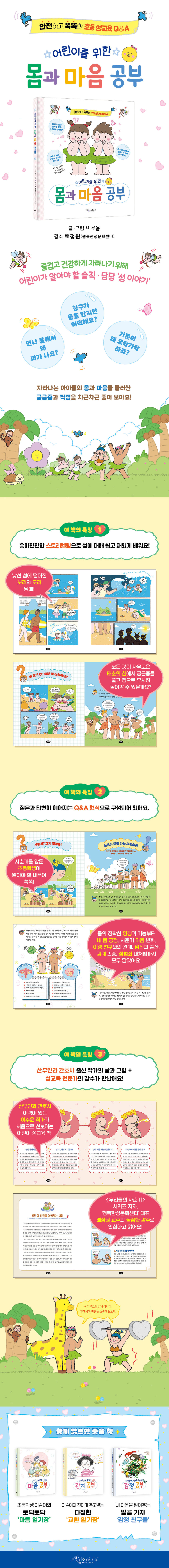 1. 내 몸이 알쏭달쏭 내 몸이 부끄러운데 어떡해요? 몸에도 이름이 있다고요? 씻는 게 그렇게 중요한가요? 내 몸은 왜 이렇게 생겼죠? 더 알아보아요: 저마다의 개성 있는 몸 2. 사춘기, 몸이 보내는 신호 사춘기? 그게 뭐예요? 언니 몸에서 왜 피가 나요? 형이 오줌을 싼 거예요? 몸이 자라면 어른 아니에요? 더 알아보아요: 사춘기를 지혜롭게 보내는 방법 3. 사춘기, 마음이 흔들흔들 기분이 왜 오락가락하죠? 가슴이 답답할 땐 어떡해요? 그 친구만 보면 왜 떨리죠? 친구랑 친해질 수 있을까요? 더 알아보아요: 우정과 사랑을 경험하는 시기 4. 사랑과 생명 탄생의 비밀 아기는 어떻게 생겨요? 아기는 왜 뱃속에 오래 있어요? 아기는 어디로 나오는 거예요? 나도 아기를 키워도 되나요? 더 알아보아요: 가족의 의미와 생명의 귀중함 5. 내 몸을 지키는 방법 친구가 몸을 만지면 어떡해요? 낯선 어른이 말을 거는데요? 인터넷에 친구 사진을 올려도 돼요? 남녀는 다르지만 같다고요? 더 알아보아요: 나를 지키고 남을 존중하는 방법 에필로그 |