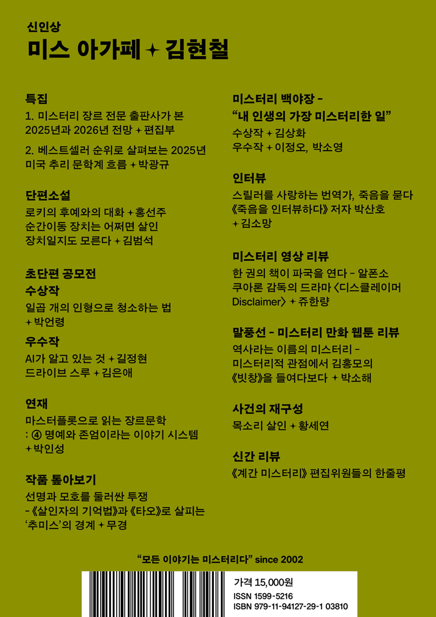 [특집] 1. 미스터리 장르 전문 출판사가 본 2025년과 2026년 전망_편집부 2. 베스트셀러 순위로 살펴보는 2025년 미국 추리 문학계 흐름_박광규 [신인상] 수상작|미스 아가페_김현철 수상자 인터뷰 심사평 [단편소설] 로키의 후예와의 대화_홍선주 순간이동 장치는 어쩌면 살인 장치일지도 모른다_김범석 [연재] 마스터플롯으로 읽는 장르문학 : ④ 명예와 존엄이라는 이야기 시스템_박인성 [초단편 공모전] 대상|일곱 개의 인형으로 청소하는 법_박언령 우수상|AI가 알고 있는 것_길정현, 드라이브 스루_김은애 [작품 톺아보기] 선명과 모호를 둘러싼 투쟁 -《살인자의 기억법》과 《타오》로 살피는 ‘추미스’의 경계 무경 [미스터리 백야장 - “내 인생의 가장 미스터리한 일”] 수상작|김상화 우수작|이정오, 박소영 [인터뷰] 스릴러를 사랑하는 번역가, 죽음을 묻다 -《죽음을 인터뷰하다》 저자 박산호_김소망 [미스터리 영상 리뷰] 한 권의 책이 파국을 연다 - 알폰소 쿠아론 감독의 드라마 〈디스클레이머 Disclaimer〉_쥬한량 [말풍선 - 미스터리 만화 웹툰 리뷰] 역사라는 이름의 미스터리 - 미스터리적 관점에서 김홍모의 《빗창》을 들여다보다_박소해 [사건의 재구성] 목소리 살인_황세연 [신간 리뷰] 《계간 미스터리》 편집위원들의 한줄평 2025 가을호 독자 리뷰 |