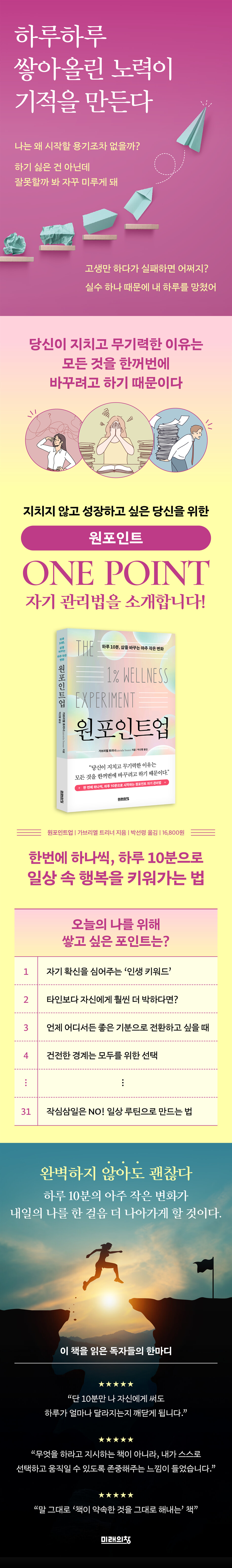 하루 10분, 한 번에 하나씩 부담 없이 시작하는 요즘 자기계발의 새로운 흐름 아주 작은 시간만 투자해도 오늘 하루가 달라질 수 있다. 그러나 우리는 늘 시작을 미루고, 완벽해야 한다는 부담에 시도조차 하지 않으며, 작은 실수 하나에도 하루 전체가 무너진 것처럼 흔들린다. 자기계발이 어려운 이유는 의지가 부족해서가 아니라, 모든 것을 한꺼번에 바꾸려 하기 때문이다. 나를 위한 하루 1%의 투자 《원포인트업》은 이 지점에서 조금은 다른 시작점을 제안한다. 한 번에 모든 것을 바꾸려 하지 말고, 하루에 단 하나, 단 10분만 나를 위해 쓰자는 것이다. 깨어 있는 시간의 1%, 약 10분. 이 짧은 시간을 ‘하나의 포인트’에만 집중하도록 설계한 것이 바로 이 책이 말하는 원포인트업의 핵심이다. 이 책에는 명상, 감사, 휴식, 습관, 자기 돌봄, 관계, 수면, 기록 등 일상에 바로 적용할 수 있는 31가지 포인트가 담겨 있다. 하루에 하나씩만 실천해도 한 달이 걸리는 비교적 짧은 프로젝트지만, 그 효과는 결코 가볍지 않다. 거창한 목표 대신 “오늘은 이거 하나만 해보자”라는 현실적인 선택이 삶의 관성을 조금씩 바꾸기 때문이다. 《원포인트업》이 특별한 이유는 정답을 제시하지 않기 때문이다. 이 책은 모든 사람에게 똑같은 성공 공식이나 완벽한 해법을 강요하지 않는다. 대신 독자가 스스로에게 묻도록 이끈다. 나는 무엇에 지쳐 있는가, 무엇이 나에게 힘을 주는가, 어떤 방식이 나와 잘 맞는가. 책의 순서를 따라가도 좋고, 그날 그날 마음이 끌리는 포인트를 골라도 된다. 이 과정 속에서 독자는 자신만의 리듬과 에너지를 발견하고, 결국 ‘나에게 맞는 성장 방식’을 만들어가게 된다. 완벽하지 않아도 괜찮아! 저자는 자신 역시 ‘회복 중인 완벽주의자’였다고 고백한다. 잘해야 한다는 압박이 얼마나 많은 시도를 가로막아왔는지, 그래서 아예 시작조차 하지 않게 만들었는지를 솔직하게 이야기한다. 그래서 이 책이 주는 메시지는 단순하다. “그냥 한 번 해볼 뿐.” 잘해내야 할 필요도, 매일 빠짐없이 해야 할 의무도 없다. 하루를 놓쳐도 괜찮다. 중요한 것은 완벽함이 아니라 지속 가능한 작은 실행이다. 각 포인트를 실천한 뒤 짧게라도 기록해보면, 변화는 더 분명해진다. 책에 수록된 체크리스트와 기록 방식은 비교나 평가를 위한 것이 아니라, 어제의 나와 오늘의 나를 조용히 들여다보기 위한 도구다. 이렇게 쌓인 기록은 어느 순간 ‘나만의 성장 데이터’가 되어, 다시 힘이 필요할 때 꺼내볼 수도 있고 성장을 위한 훌륭한 동기가 되어주기도 할 것이다. 이 책은 혼자가 아닌 함께하는 변화의 힘도 제안한다. 주변 사람과 응원을 나누고, 실천을 공유하는 포인트들을 통해 관계 속에서 회복과 성장을 경험하도록 설계되어 있다. 자기계발이 고립된 싸움이 아니라, 일상에서 자연스럽게 이어지는 과정임을 보여준다. 하루 10분의 아주 작은 변화가 내일의 나를 한 걸음 앞으로 데려가줄 것이다. 모든 것을 한꺼번에 바꾸려 하지 말고, 지금 당장 할 수 있는 하나부터. 한 포인트씩 쌓아올리자! |