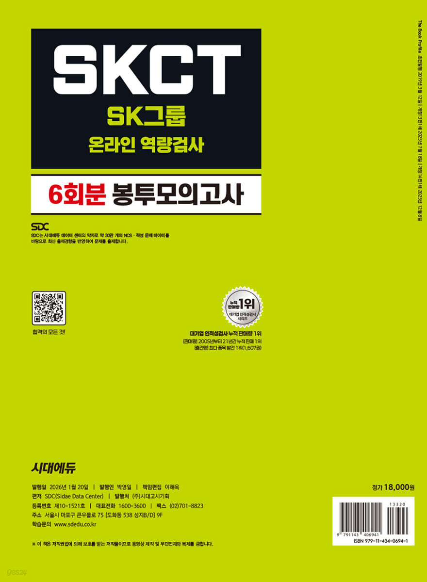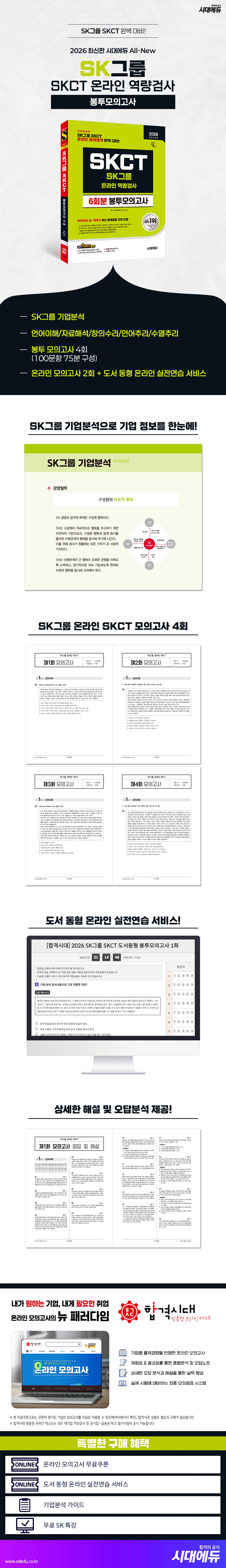 계열사에 따라 온라인 또는 오프라인으로 시행되던 SKCT는 2023년 하반기부터 전면 온라인으로 시행되고 있다. 이에 따라 변경된 SKCT에 철저히 대비할 수 있도록 『2026 최신판 시대에듀 All-New SK그룹 SKCT 온라인 역량검사 봉투모의고사』를 출간하였다. 본서는 4회분의 모의고사와 온라인 모의고사 2회분을 제공한다. 또한 도서 동형 온라인 실전연습 서비스로 실전처럼 연습할 수 있도록 하였다. 문제 풀이가 끝난 후에는 상세한 해설을 통해 오답을 짚어볼 수 있게 하여 최종 점검을 할 수 있도록 하였다. 본서가 SK그룹에 입사하고자 하는 모든 수험생에게 좋은 길잡이가 되기를 바란다.