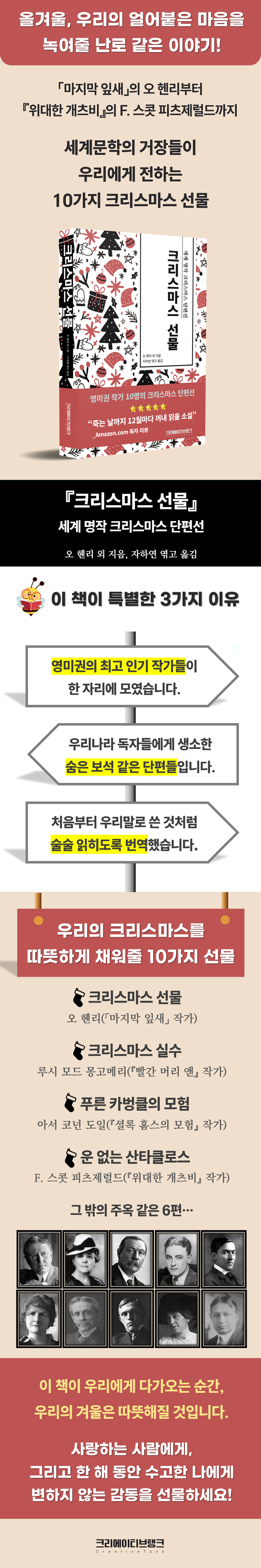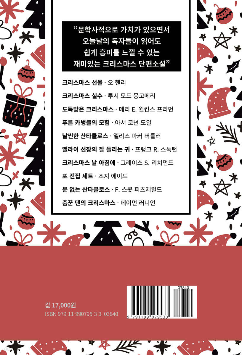 크리스마스 선물 · 오 헨리 크리스마스 실수 · 루시 모드 몽고메리 도둑맞은 크리스마스 · 메리 E. 윌킨스 프리먼 푸른 카벙클의 모험 · 아서 코넌 도일 날씬한 산타클로스 · 엘리스 파커 버틀러 엘라이 선장의 잘 들리는 귀 · 프랭크 R. 스톡턴 크리스마스 날 아침에 · 그레이스 S. 리치먼드 포 전집 세트 · 조지 에이드 운 없는 산타클로스 · F. 스콧 피츠제럴드 춤꾼 댄의 크리스마스 · 데이먼 러니언 작품 해설 |