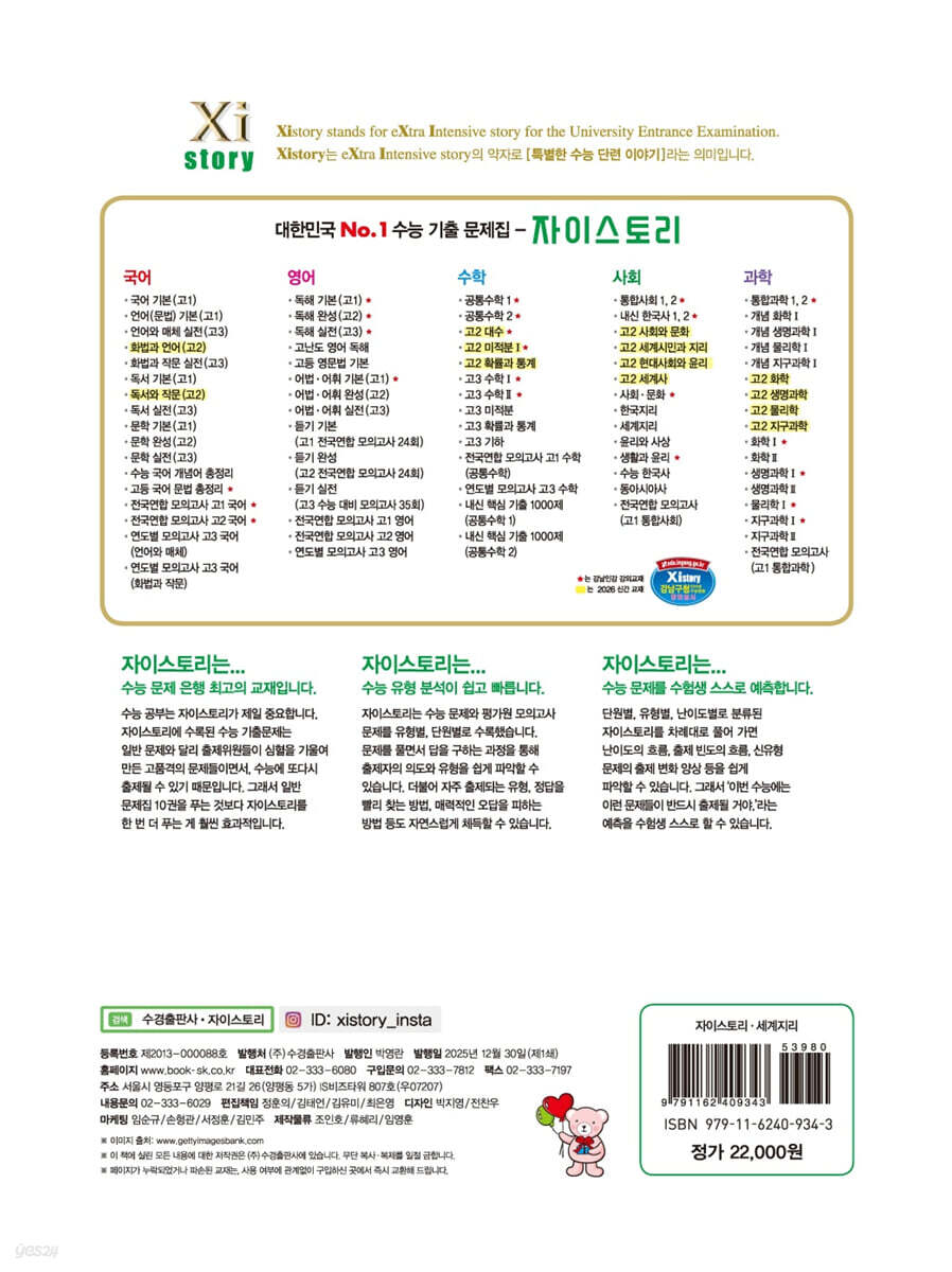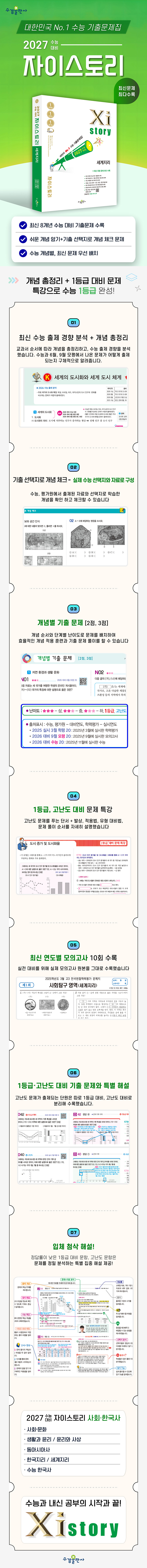 A 세계화와 지역화, 세계의 지역 구분 B 지리 정보와 공간 인식 Ⅱ 세계의 자연환경과 인간 생활 C 세계 기후 구분과 열대 기후 D 온대 기후 환경 E 건조 기후 환경과 지형 F 냉대 및 한대 기후 환경과 지형 G 세계의 주요 대지형 H 화산, 카르스트, 해안 지형 Ⅲ 세계의 인문 환경과 인문 경관 I 주요 종교의 전파와 종교 경관 J 세계 인구 변천과 인구 이주 K 세계의 도시화와 세계 도시 체계 L 주요 식량 자원과 국제 이동 M 주요 에너지 자원과 국제 이동 Ⅳ 몬순 아시아와 오세아니아 N 몬순 아시아와 오세아니아 Ⅴ 건조 아시아와 북부 아프리카 O 건조 아시아와 북부 아프리카 Ⅵ 유럽과 북부 아메리카 P 공업 지역의 형성과 변화 Q 현대 도시의 내부 구조~지역의 통합과 분리 운동 Ⅶ 사하라 이남 아프리카와 중·남부 아메리카 R 도시화와 도시 구조의 특징 S 다양한 지역 분쟁과 자원 개발 과제 Ⅷ 평화와 공존의 세계 T 경제 세계화와 경제 블록의 형성 U 지구적 환경 문제에 대한 국제 협력과 지구촌의 노력 ★ 최신 연도별 모의고사 10회 1회 : 2025 실시 3월 학력평가 2회 : 2025 실시 5월 학력평가 3회 : 2025 대비 6월 모의평가 4회 : 2026 대비 6월 모의평가 5회 : 2025 실시 7월 학력평가 6회 : 2025 대비 9월 모의평가 7회 : 2026 대비 9월 모의평가 8회 : 2025 실시 10월 학력평가 9회 : 2025 대비 대학수학능력시험 10회 : 2026 대비 대학수학능력시험 |