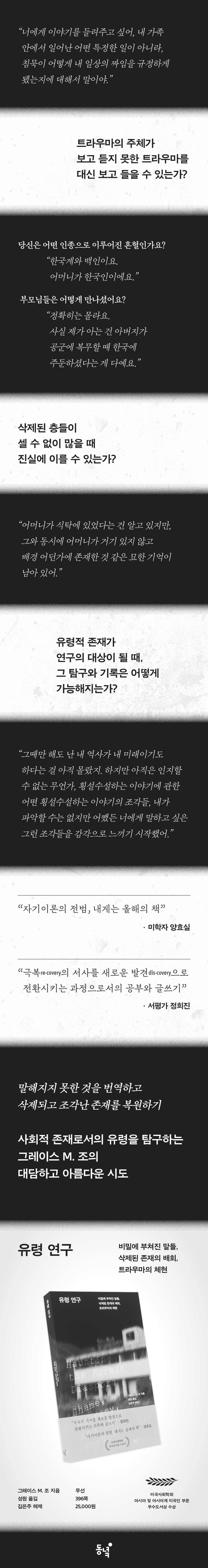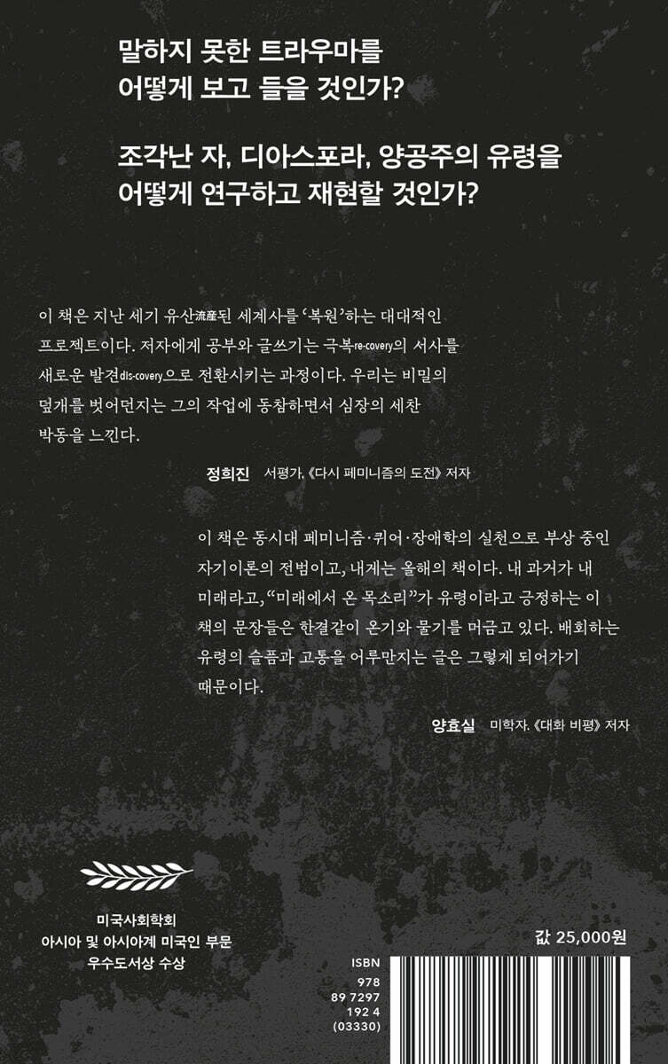 이 놀라운 책은 어떤 범주에도 가둘 수 없다. 저자는 한국의 분단과 디아스포라에 드리운 부정된 혈연과 숨겨진 슬픔의 응축된 역사를 소환한다. 이 빛나는 디아스포라적 비전은 유령의 트라우마적 지형 위에서 펼쳐지며, 그들의 침묵의 경로를 따라, 인정받지 못한 군사적·정치적 폭력의 역사뿐 아니라 사회과학 분야에서 이루어지는 일상적인 지식 생산의 과정까지도 함께 연루시킨다. - 데이비드 L. 엥 (펜실베이니아대학교 영문학 교수)