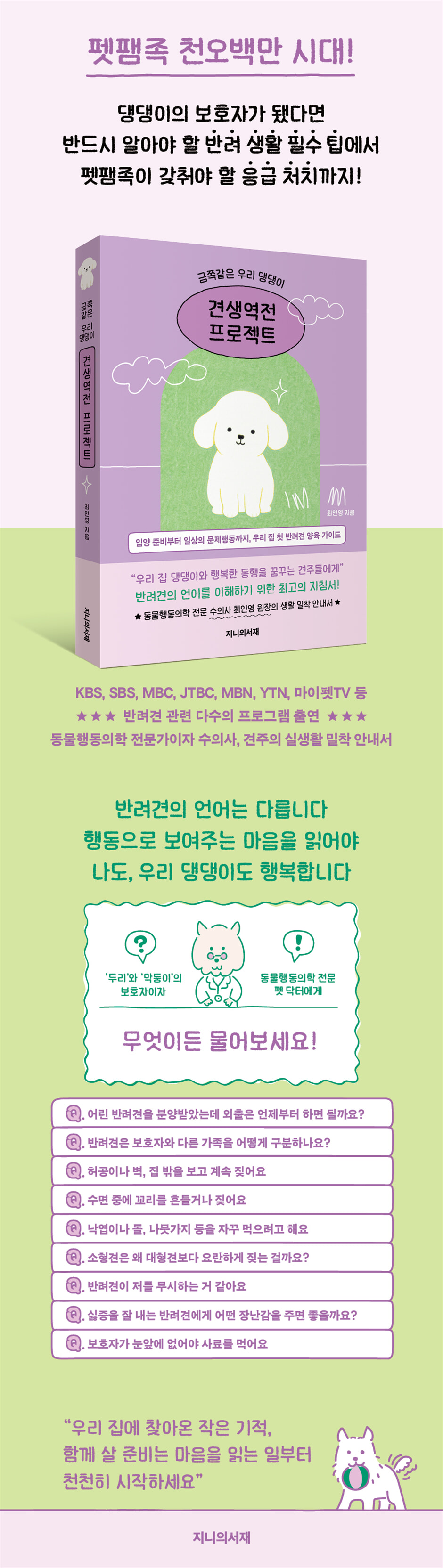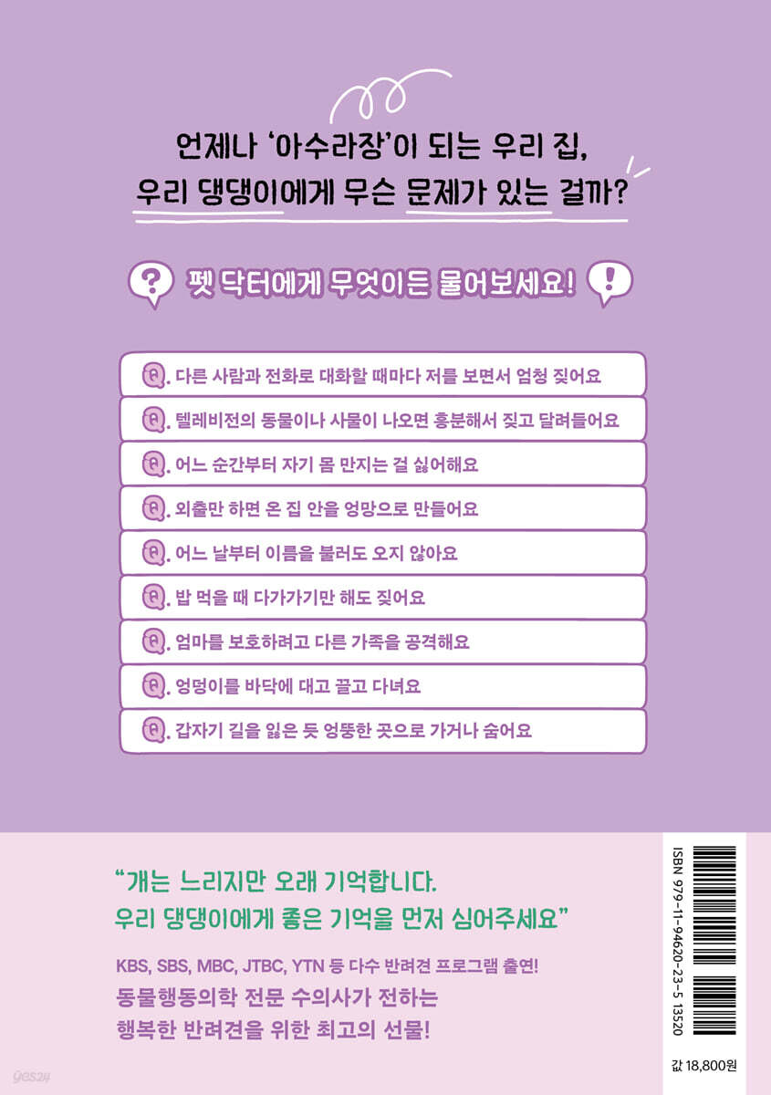 1부. 우리 집에 작은 기적이 왔다 Part 1. 가족이 되기로 한 날 · 나는 이제 누군가의 ‘보호자’입니다 · 작은 가족을 맞이할 준비물 리스트 · 편안하고 즐거운 생활을 위한 필수 용품 Part 2. 함께 살 준비, 마음부터 천천히 · 처음 며칠, 이렇게 도와주세요 · 함께 살기 위한 약속들 · 예방접종 시기는 중요합니다 · 사랑으로 지켜야 할 요주의 식품 리스트 · 따로 또 같이 놀아요 2부. 너의 행동이 말해주는 것들 Part 1. 펫 닥터에게 배우는 건강한 반려 생활 반려견과의 첫 만남, 무엇이 궁금한가요? Q. 어린 반려견을 분양받았는데 외출은 언제부터 하면 될까요? Q. 가만히 앉아 있지 못하고 산만하게 우왕좌왕해요 Q. 보호자가 눈앞에 없으면 과하게 울어요 Q. 꼬리는 기분 좋을 때만 흔드나요? Q. 개의 지능은 어느 정도일까요? Q. 반려견은 보호자와 다른 가족을 어떻게 구분하나요? Q. 왜 사람의 얼굴을 자꾸 핥을까요? Q. 허공이나 벽, 집 밖을 보고 계속 짖어요 Q. 수면 중에 꼬리를 흔들거나 짖어요 Q. 낙엽이나 돌, 나뭇가지 등을 자꾸 먹으려고 해요 Q. 옷 입기를 좋아하게 하려면 어떻게 해야 하나요? Q. 소형견은 왜 대형견보다 요란하게 짖는 걸까요? Q. 반려견이 아픈지 건강한지 어떻게 알 수 있나요? Q. 개와 고양이를 같이 키워도 되나요? Q. 반려견이 집에 혼자 있으면 스트레스를 받지 않을까요? Q. 상처 부위를 계속 핥는데, 염증이 생기지 않을까요? 한 걸음씩, 함께 배우는 반려 생활 Q. 문제행동을 할 때 어떻게 교육해야 하나요? Q. 반려견이 저를 무시하는 거 같아요 Q. 혼을 내거나 칭찬할 때 어떤 방법이 효과적인가요? Q. 간식은 어떻게 줘야 할까요? Q. 훈련할 때 꼭 간식이 필요한가요? Q. 어린 반려견과 얼마나 놀아주는 게 좋을까요? Q. 반려견이 놀아달라고 바지나 양말을 물고 늘어져요 Q. 싫증을 잘 내는 반려견에게 어떤 장난감을 주면 좋을까요? Q. 실내든 실외든 계속 땅을 파는 행동을 해요 Q. 특정 물건에 대한 집착이 강해요 Q. 과도하게 달려들어요 Q. 저와 함께 자려고 짖어요 Q. 중성화를 했는데도 ‘붕가붕가’를 해요 편안한 식사, 행복한 관계의 시작 Q. 사료는 얼마나 주는 게 좋을까요? Q. 사료통만 봐도 흥분해요 Q. 똑같은 사료만 먹으면 질리지 않을까요? Q. 식사할 때 옆에서 자꾸 달라고 보채요 Q. 보호자가 눈앞에 없어야 사료를 먹어요 Q. 밥 먹을 때 다가가기만 해도 짖어요 Q. 밖에 나오면 아무것도 먹지 않아요 조금 더 기다려주세요, 배변은 연습 중이에요 Q. 첫 배변 훈련은 어떻게 할까요? Q. 실수해서 혼을 냈더니 숨어서 배변·배뇨를 해요 Q. 반려견이 똥을 먹어요 Q. 크레이트 안에만 들어가면 배설을 해요 Q. 패드가 아닌 다른 곳에 배변·배뇨를 해요 Q. 배변 패드에서 먹고 자고 말썽을 피워요 좋은 보호자는 좋은 산책에서 시작된다 Q. 산책이 처음입니다, 어떻게 시켜줘야 할까요? Q. 반려견에게 산책이 왜 좋을까요? Q. 산책에 정해진 시간이 있나요? Q. 산책을 싫어하는데 꼭 해야 하나요? Q. 산책하러 나가면 줄이 끊어질 정도로 달려요 Q. 리드 줄을 무서워해요 Q. 산책할 때 다른 반려견을 보면 덤벼들고 짖어요 Q. 산책을 나가도 걸으려고 하지 않아요 Q. 산책할 때 다른 사람에게 달려들어요 Q. 산책하거나 집 안에서 마킹 행동을 하는데, 교정이 되나요? 나는 ‘이렇게’ 말하고 싶었어요 Q. 초인종 소리가 날 때마다 심하게 짖어요 Q. 소방차나 응급차가 지나가면 갑자기 “워우~!” 하며 울부짖어요 Q. 다른 사람과 전화로 대화할 때마다 저를 보면서 엄청 짖어요 Q. 울타리에 익숙하게 하고 싶어요 Q. 낯선 반려견만 보면 무조건 으르렁대고 공격성을 보여요 Q. 텔레비전의 동물이나 사물이 나오면 흥분해서 짖고 달려들어요 Q. 어느 순간부터 자기 몸 만지는 걸 싫어해요 Q. 외출만 하면 온 집 안을 엉망으로 만들어요 Q. 쓰다듬을 때마다 손가락을 자꾸 물어요 Q. 집 안의 모든 물건을 물어뜯어요 Q. 어느 날부터 이름을 불러도 오지 않아요 Q. 엄마를 보호하려고 다른 가족을 공격해요 Q. 하품도 자주 하고 혀를 내민 채 헥헥거려요 함께하는 삶, ‘책임’에서 시작돼요 Q. 크레이트에 익숙하게 하려면 어떻게 해야 하나요? Q. 흥분하거나 불안할 때 제자리에서 빙빙 돌거나 불러도 반응이 없어요 Q. 새로운 물건이나 장소를 두려워해요 Q. 차 타기를 거부해요 Q. 번개나 천둥소리, 청소기 소리에 너무 예민해요 Q. 목욕을 싫어하는 반려견은 어떻게 씻겨야 할까요? Q. 항문낭 짜는 걸 싫어해요 Q. 양치질을 싫어해요 Q. 양치질은 어떻게 해야 할까요? Q. 엉덩이를 바닥에 대고 끌고 다녀요 Q. 갑자기 길을 잃은 듯 엉뚱한 곳으로 가거나 숨어요 Q. 계속 발가락 사이를 핥는데 왜 그럴까요? Part 2. 응급상황! 반려견을 지키는 첫 5분 · 위급한 순간, 보호자의 손이 생명을 살린다 · 반려견 인공호흡과 심장 마사지 · 골절·탈구됐을 때 · 화상을 입었을 때 · 전기에 감전됐을 때 · 열사병일 때 · 경련, 발작을 일으킬 때 · 이물질을 섭취했을 때 · 물에 빠졌을 때 에필로그_ 너와 나의 배움으로 이루어진 사회화 교육 |