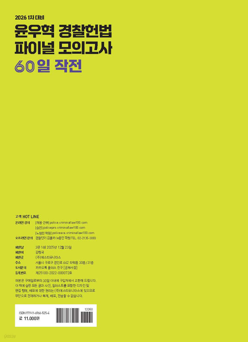1. 120개 핵심문항으로 끝내는 경찰헌법! 최근 경찰공무원 헌법 시험의 출제경향과 출제빈도를 철저히 조사·분석한 결과를 바탕으로 시험에 나온, 그리고 시험에 반드시 나올 핵심쟁점들과 지문들만 엄선하여 120개의 객관식 문항을 4회의 진도별 모의고사와 2회의 반범위 모의고사 형식으로 담았습니다. 2. 집중 마스터를 위한 다양한 유형 접근 실전에서 ‘알고 있는 문제’를 틀리는 이유는 제한된 시간 안에 시험을 마쳐야 하기 때문입니다. 진도별 모의고사를 통해 해당 쟁점과 주제에 대해 출제 가능한 모든 유형의 문제를 집중적으로 훈련함으로써 보다 완벽하게 실전에 대비할 수 있습니다. 3. 최신 개정법령 및 판례 완벽 반영 헌법 과목을 준비함에 있어서 그 특성상 개정법령에 민감해야 하고, 시험 직전까지 최신 판례의 쟁점을 파악해야 합니다. 수험생이 이러한 점을 놓치기 쉽다는 점을 고려하여 최신 개정법령을 완벽 반영하였으며, 최신 판례 지문은 쟁점을 하나하나 분석하여 응용문제에도 적용할 수 있도록 하였습니다. 4. 중요 지문들의 반복으로 집중적인 헌법 내공 강화 단순히 문제를 푸는 것은 단편적인 지식 확인에 그치기 쉽습니다. 본 교재는 반복의 연속인 헌법 시험의 특성을 반영하여 자주 눈에 띄는 중요 지문들은 더욱 반복함으로써 집중적인 학습이 가능하도록 구성하였습니다. |