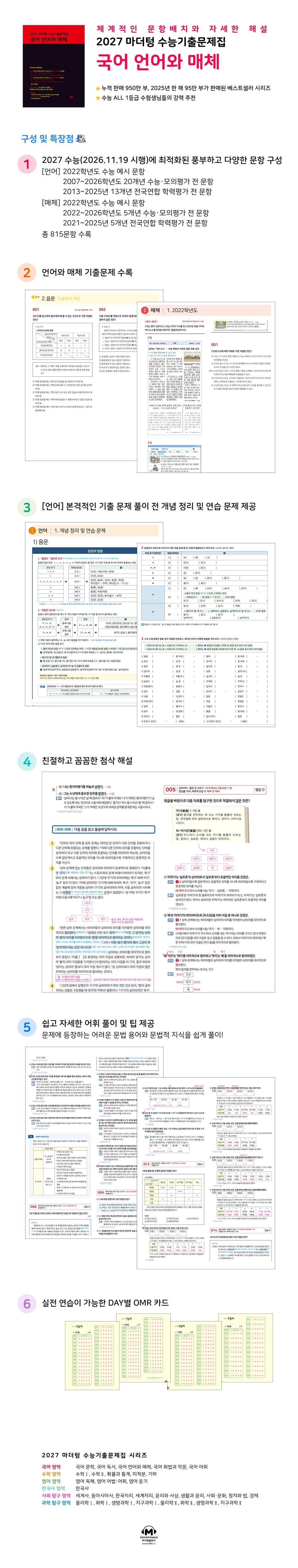 1. 개념 정리 및 연습 문제 1) 음운 2) 단어 3) 문장 4) 단어의 의미 5) 어문 규정 6) 국어사 2. 음운 1) 음운의 개념 2) 음운의 변동 3. 단어 1) 형태소와 단어 2) 단어의 형성 3) 품사 4. 문장 1) 문장 성분 2) 문장의 짜임 3) 문법 요소 4) 정확한 문장 표현 5. 의미와 담화 1) 단어의 의미 관계 2) 사전 활용 3) 단어의 의미와 용법 4) 담화 6. 어문 규정 1) 표준어와 표준 발음법 2) 한글 맞춤법 7. 국어사 8. 지문형 문항 1) 현대 국어의 이해 2) 중세 국어와 현대 국어의 비교 및 이해 Ⅱ. 매체 1. 2022학년도 2. 2023학년도 3. 2024학년도 4. 2025학년도 5. 2026학년도 [미니모의고사] 1회 미니모의고사 2회 미니모의고사 |