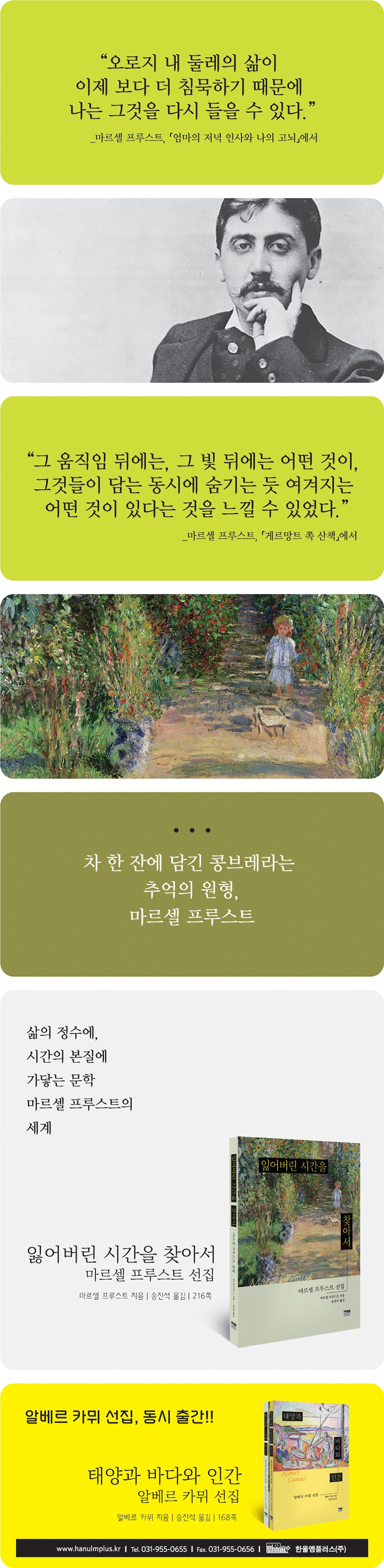 시간을 아우르는, 인상과 느낌에 관한 소설 “엄마와 단둘이 되자마자 터지고 만 오열을 나는 매우 잘 지각하기 시작했다. 사실 이 오열은 결코 그친 적이 없다. 오로지 내 둘레의 삶이 이제 보다 더 침묵하기 때문에 나는 그것을 다시 들을 수 있다. 낮 동안 도시의 소음에 뒤덮여 멎어버린 줄로만 알았으나 저녁의 고요 속에서 다시 울리기 시작하는 수도원의 종처럼”_「엄마의 저녁 인사와 나의 고뇌」에서 어린 시절의 인상들은 어떻게 문득 떠올라 삶 전체를 펼쳐 보이는 걸까? 엄마의 저녁 인사를 받지 못할까봐 불안해하던 어린 마르셀의 이야기에서 시작하는 이 책은, 시간이 지나 마르셀이 콩브레에서 지내던 어린 시절을 회상하는 「마들렌 에피소드」로 이어진다. 마르셀은 엄마가 건넨 마들렌 한 조각이 무르고 있는 숟가락에 담긴 차를 마시는데, 그때 문득 추억이 나타난다. 이 맛은 일요일 아침 콩브레에서 레오니 아주머니 방에 아침 인사를 하러 가면 아주머니가 마시던 차에 담갔다가 꺼내어 주던 작은 마들렌 조각의 맛이었다. 다음 순간, 그의 어린 시절이 녹아 있는 콩브레 일대가 펼쳐진다. 레오니 아주머니가 준 보리수차에 담근 마들렌 조각의 맛을 알아보자마자 즉각 아주머니의 방이 있는 길에 면한 오래된 회색 집이, 그리고 집과 더불어 아침에서 저녁에 이르는 온갖 날씨의 도시의 모습, 점심 먹기 전에 자신을 보내곤 하던 광장, 장을 보러 가던 골목들, 날씨가 좋을 때 걷던 길들이 나타난다. 인상과 느낌이 시간을 넘어 우리에게 온다는 것은 무엇을 의미하는가? 또한 그것은 어떤 작업을 필요로 하는가? 예술 작품을 만들면서, 곧 문학 작품을 쓰면서라고 마르셀은 이 책을 통해 말한다. 왜냐하면 오로지 예술만이 “우리에게 가장 귀하되 대개는 영영 미지의 상태로 남는 것, 곧 우리의 진정한 삶, 다시 말해 우리가 느낀 그대로의 실재, 하지만 우리가 생각하는 것과 그토록 달라서 어떤 우연이 진정한 추억을 가져다주면 우리가 행복으로 가득 차게 될 그런 실재”를 발견하게 해주기 때문이다. 삶의 정수에, 시간의 본질에 가닿는 문학 마르셀 프루스트의 세계 『잃어버린 시간을 찾아서』는 모두 일곱 권으로 이루어진 대하소설이다. 소설의 화자이자 주인공인 마르셀이 작품을 ‘대성당’에 비유한 것은 너무나도 잘 알려진 이야기다. 이 비유는 장대한 분량에 복합적 구성을 갖고 있는 소설의 양상을 잘 보여준다는 점에서 매우 적절한 비유다. 그것은 또한 작품을 옹호해 주는 비유이기도 하다. 방대한 분량의 『잃어버린 시간을 찾아서』를 가려 뽑은 이 선집에서 우리는 물질적 자극에 의해, 그로부터 촉발된 인상에 의해 무의지적 추억을 갖게 된 존재의 움직임을 주목할 필요가 있다. 분명한 것은 『잃어버린 시간을 찾아서』의 시간 탐색이 기억 저편으로 사라진 과거를 다시 소생시키려는 노력이 아니라는 점이다. 그것은 과거를 질료 삼아 진정한 삶, 본질적 시간을 창조하려는 작업이다. 시간의 바깥에서 “첨탑의 형태, 선들의 이동, 표면의 환한 빛을 확인하고 기억해 두면서 나는 내가 받은 인상을 완성할 수 없으리라는 것, 그 움직임 뒤에는, 그 빛 뒤에는 어떤 것이, 그것들이 담는 동시에 숨기는 듯 여겨지는 어떤 것이 있다는 것을 느낄 수 있었다”_「게르망트 쪽 산책」에서 “이때 내 안에서 그 느낌을 맛보고 있는 존재는 그 느낌이 예전의 날과 지금 현재 공통적으로 갖고 있는 것 안에서, 다시 말해 그 느낌이 갖고 있는 초시간적인 것 안에서 그 느낌을 맛보고 있었다. 그러니까 그 존재는 현재와 과거의 일치 가운데 하나를 통해, 자기가 살아낼 수 있고 또 사물의 본질을 향유할 수 있는 유일한 환경에 자리 잡을 수 있을 때에만, 다시 말해 시간의 바깥에 자리 잡을 수 있을 때에만 나타나는 존재였던 것이다”_「게르망트 마티네」에서 인상이 과거와 현재에 동시에 연결되며 바야흐로 시간으로부터 해방된다. 존재는 이제 시간에서 벗어나 초시간의 영역, 나아가 본질적 시간으로 돌입한다. 예로부터 인간은 다양한 방식으로 영원을 추구해 왔다. 시간의 굴레를 벗어나는 특별한 체험에서 출발하여 시간의 본질 또는 삶의 정수를 지성의 등가물, 곧 문학 작품으로 축조하는 일은 『잃어버린 시간을 찾아서』가 그 하염없는 페이지들을 통해 절실히 탐색하고 또 감동적으로 제시하는 위대한 영원의 형태로 여겨진다. 프랑스 문학의 정수를 가려 뽑은 마르셀 프루스트 선집과 알베르 카뮈 선집 동시 출간! 오늘 저녁 나에게로 되돌아오는 것이 어떤 어린 시절의 이미지라면, 내가 거기서 끌어낼 수 있는 사랑과 가난의 교훈을 어째서 받아들이지 않는단 말인가? 그 시간은 예와 아니오 사이의 틈 같은 것이므로, 나는 삶에 대한 희망이나 염오는 다른 시간들로 돌린다”_『태양과 바다와 인간: 알베르 카뮈 선집』에서 이 책의 주인공 마르셀처럼 되돌아오는 어린 시절의 이미지를 긍정하는 작가로, 알베르 카뮈가 있다. 『잃어버린 시간을 찾아서: 마르셀 프루스트 선집』과 함께 출간되는 『태양과 바다와 인간: 알베르 카뮈 선집』을 같은 맥락에서 읽을 수 있다. 한 인